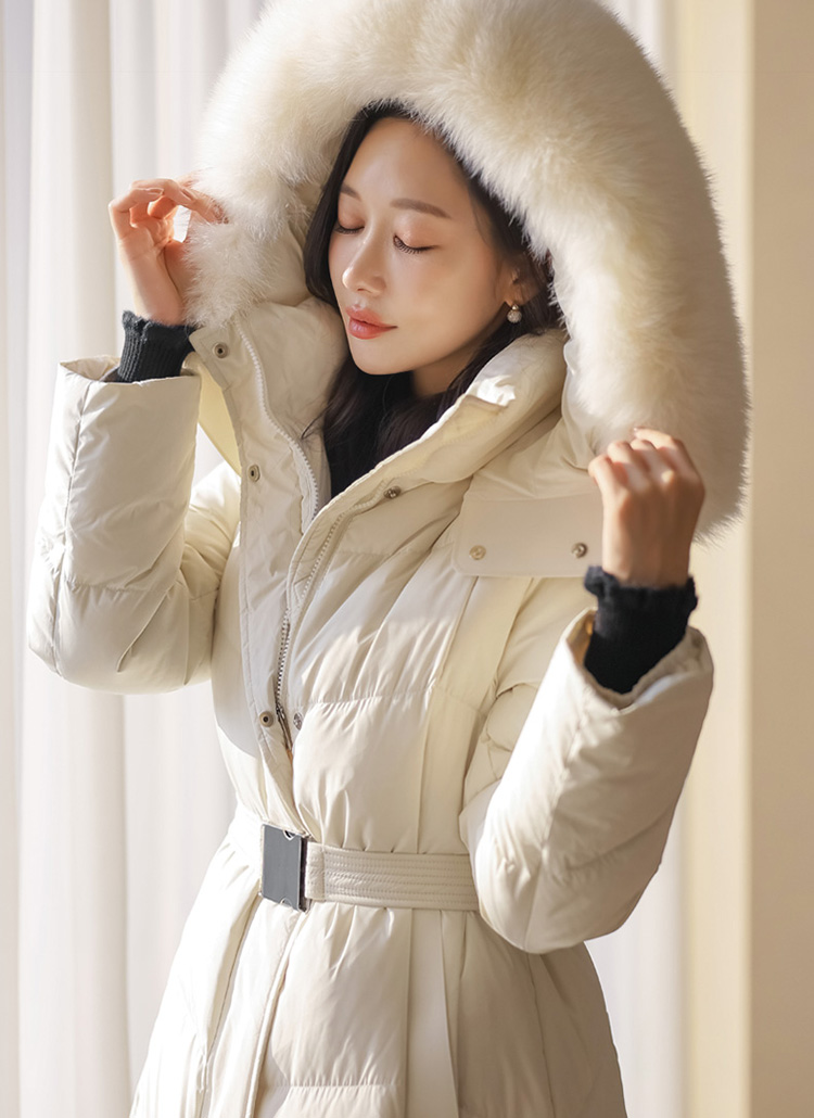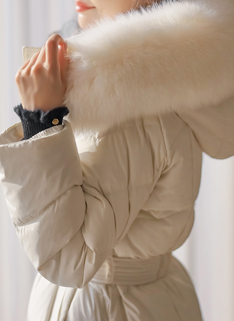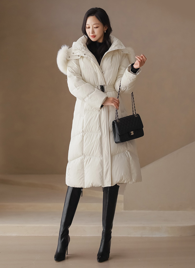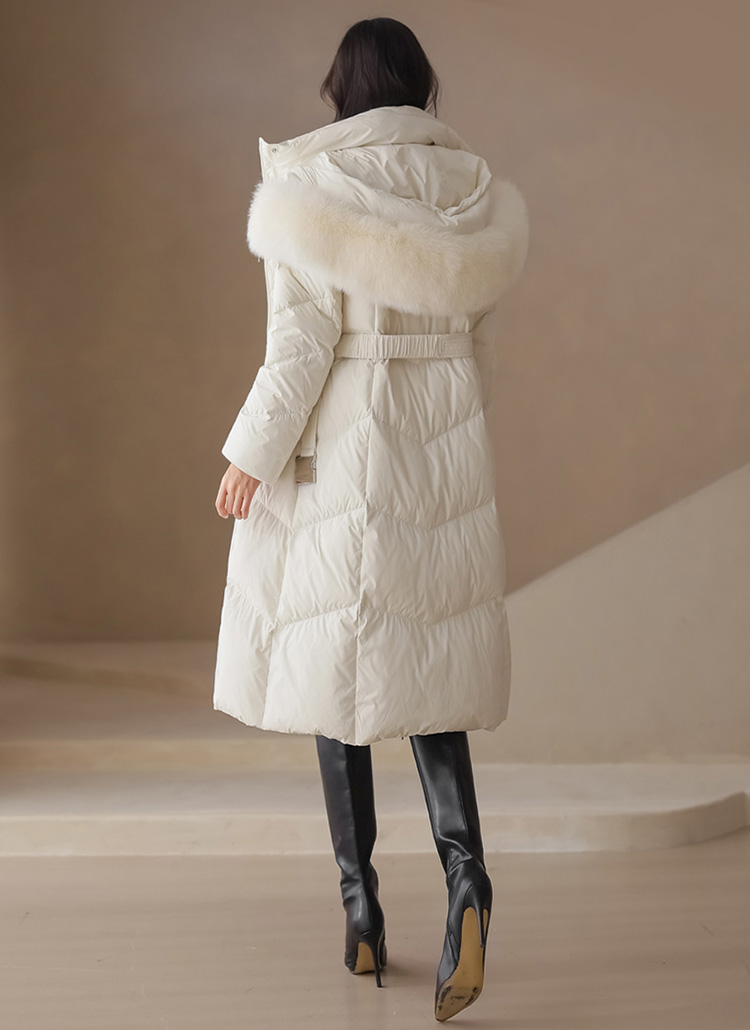 フォックスファーフード付き ベルテッドロングダウンコート jp43353