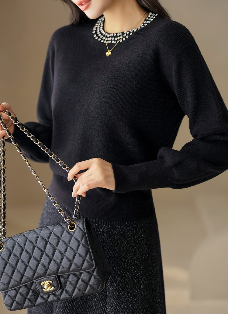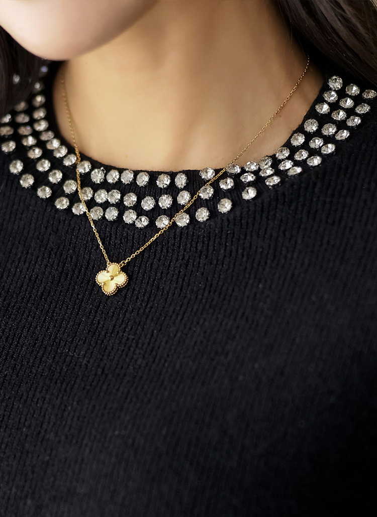 넥 라인을 따라 촘촘하게 장식된 3줄 쥬얼 디테일이