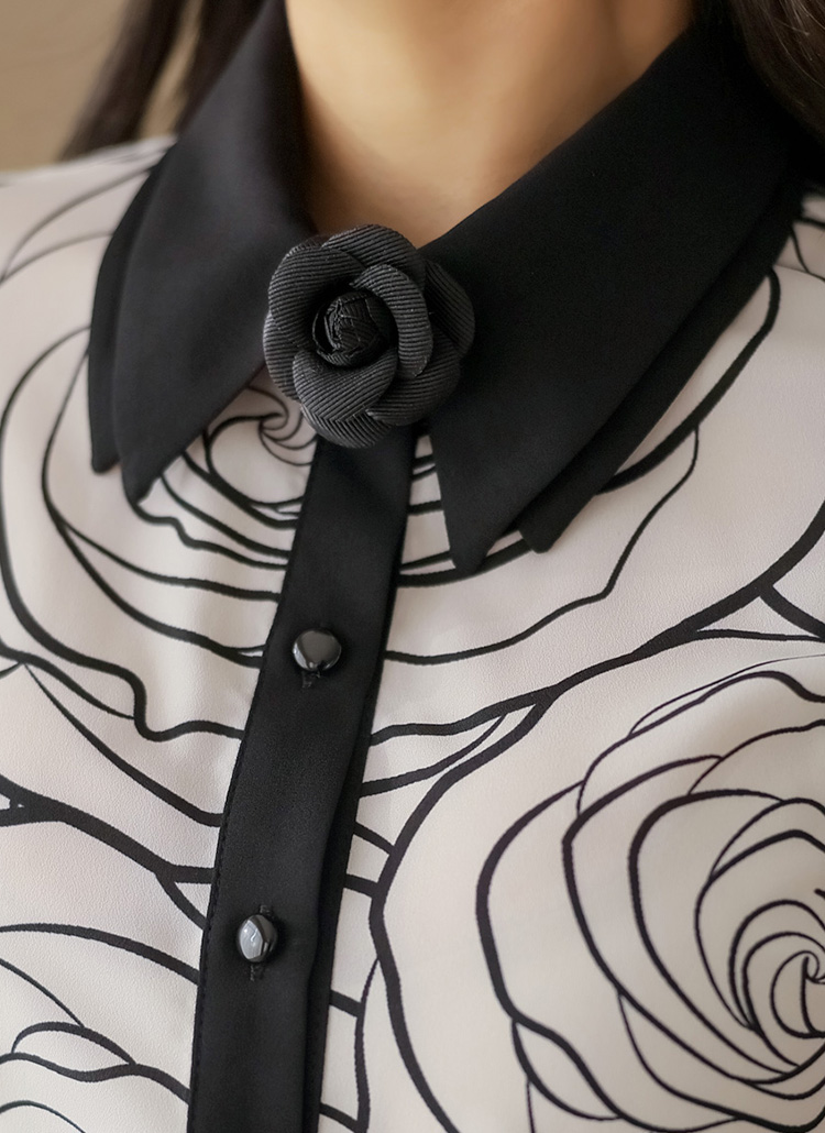 コサージュブローチ付きローズプリントバイカラーブラウス bl43407