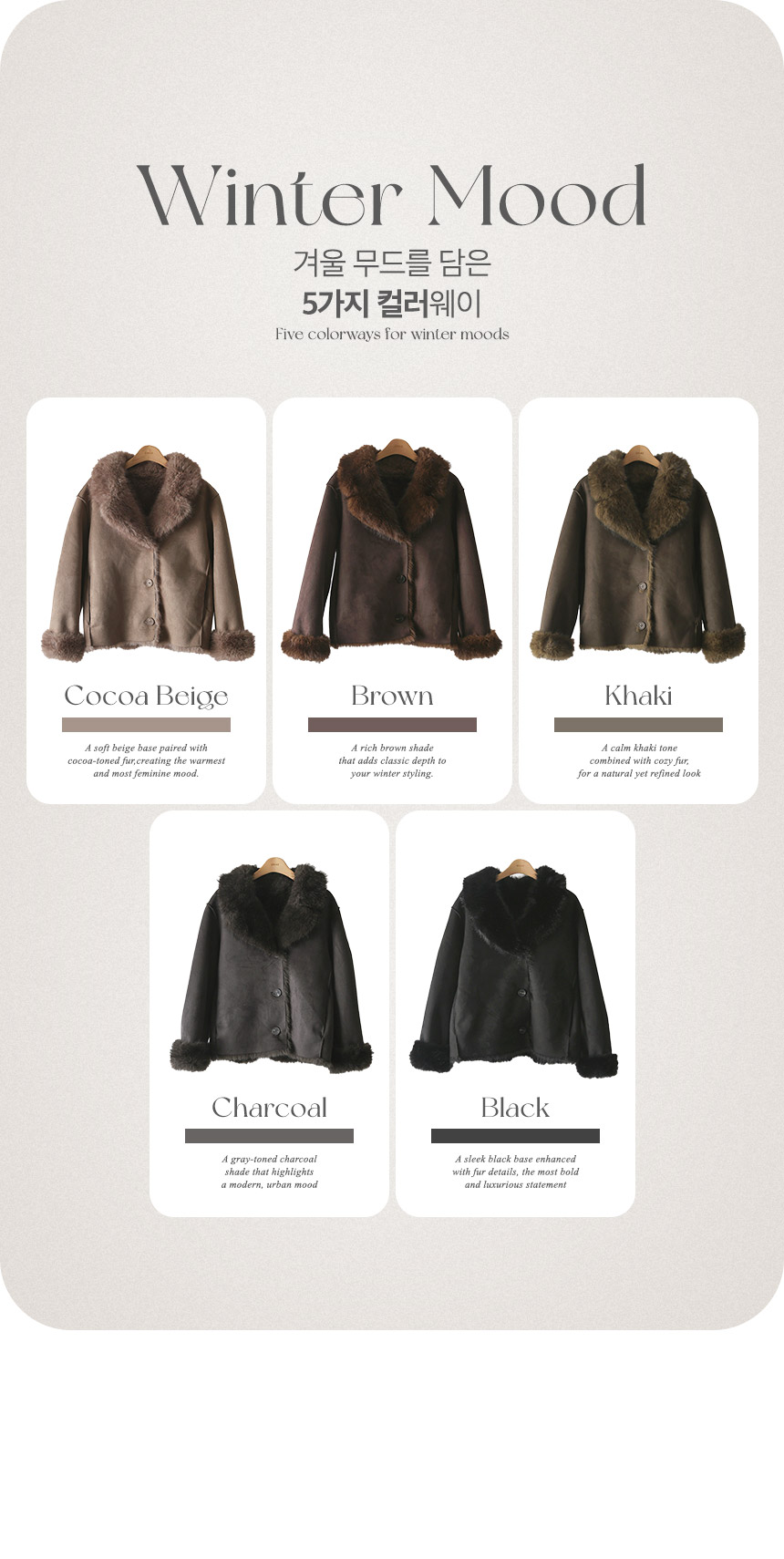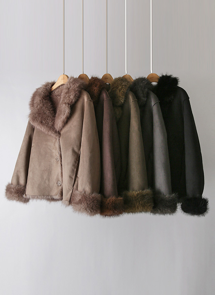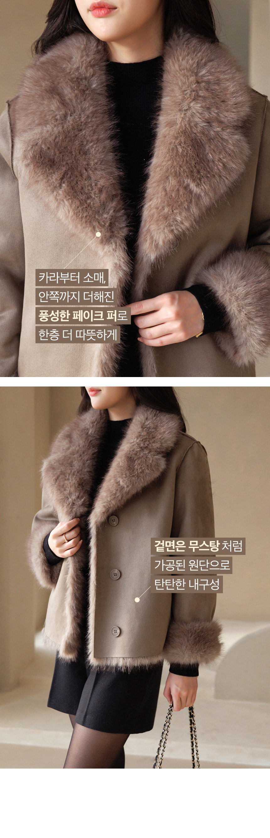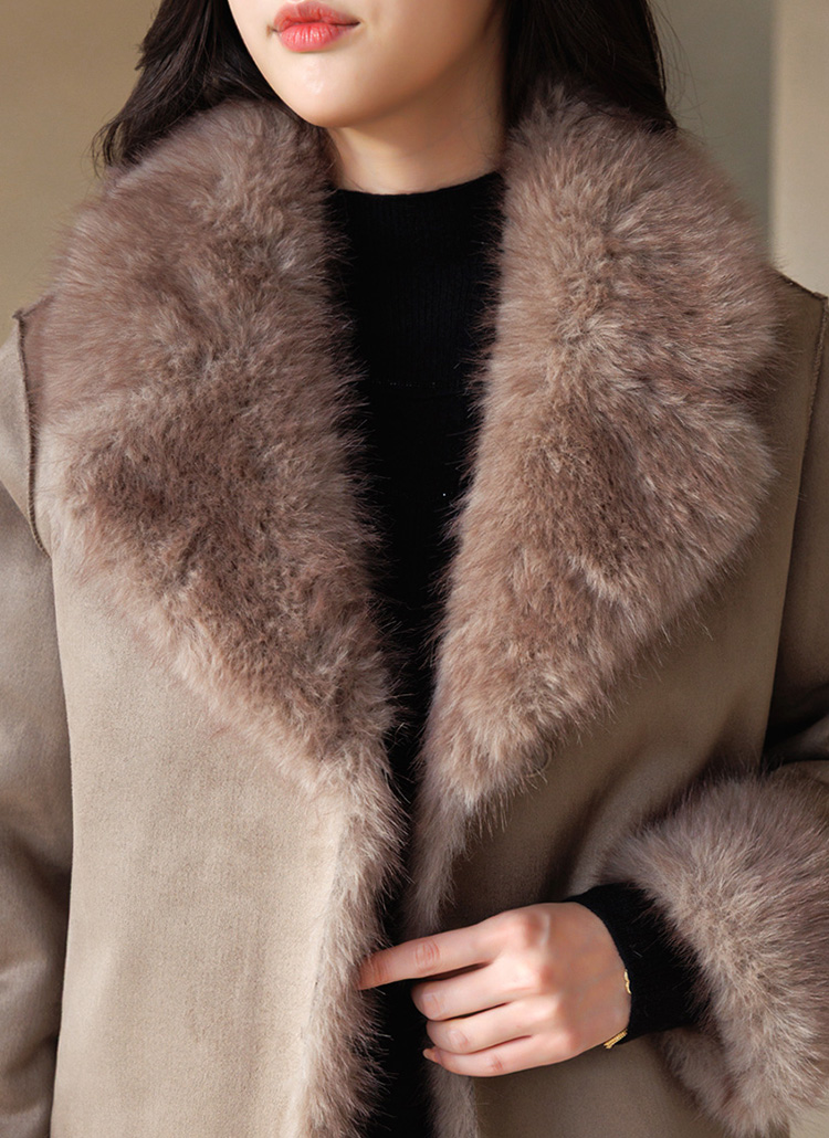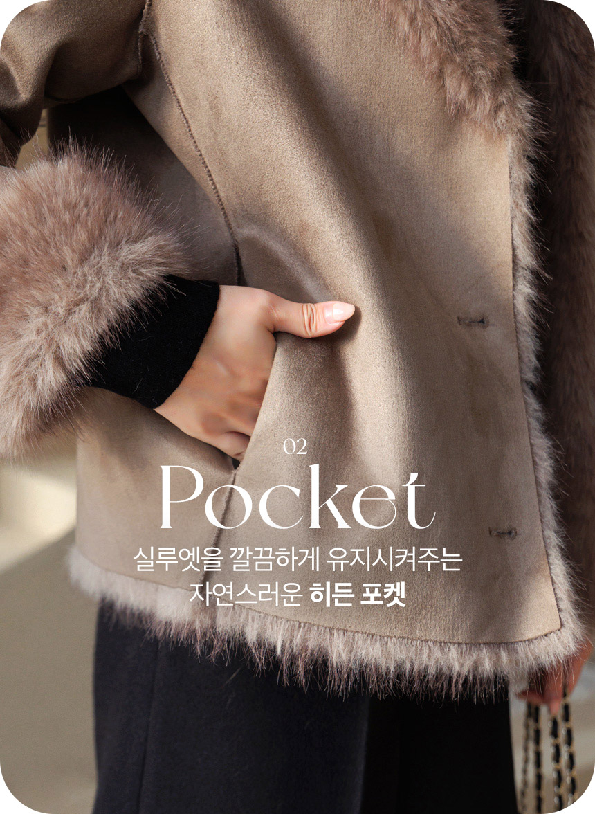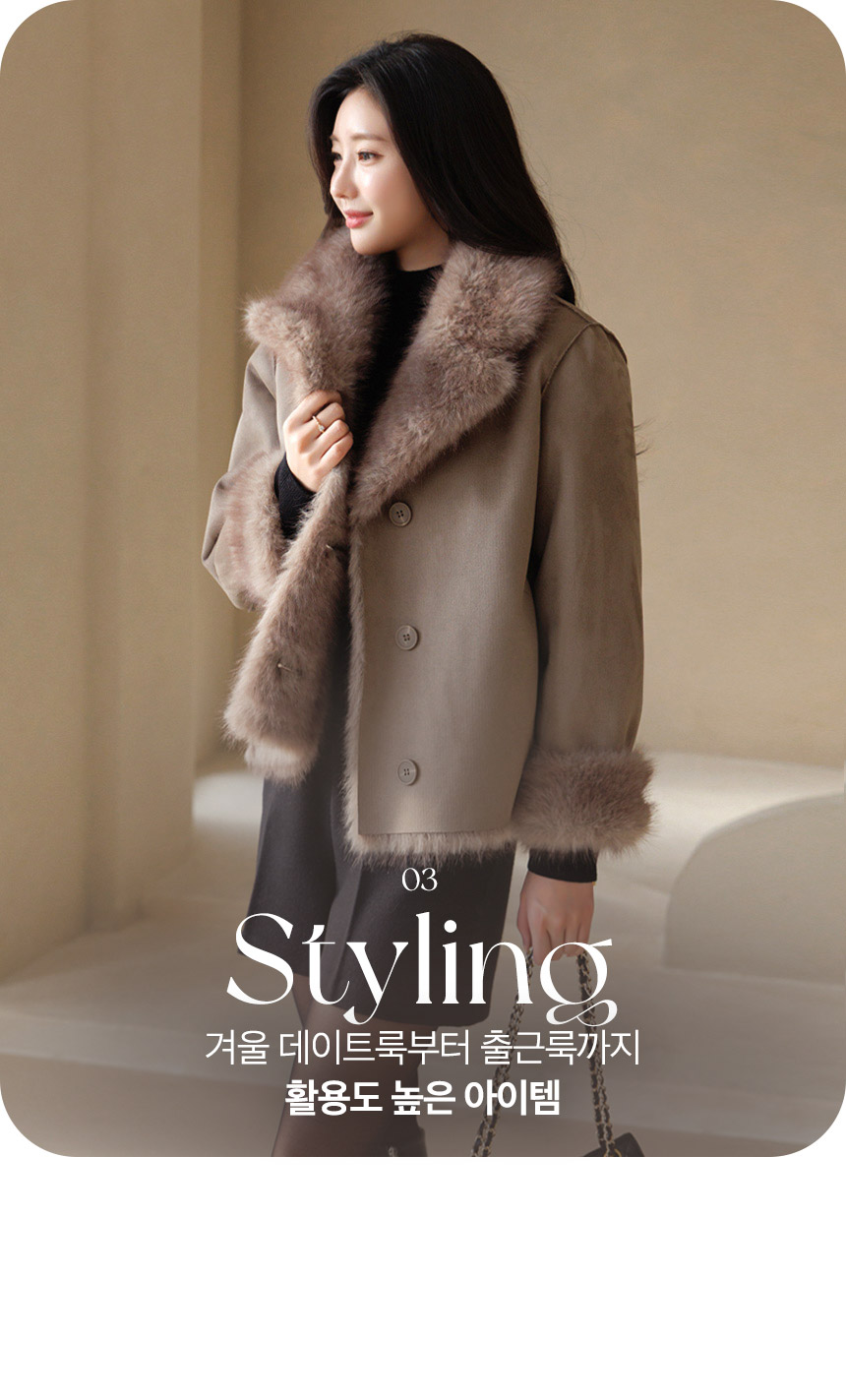 차분한 스웨이드 텍스쳐에 퍼 트리밍 디자인으로