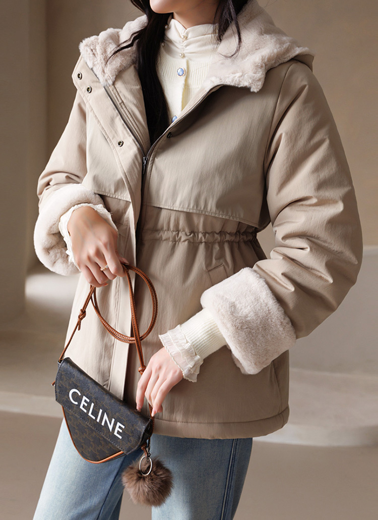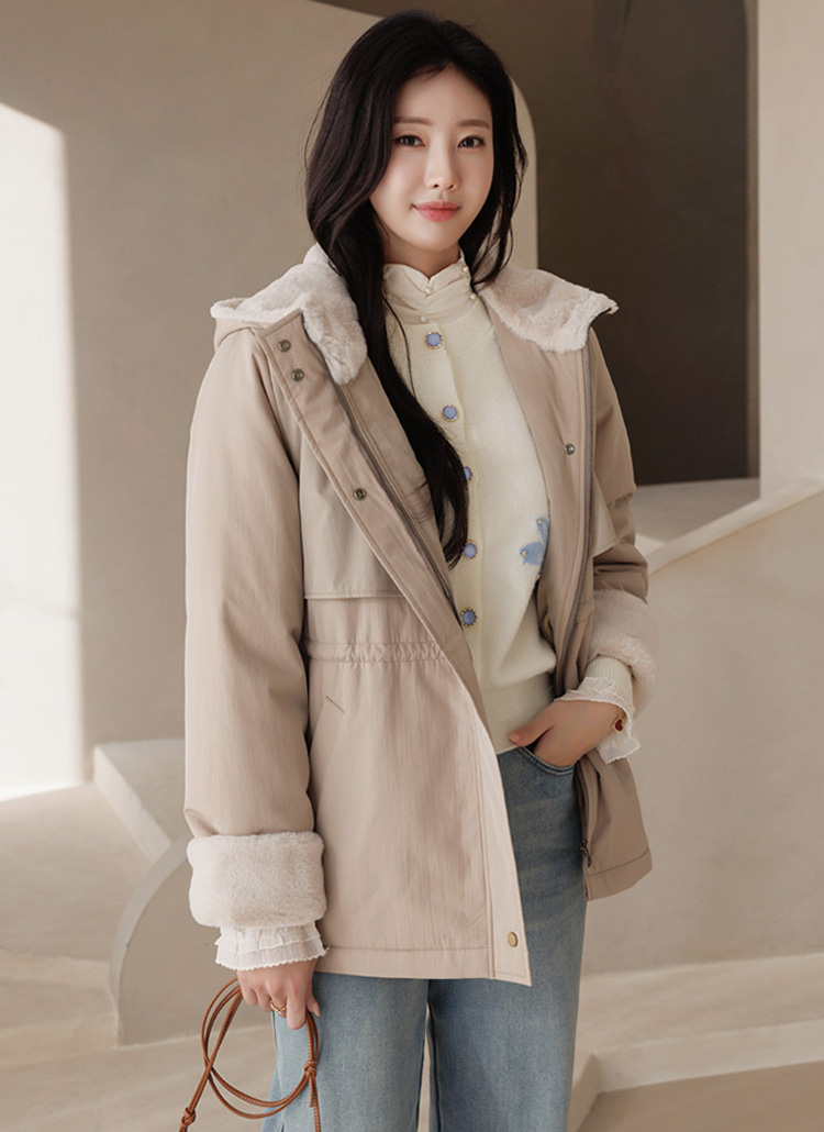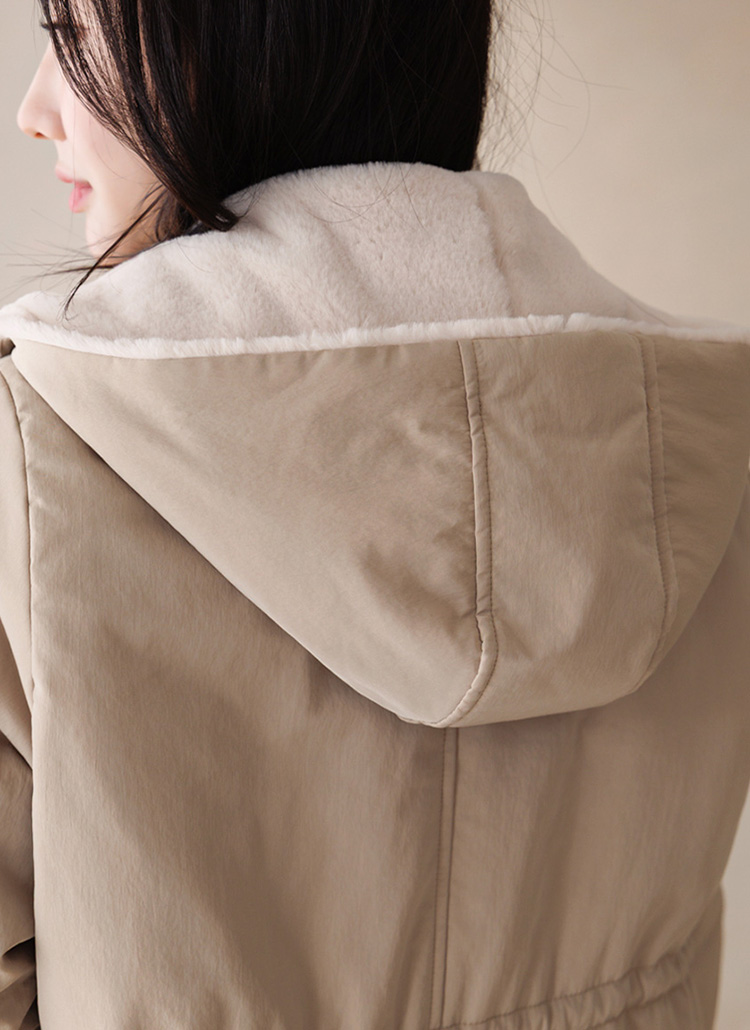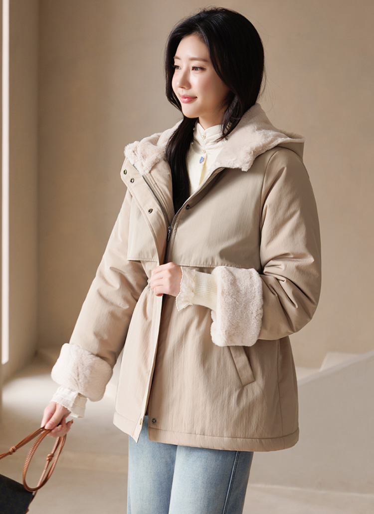 큼직한 후드 안쪽까지 퍼가 촘촘히 채워져 있어 얼굴을 부드럽게 감싸주고