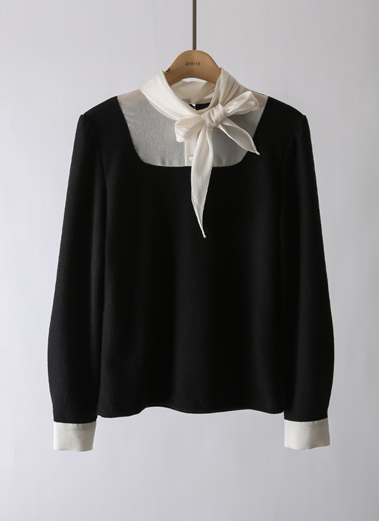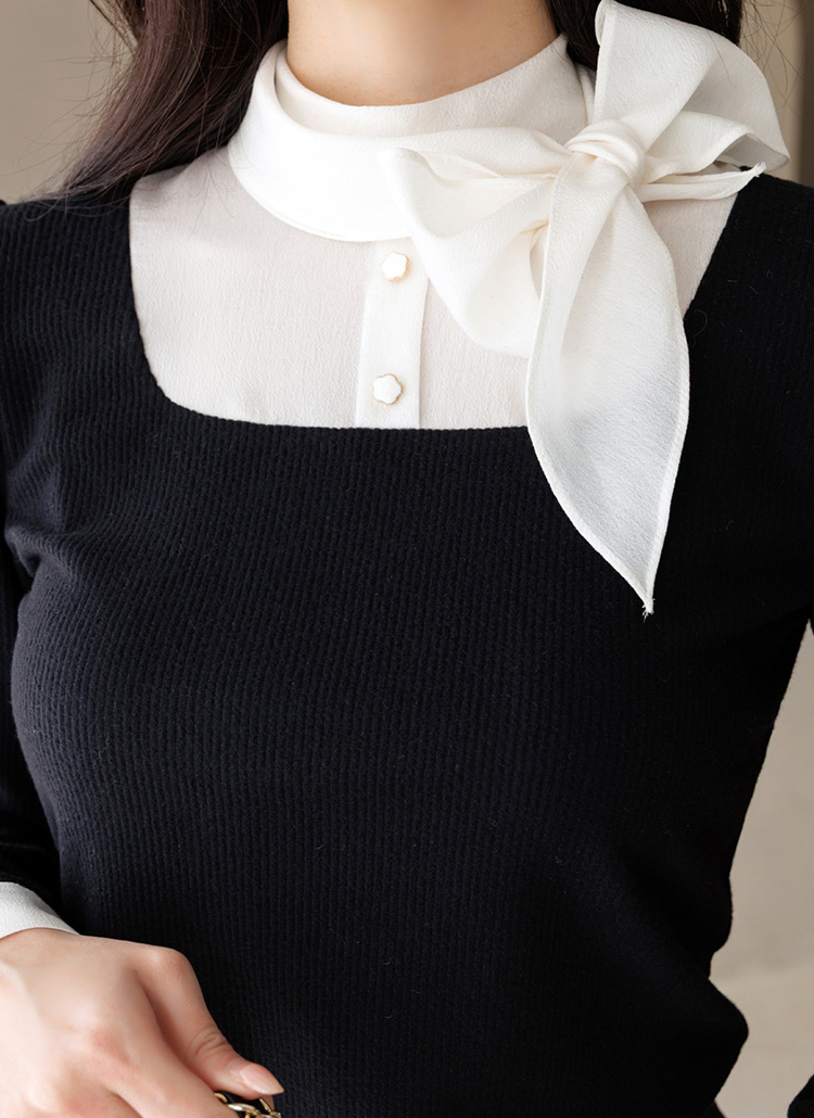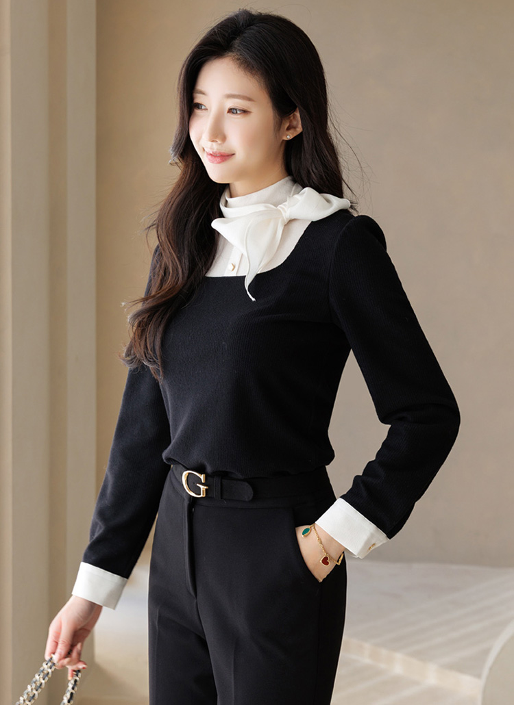 목선과 소매 부분을 블라우스 소재로 섬세하게 배색해주어