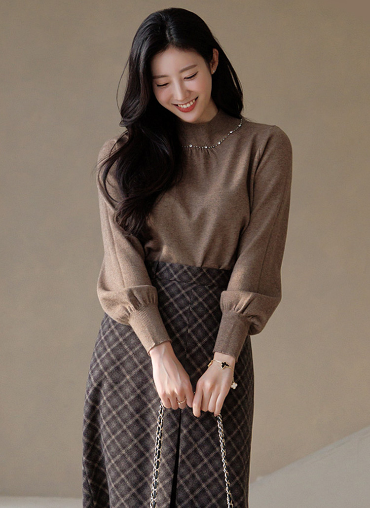 우아한 디테일로 시선을 사로잡는 퍼프소매 반하이넥 니트에요