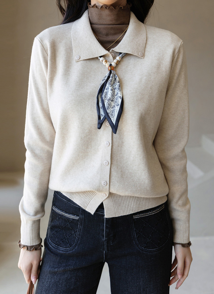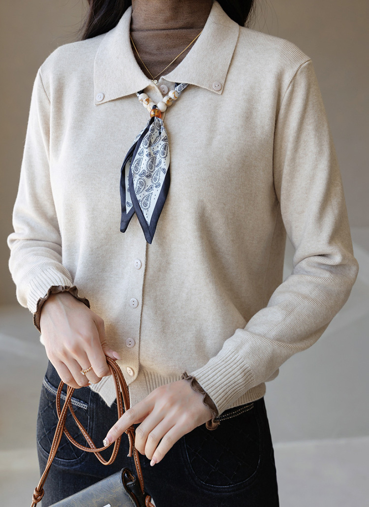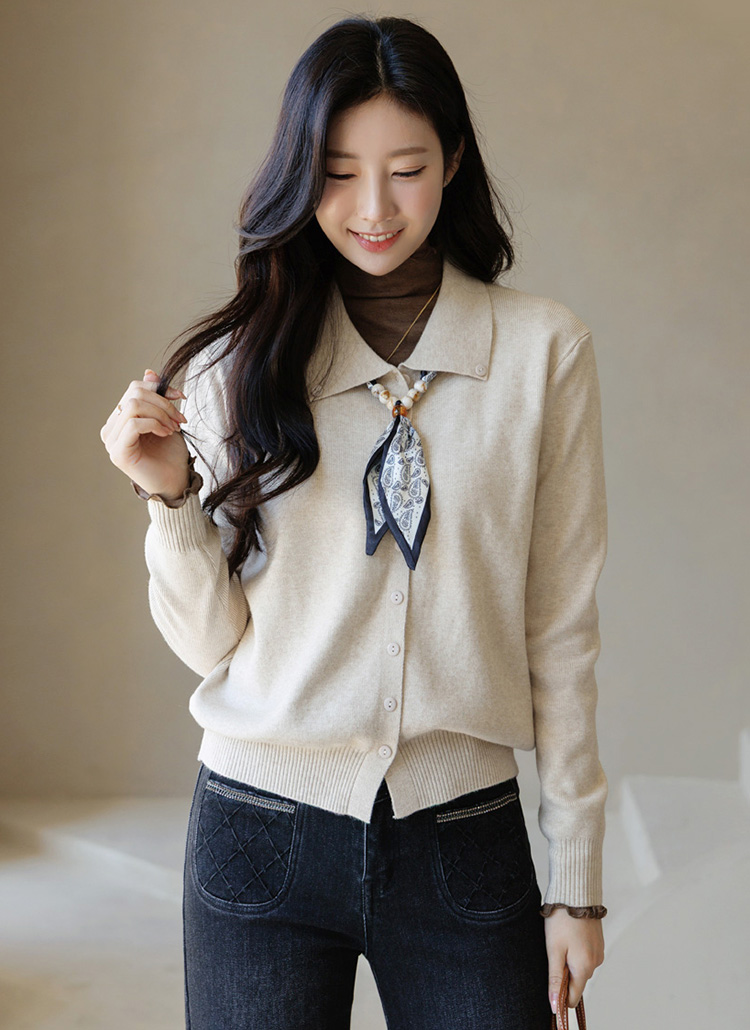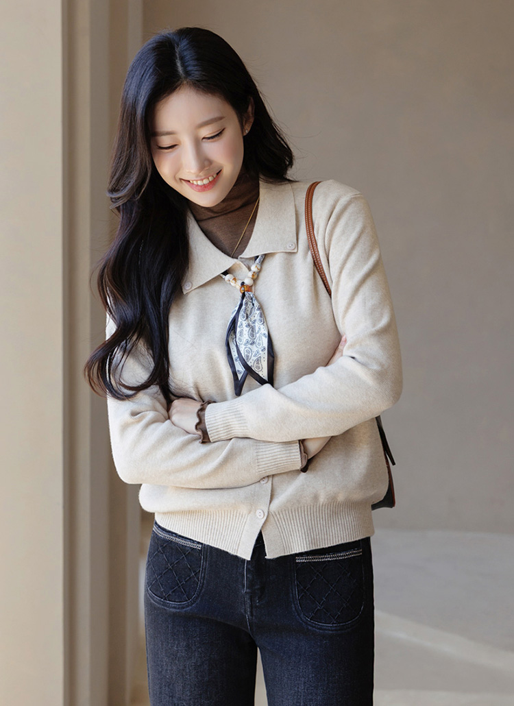 카라 디자인의 니트 가디건에 비즈 장식이 더해진 스카프가 SET로 구성되어