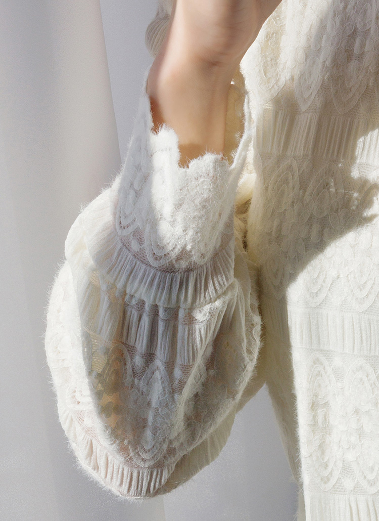 은은하게 비치는 시스루 레이스 소재로 섬세하고 여리여리한 분위기를 연출하면서도