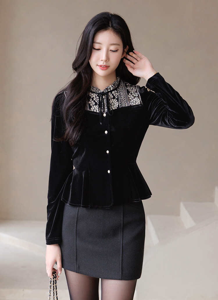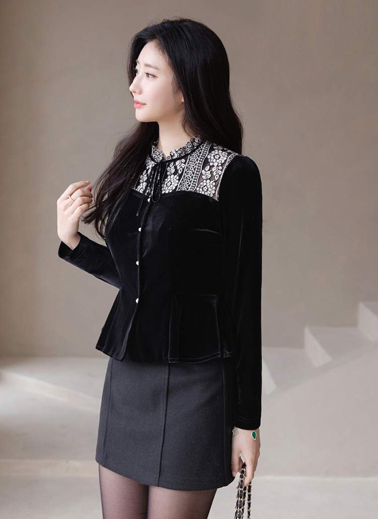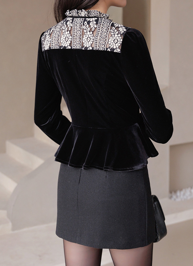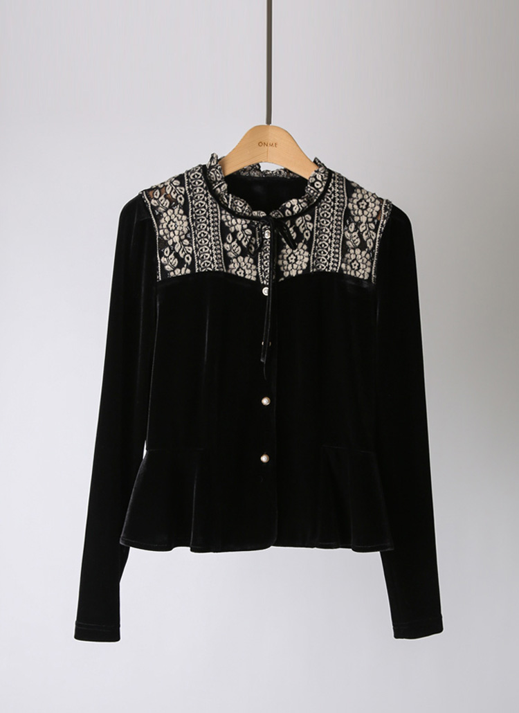 [LouisAngel] 起毛フラワーレースドッキング ベルベットペプラムブラウス bl43753