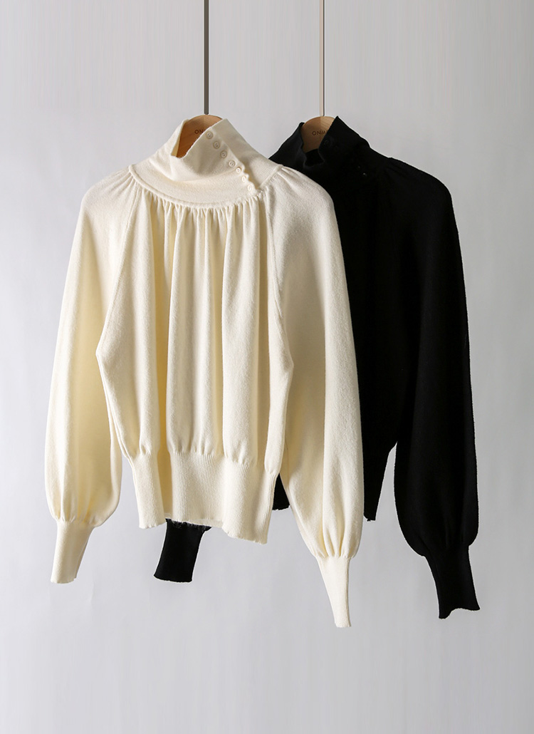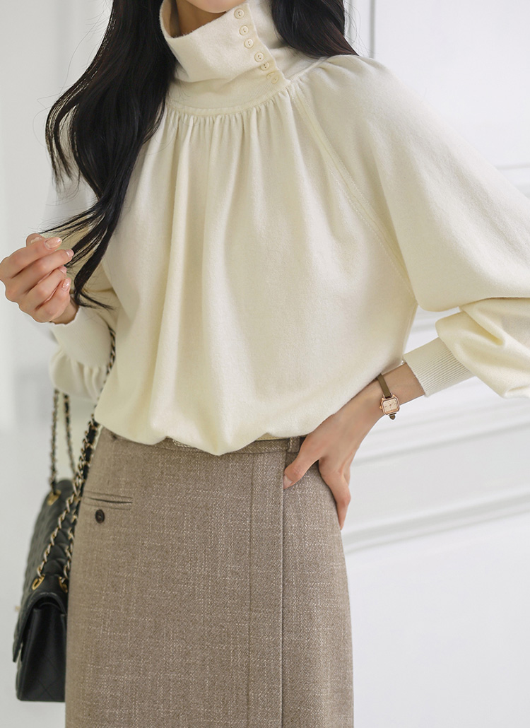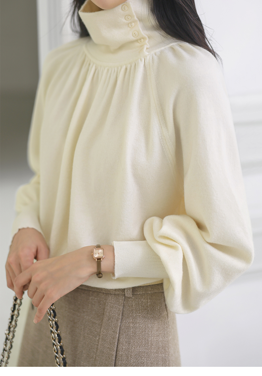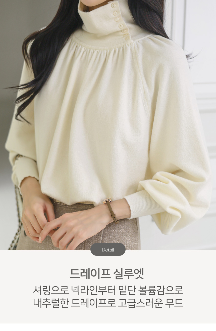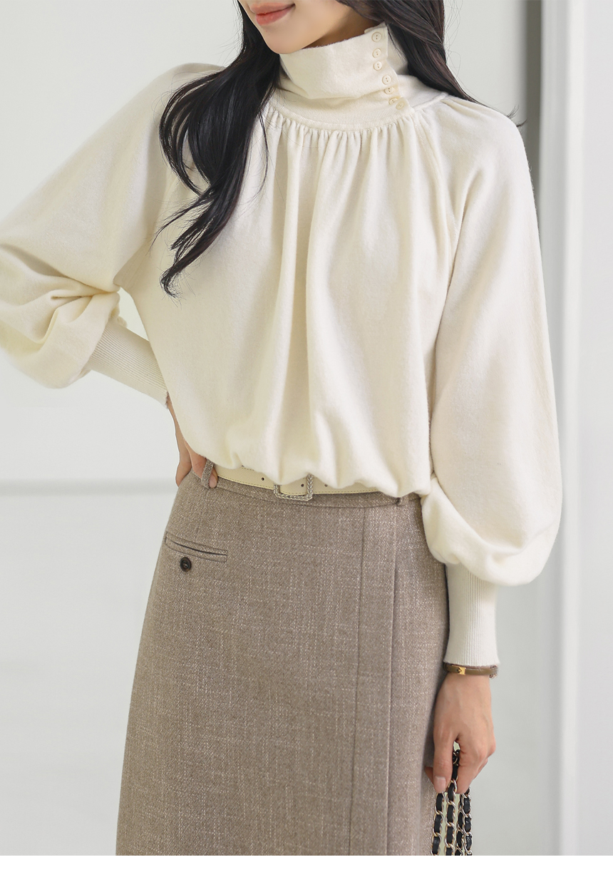 뷰엘 셔링 드레이프 볼륨소매 버튼 터들넥 니트