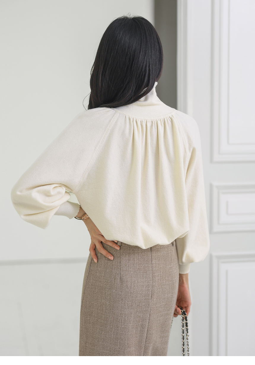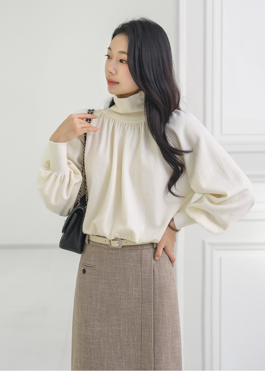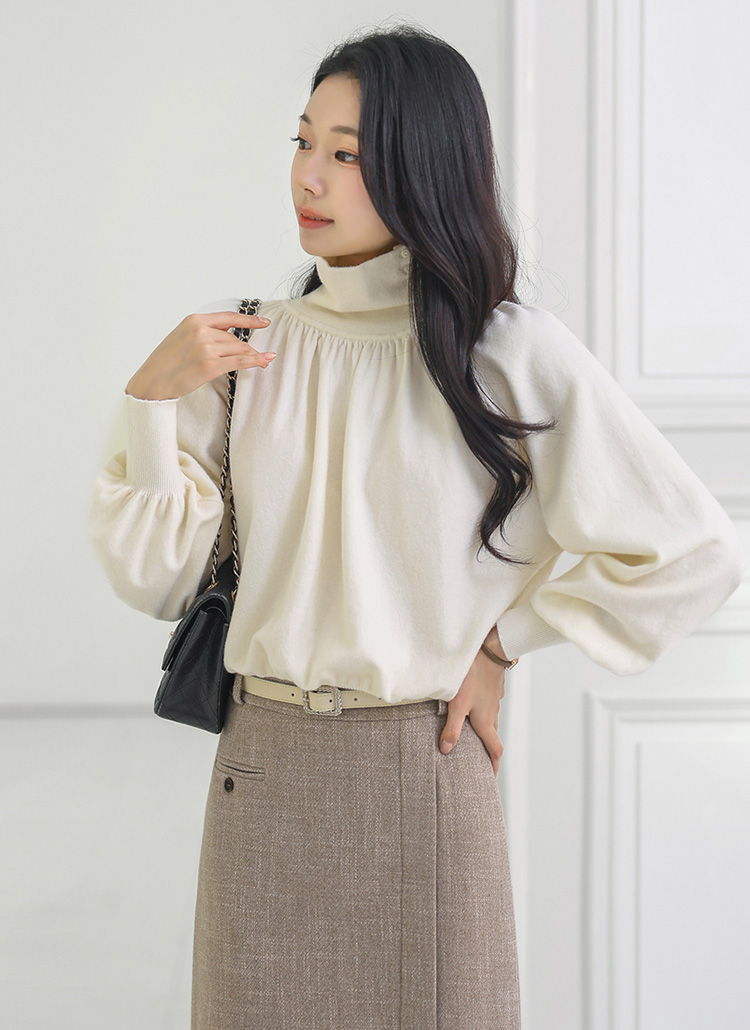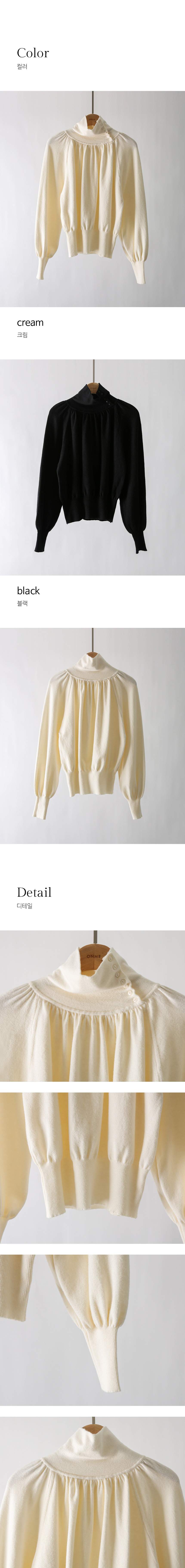 뷰엘 셔링 드레이프 볼륨소매 버튼 터들넥 니트
