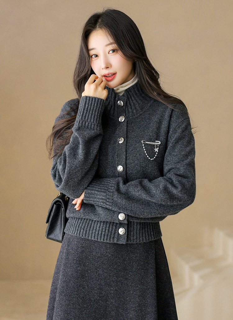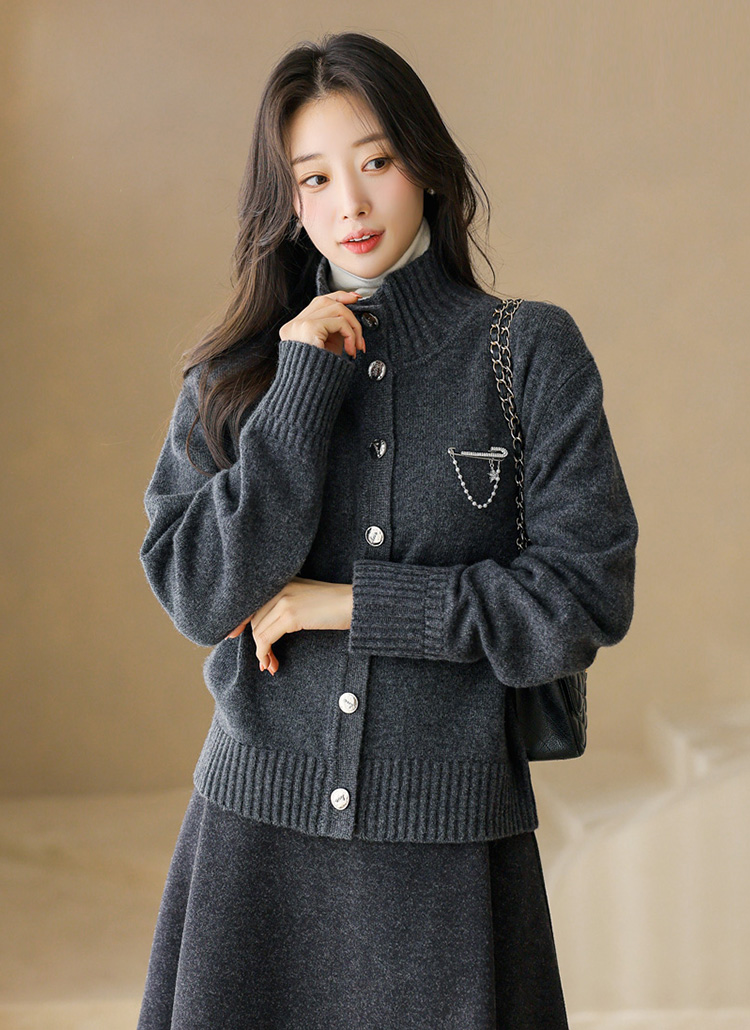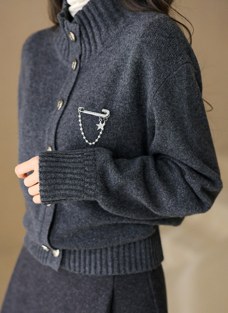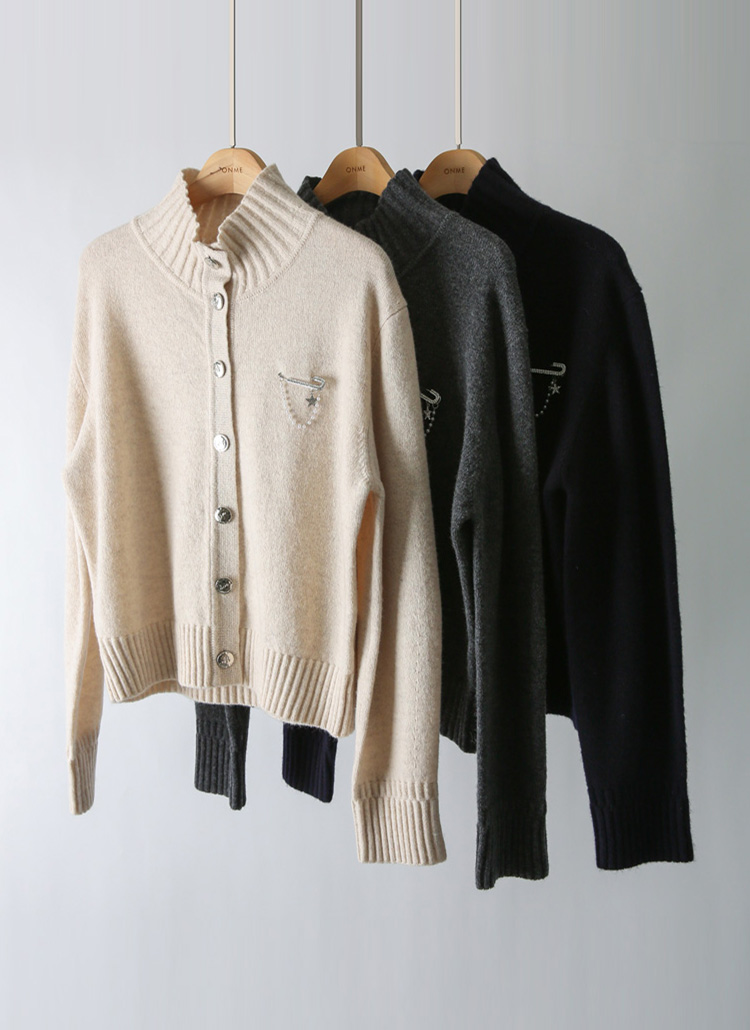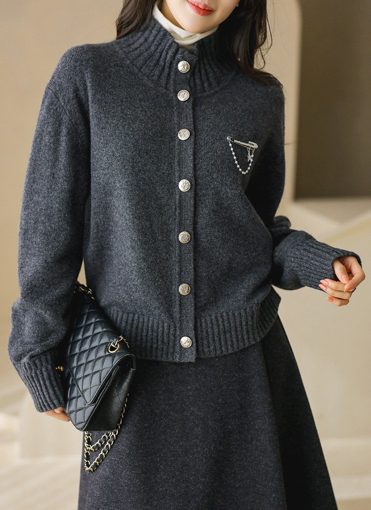 ブローチ付きウール100 ハイネックニットカーディガン cd43861