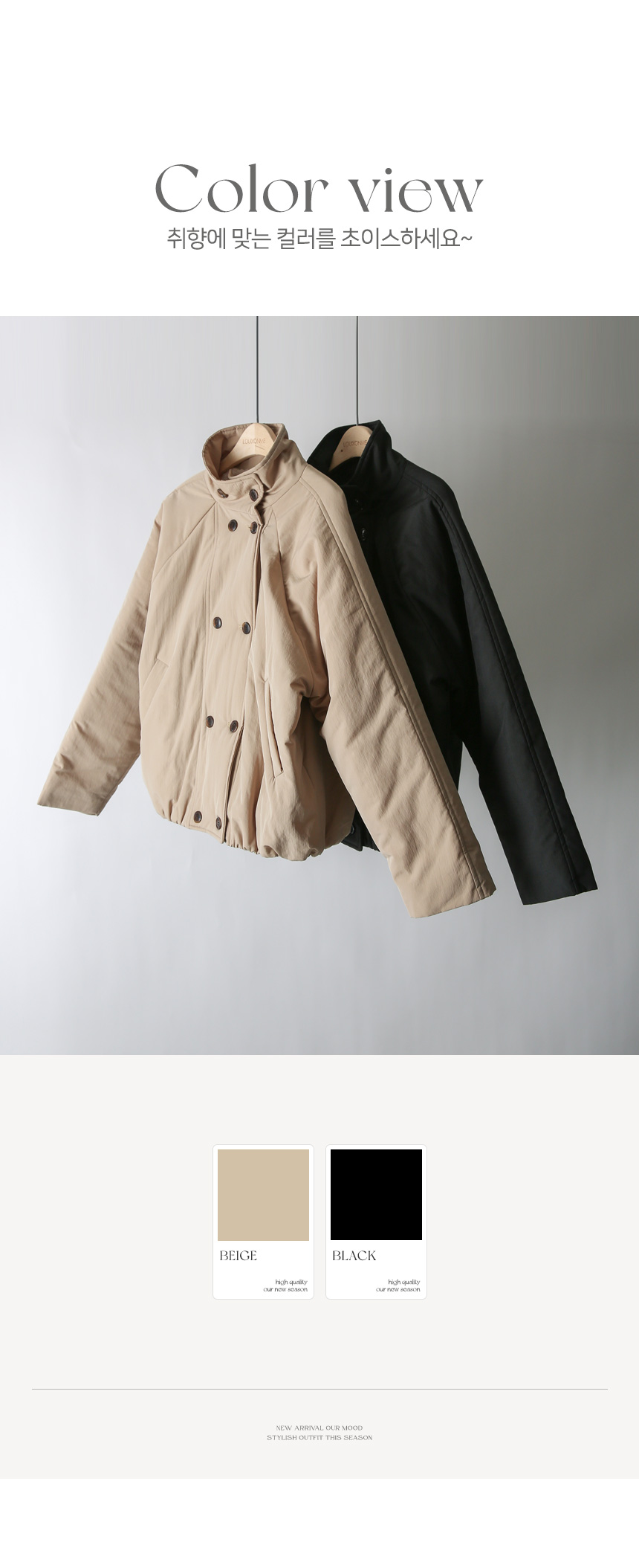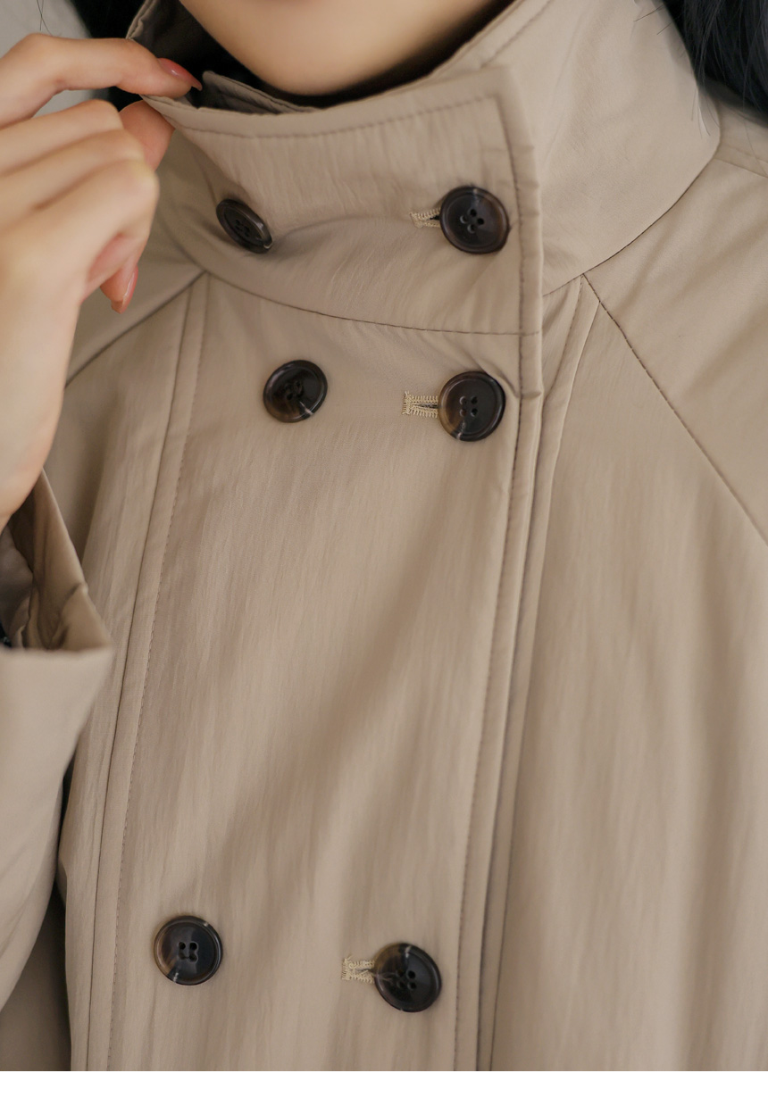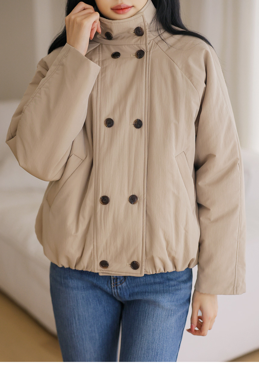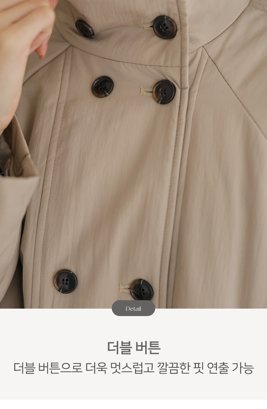 더블버튼과 하이넥 디테일이 조화를 이루어