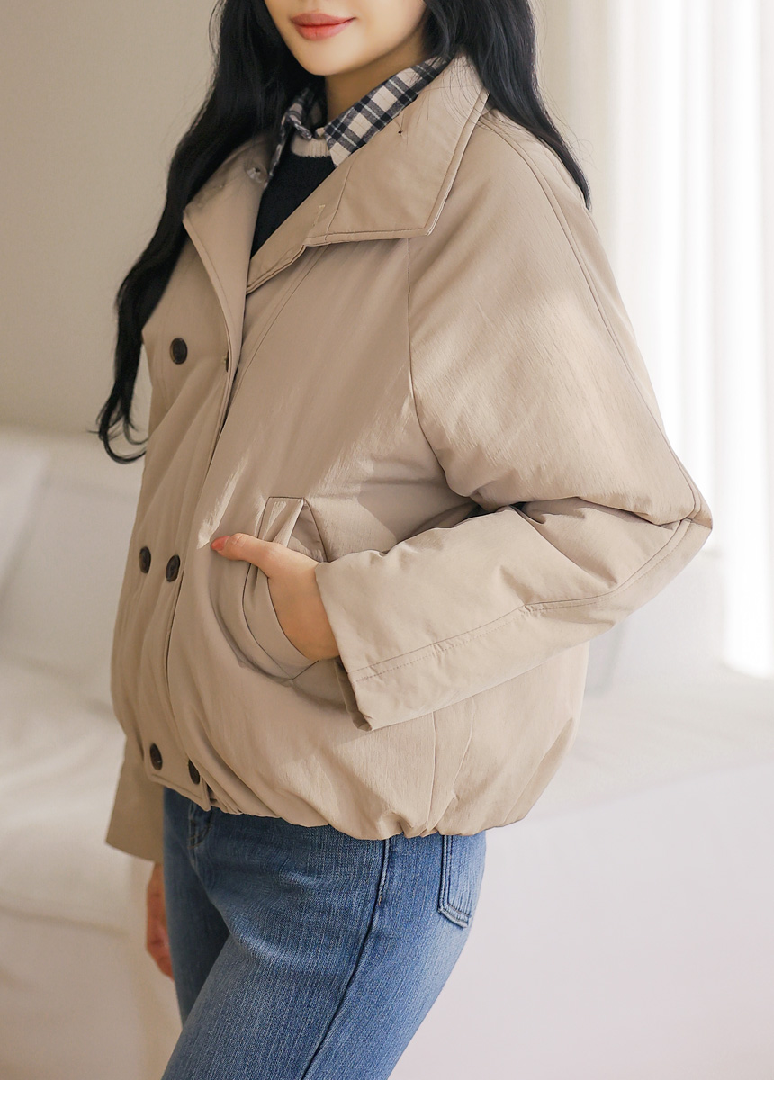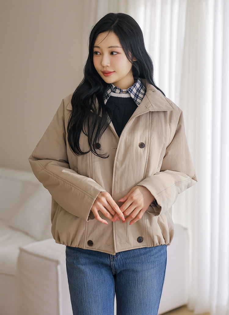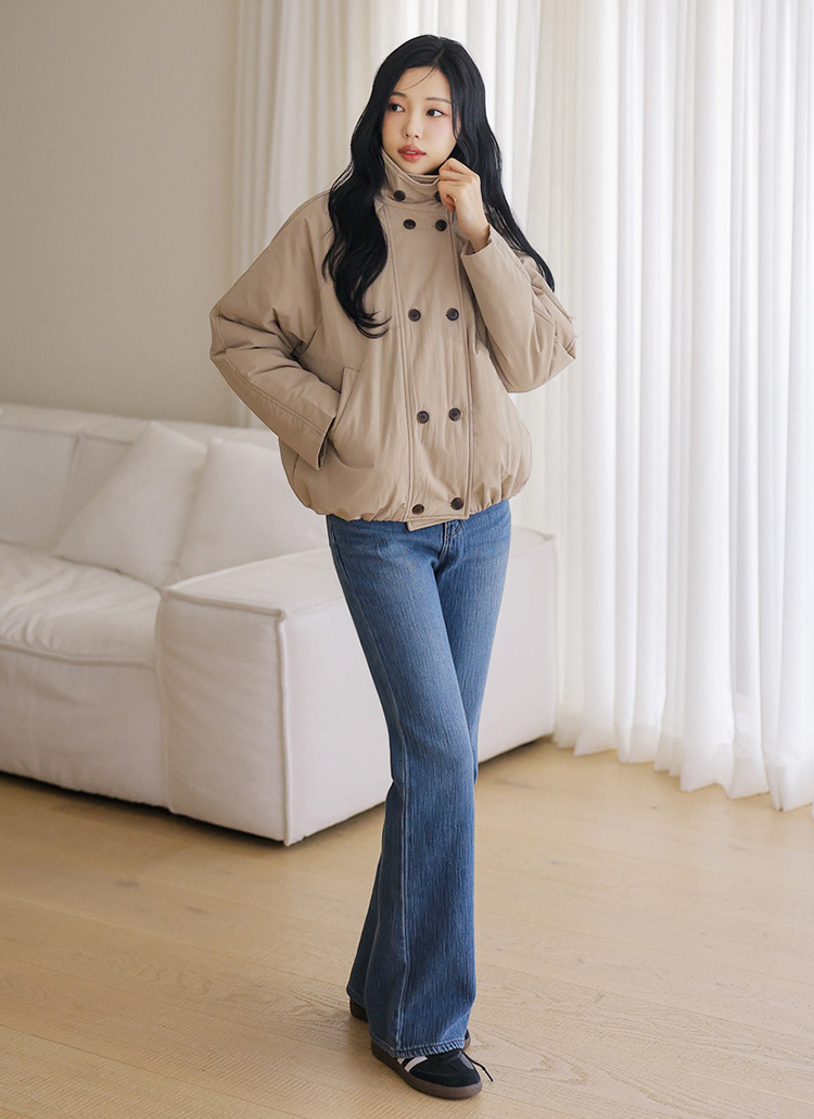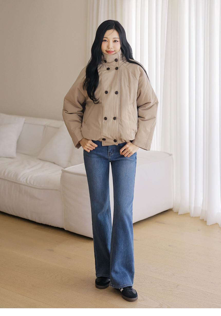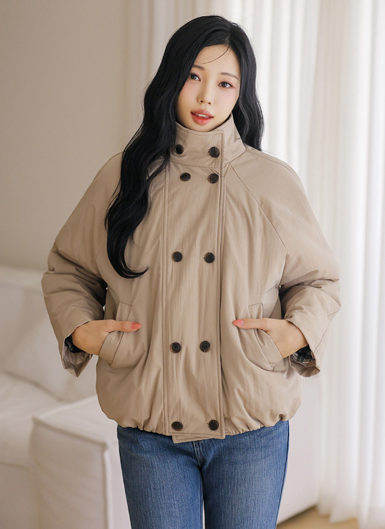 더블버튼과 하이넥 디테일이 조화를 이루어