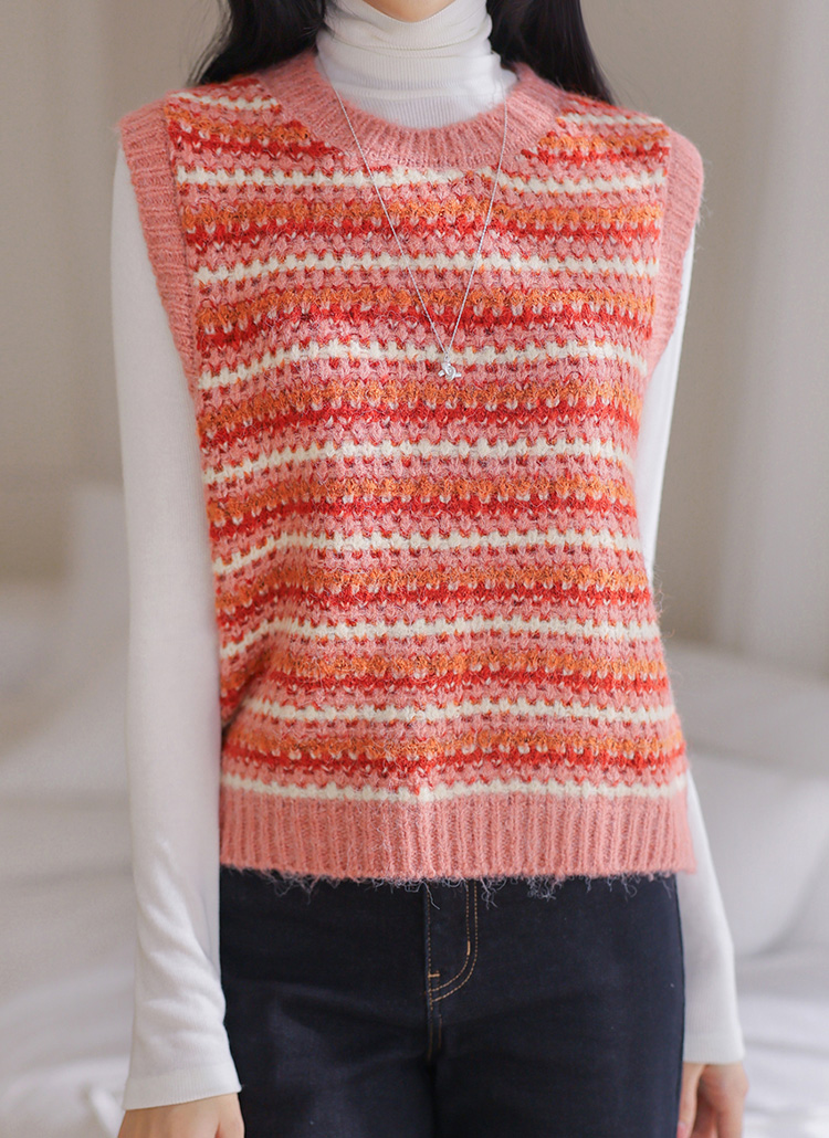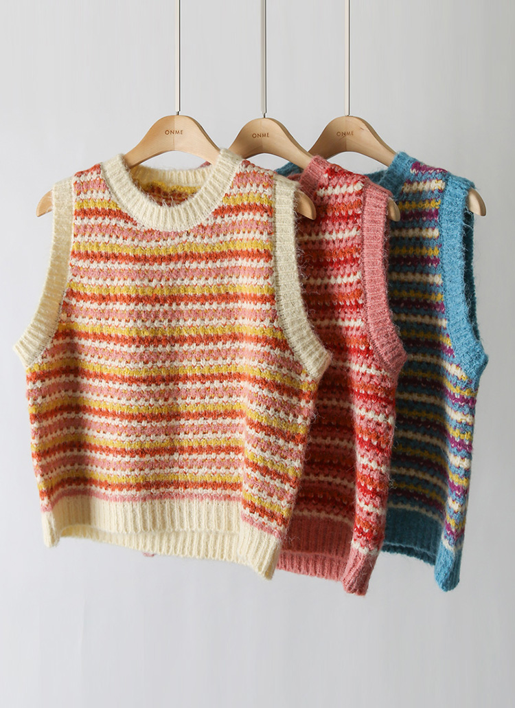 [THE ONME] ウールブレンド マルチボーダー クロシェ編みニットベスト vt43975