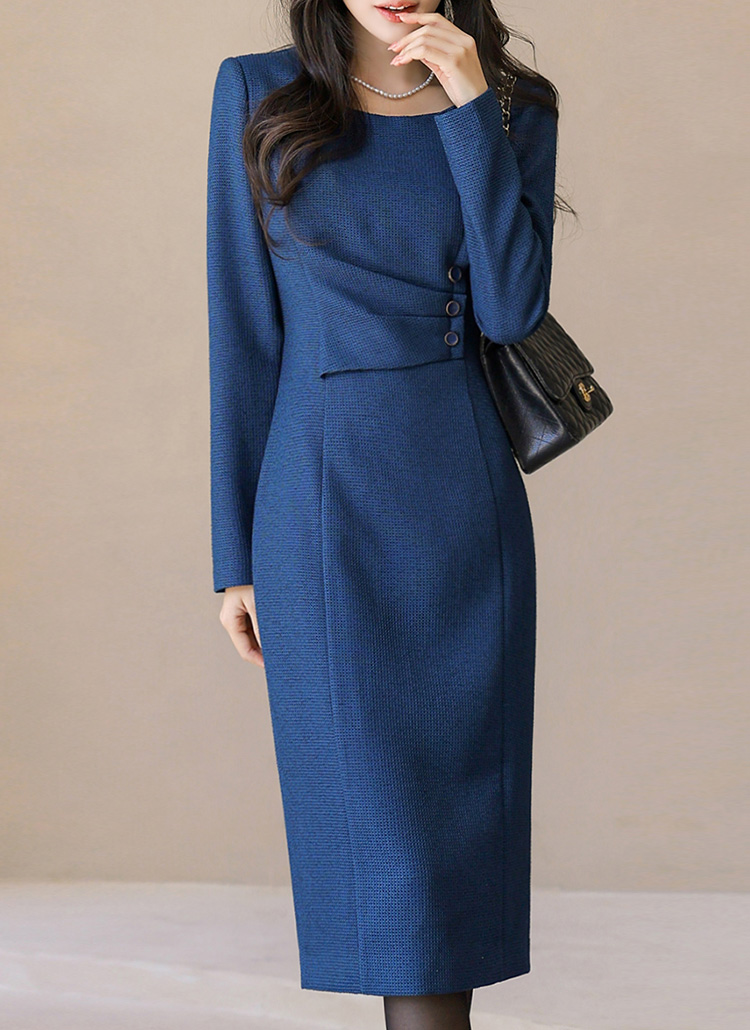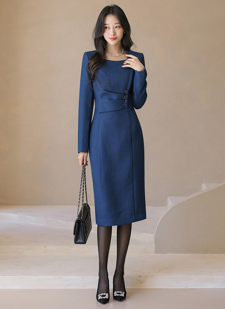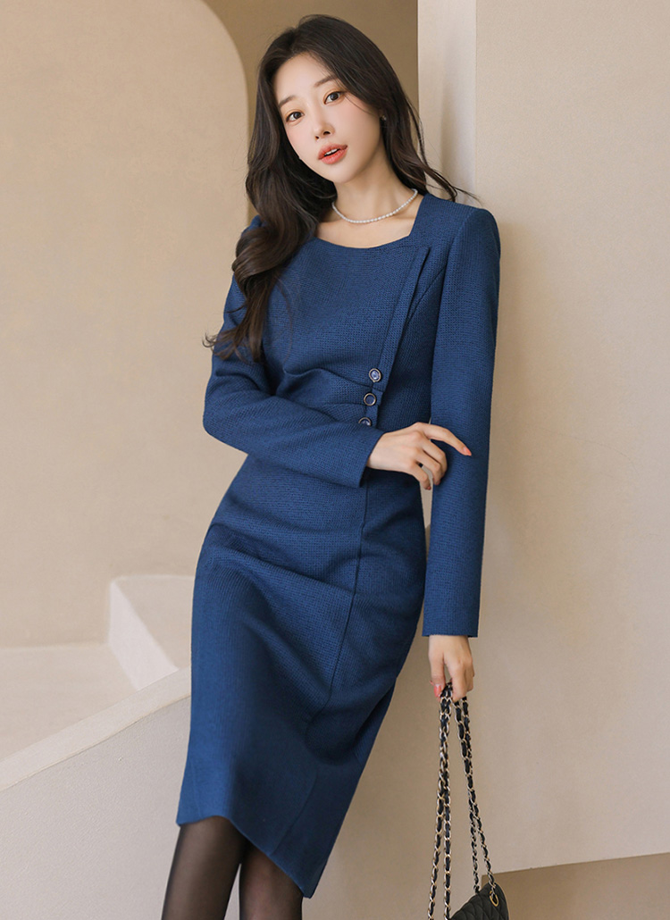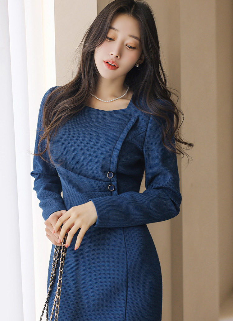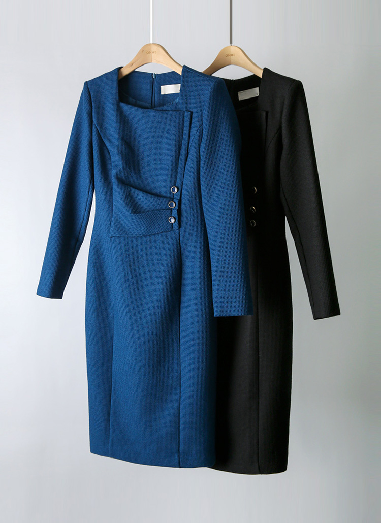 スクエアネック サイドボタン シャーリング スリムワンピース op43987