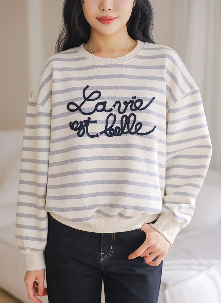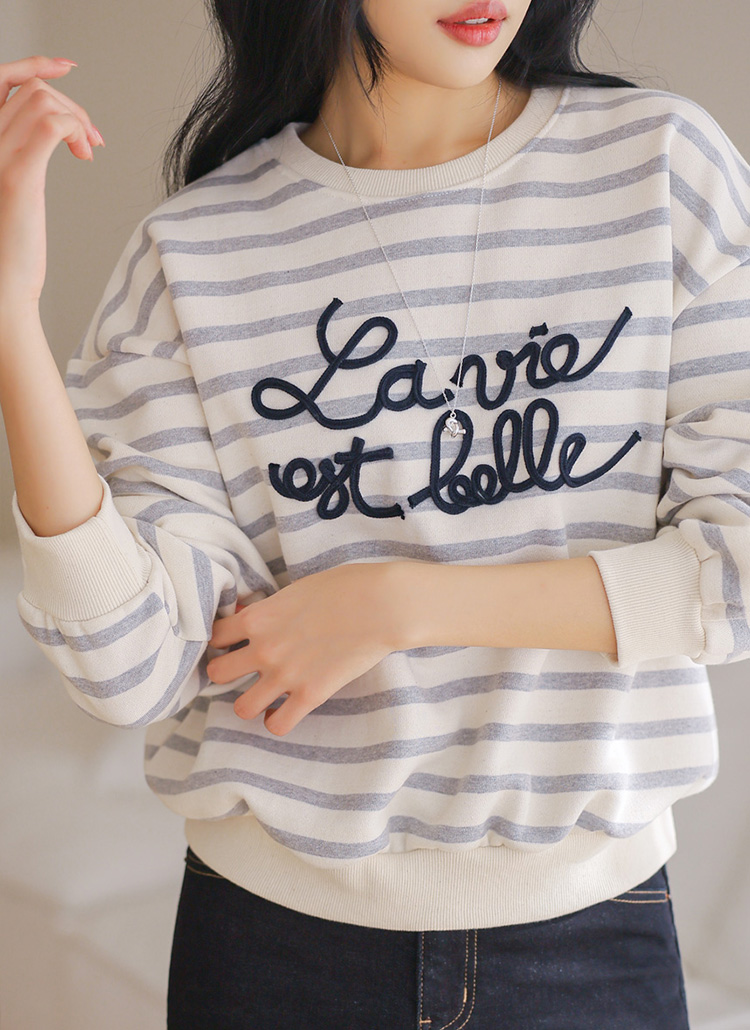 스트라이프 패턴 위에 더해진 레터링 자수 디테일로