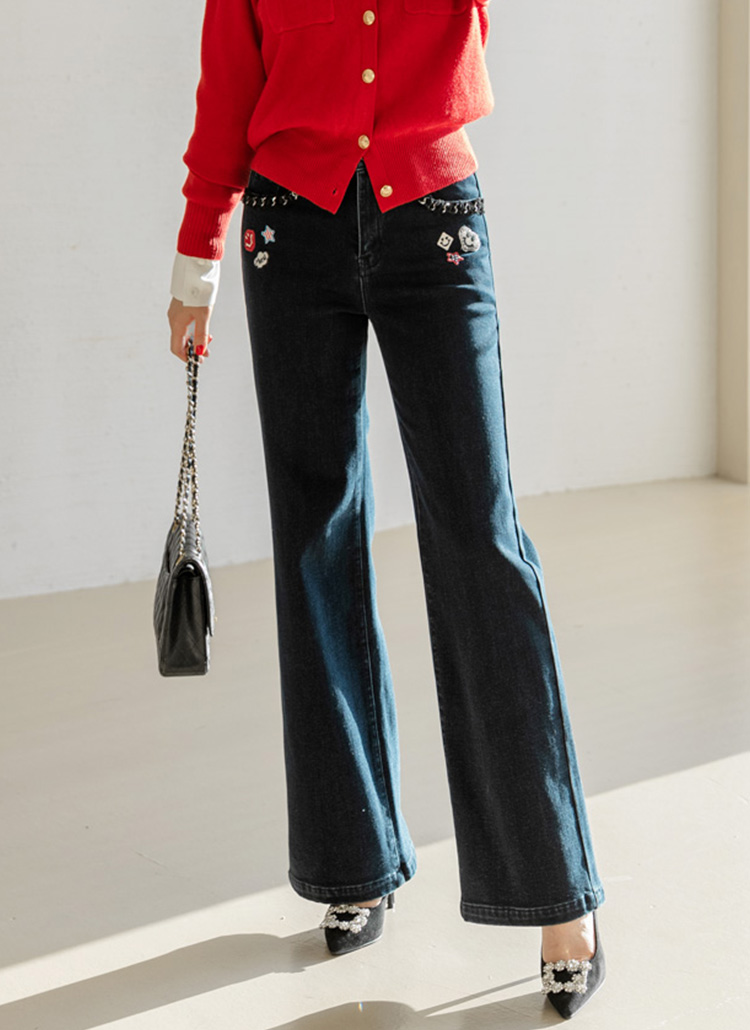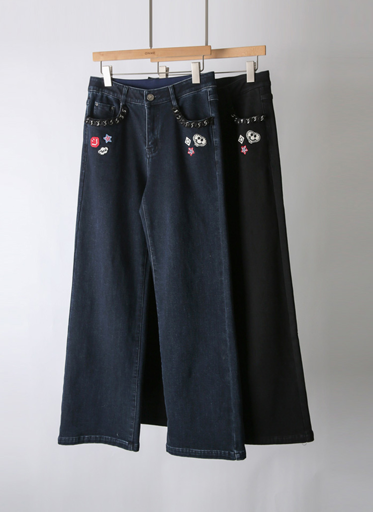 裏起毛ワッペンチェーンポケット デニムフレアパンツ pt44020