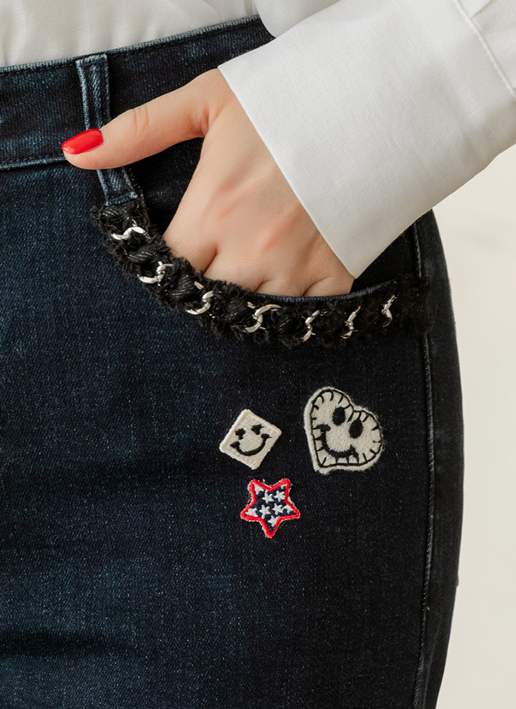 포켓 라인을 따라 섬세하게 장식된 체인 디테일이 시크한 반전을 더해