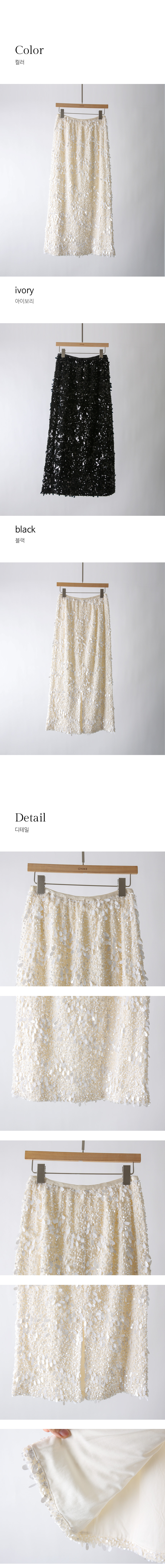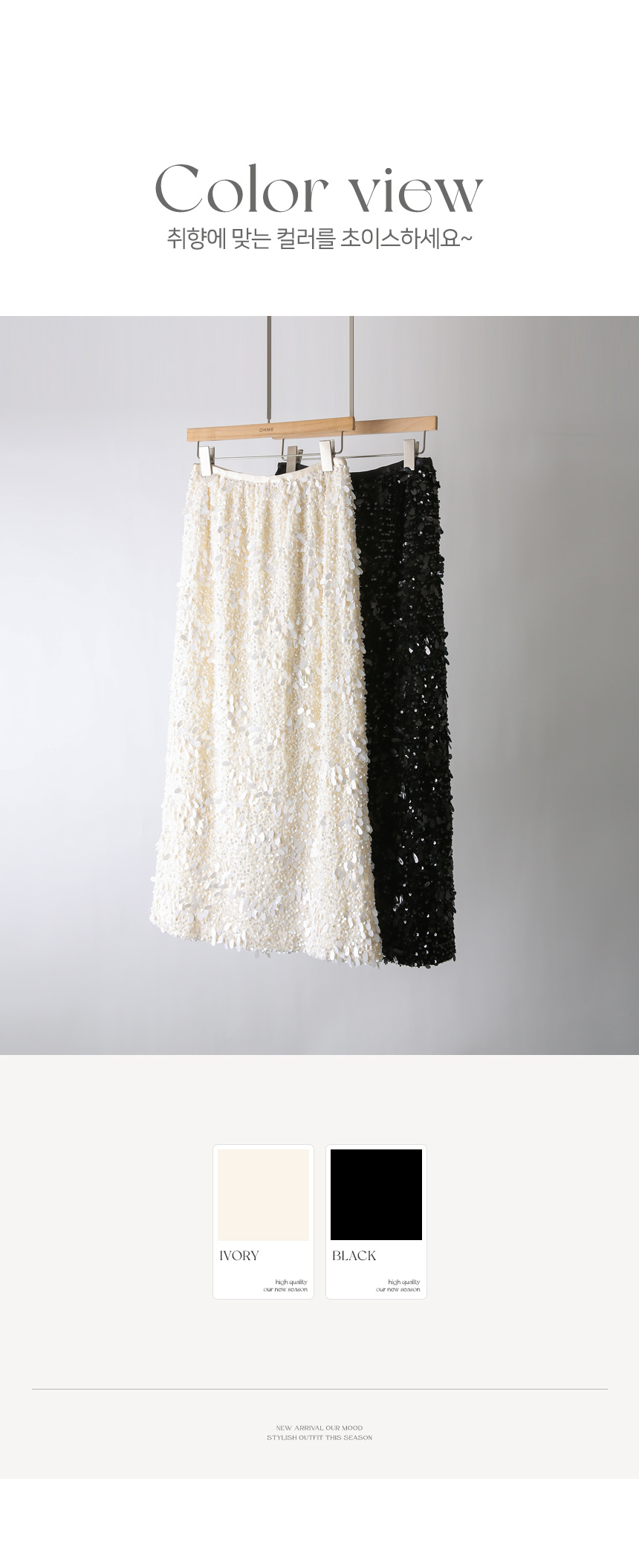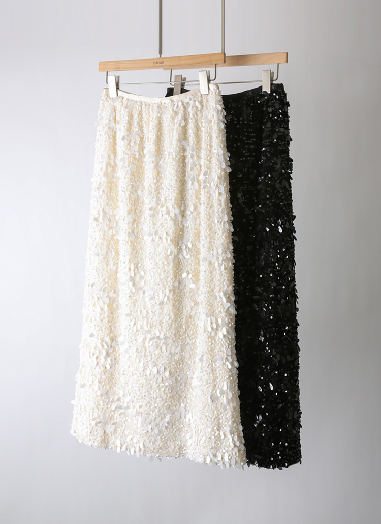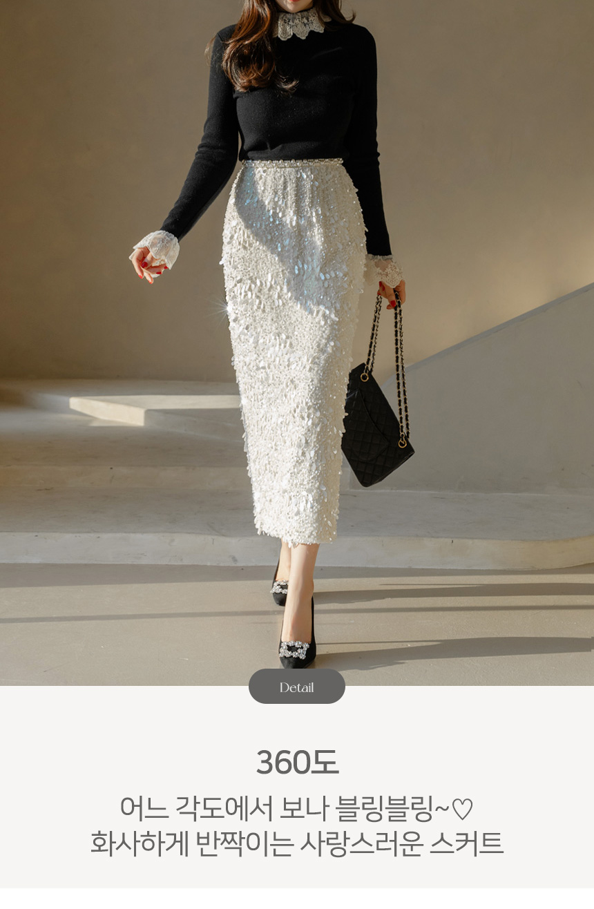 360도로 은은하게 반짝이는 전체 스팽글 디테일이 시선을 사로잡는 롱 스커트에요