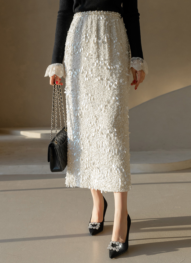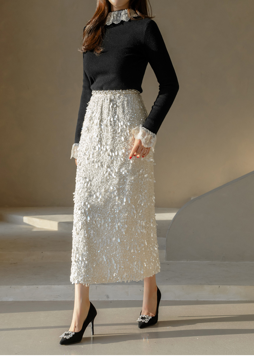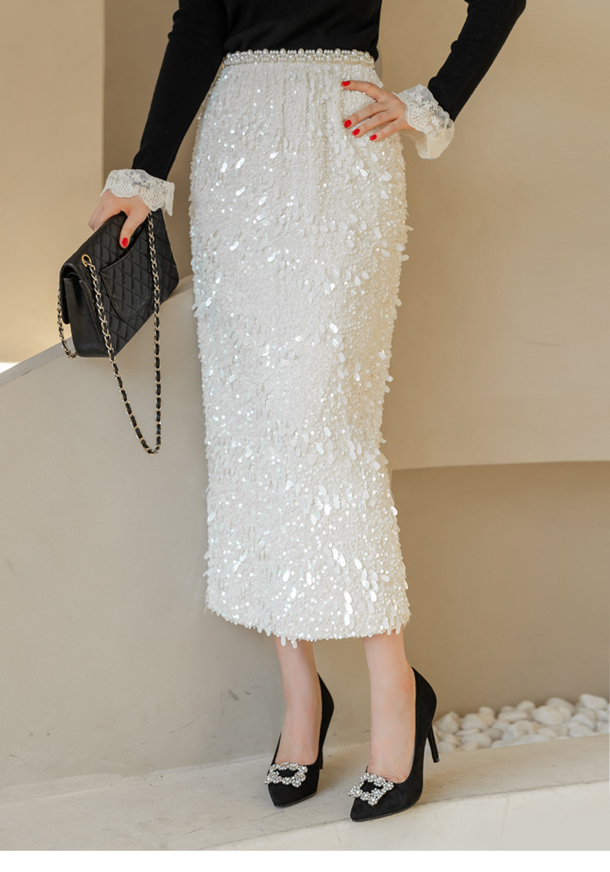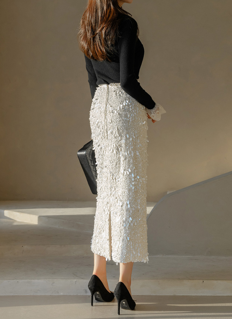 360도로 은은하게 반짝이는 전체 스팽글 디테일이 시선을 사로잡는 롱 스커트에요