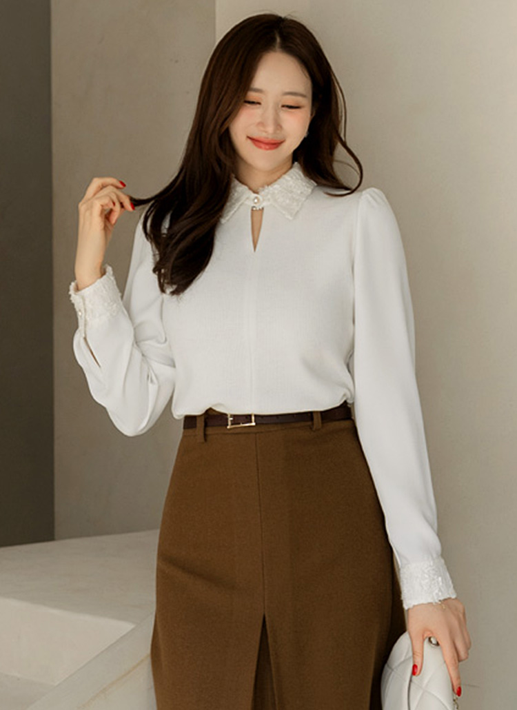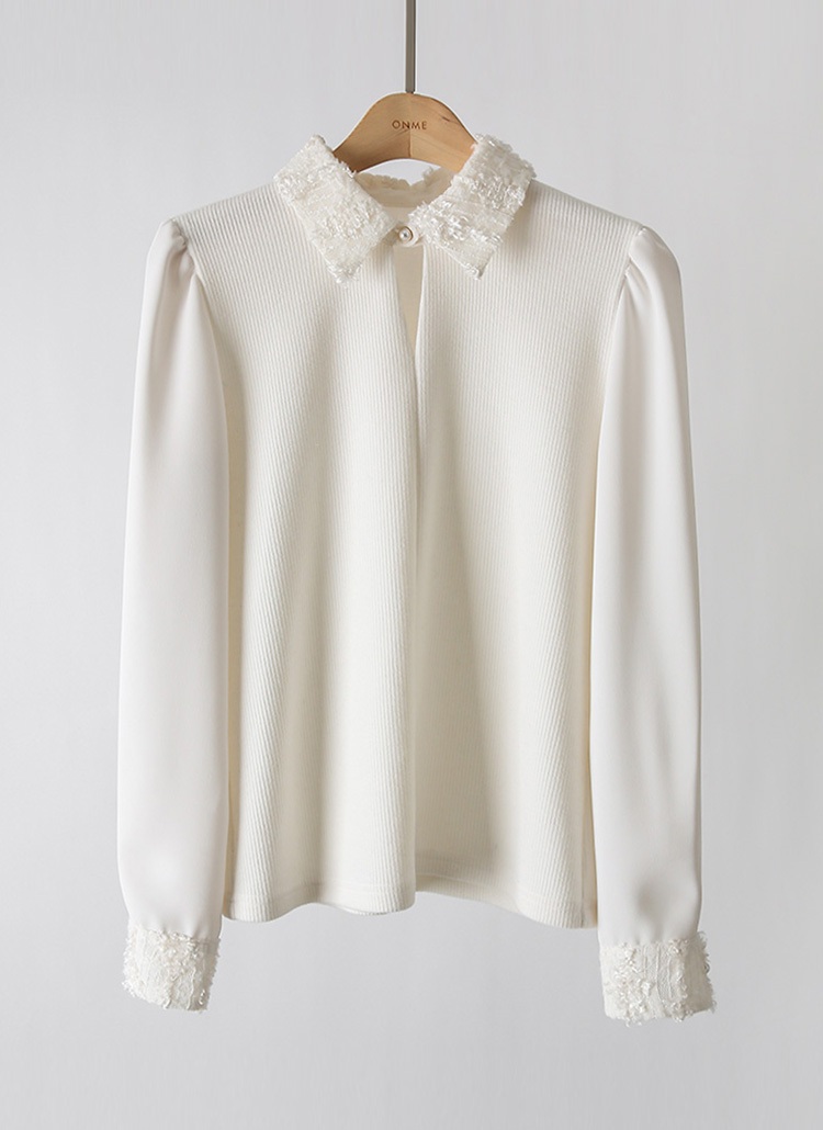 [LouisAngel] フロントスリット レースカラー リブブラウス bl44110
