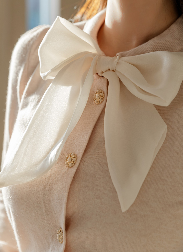 넥 라인에 홀이 더해져 있어 쉬폰 리본을 안쪽으로 넣어