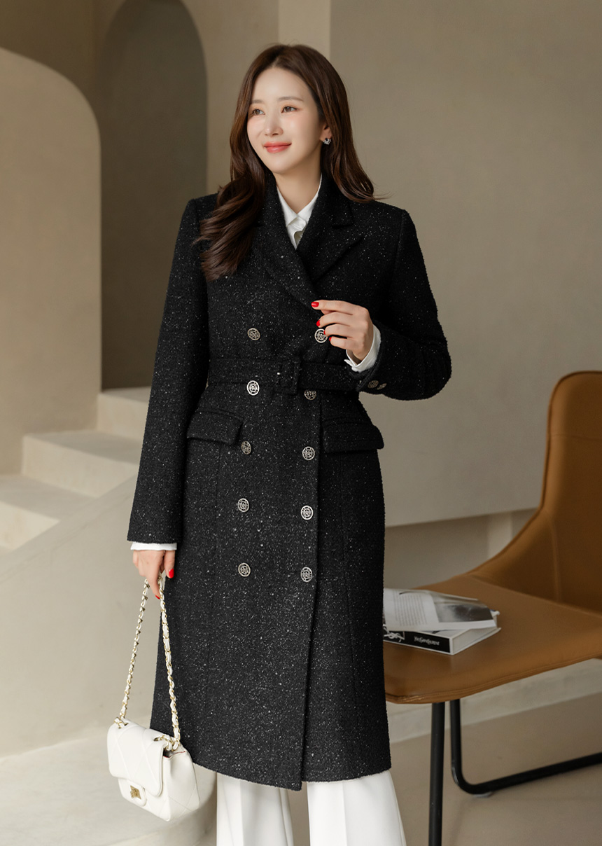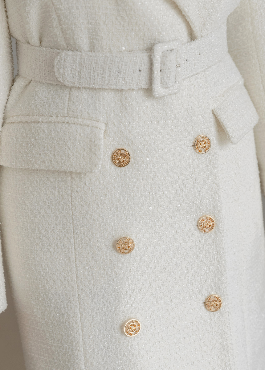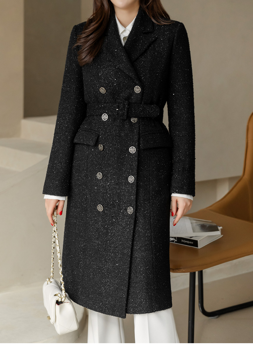 ベルト付き ウールブレンド ラメツイード ロングコートct44161