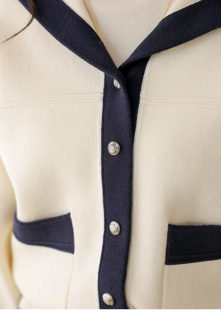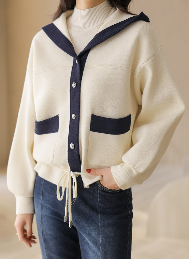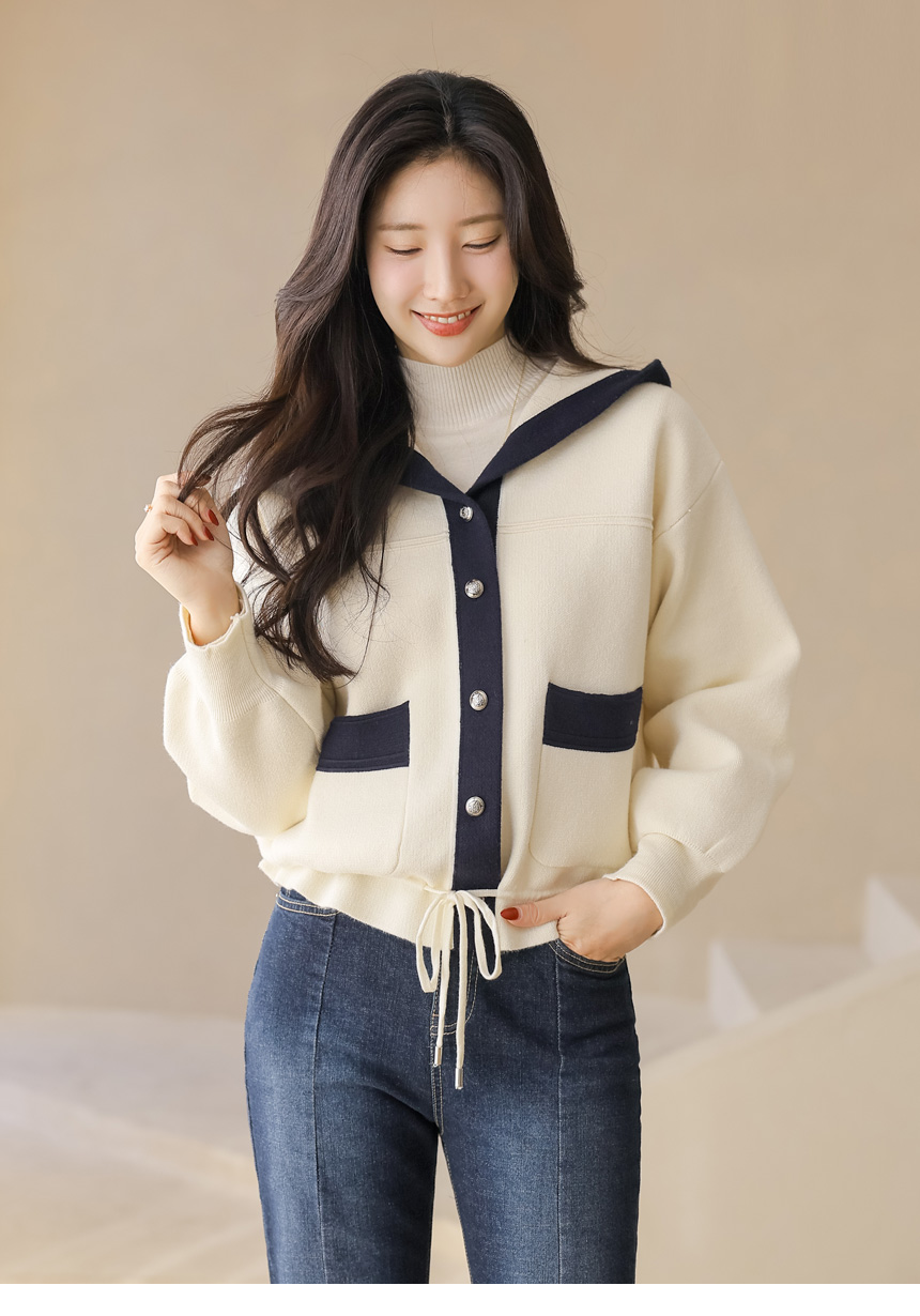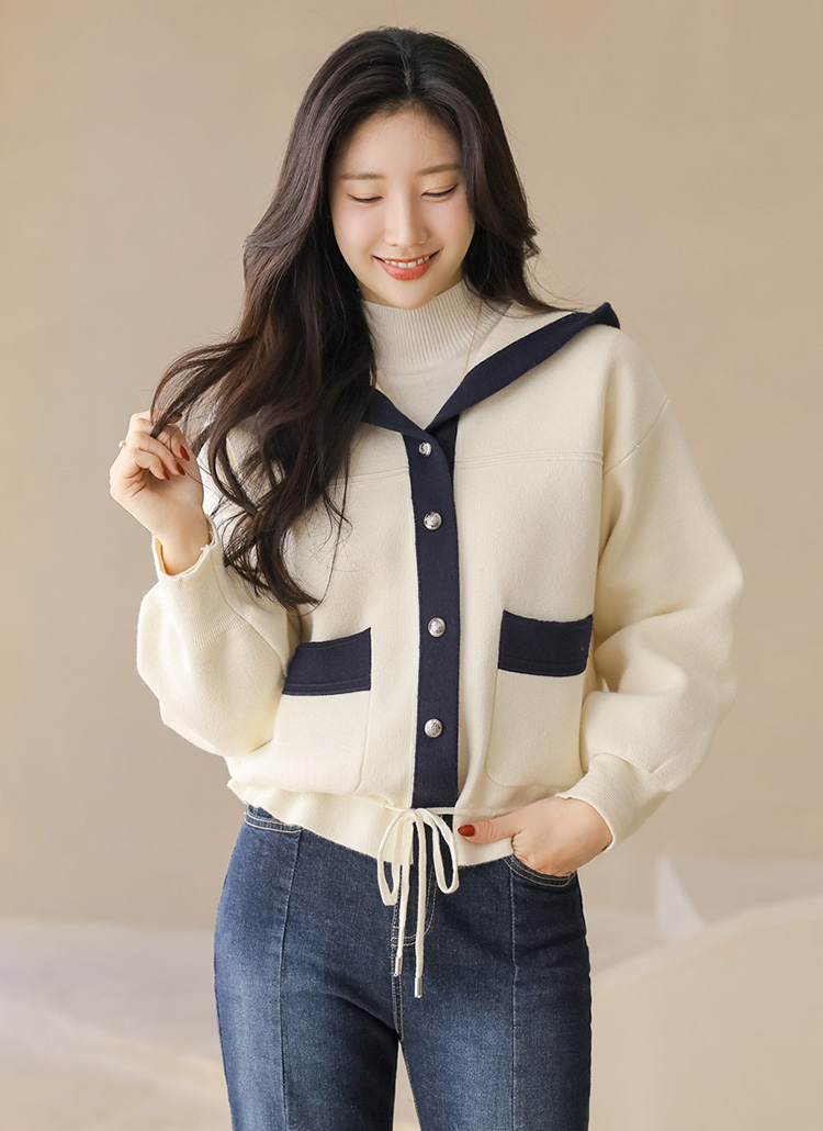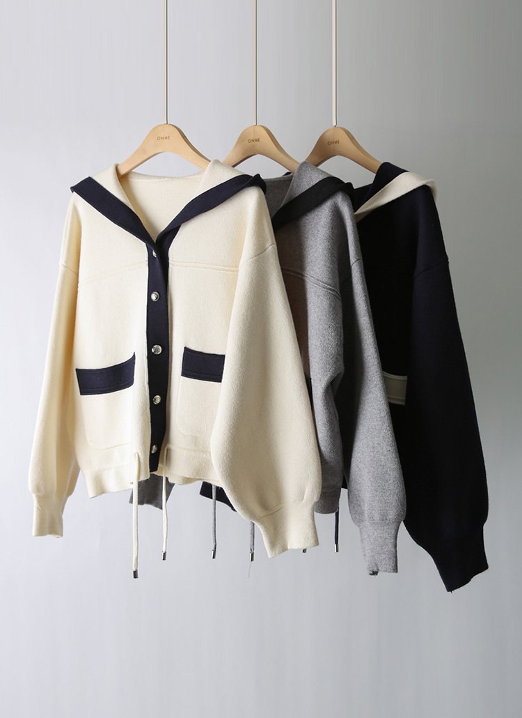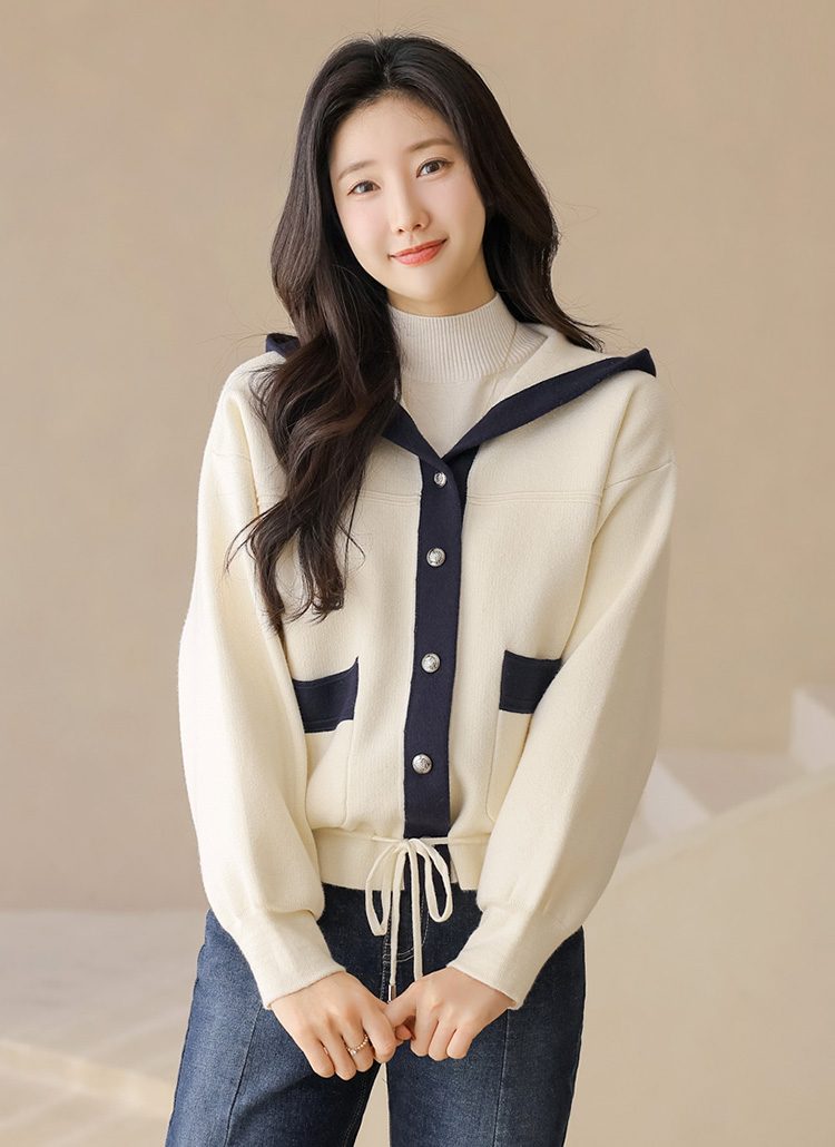 스트링 배색라인 후드 니트 가디건이에요 :)