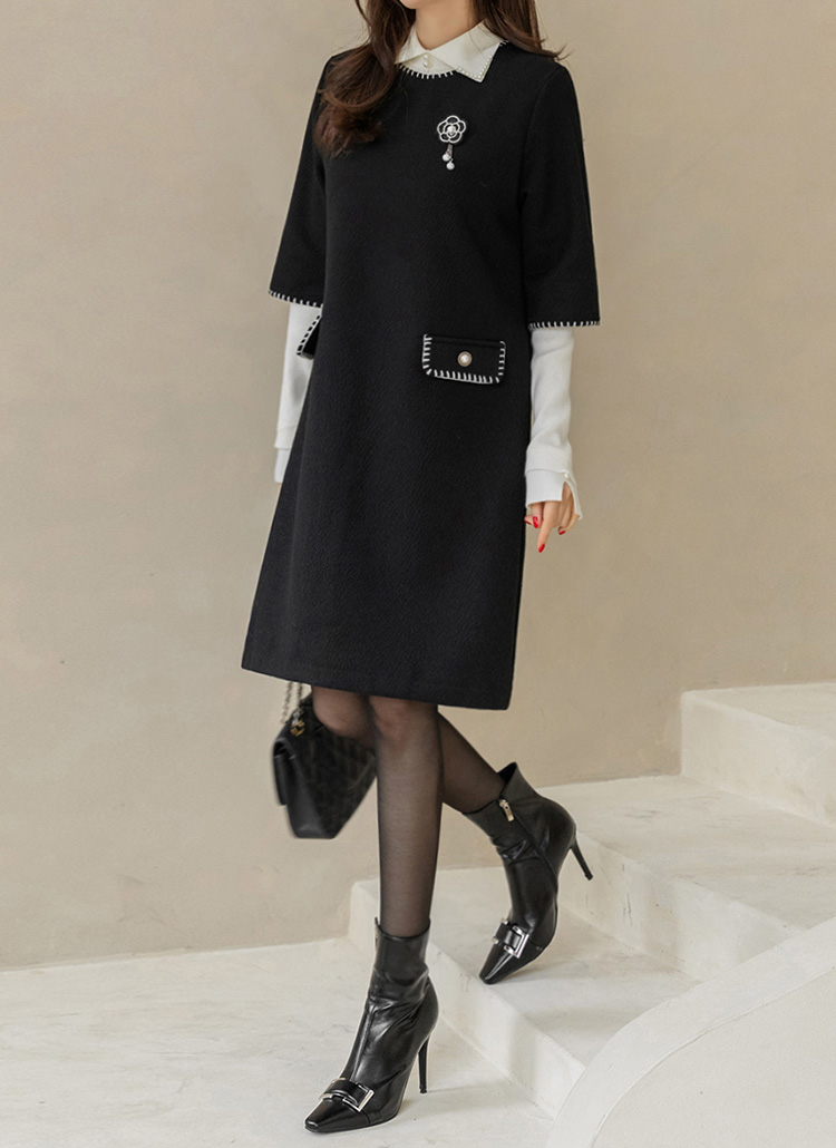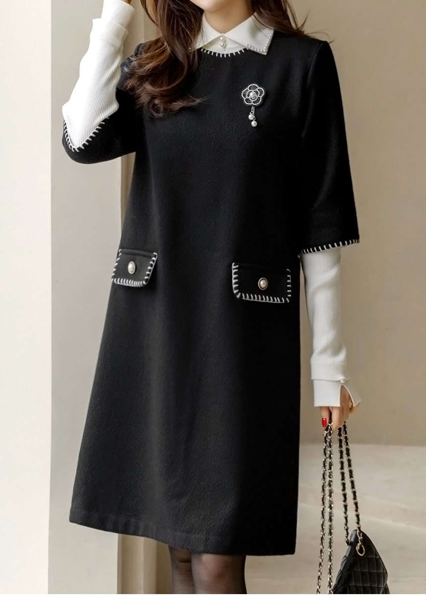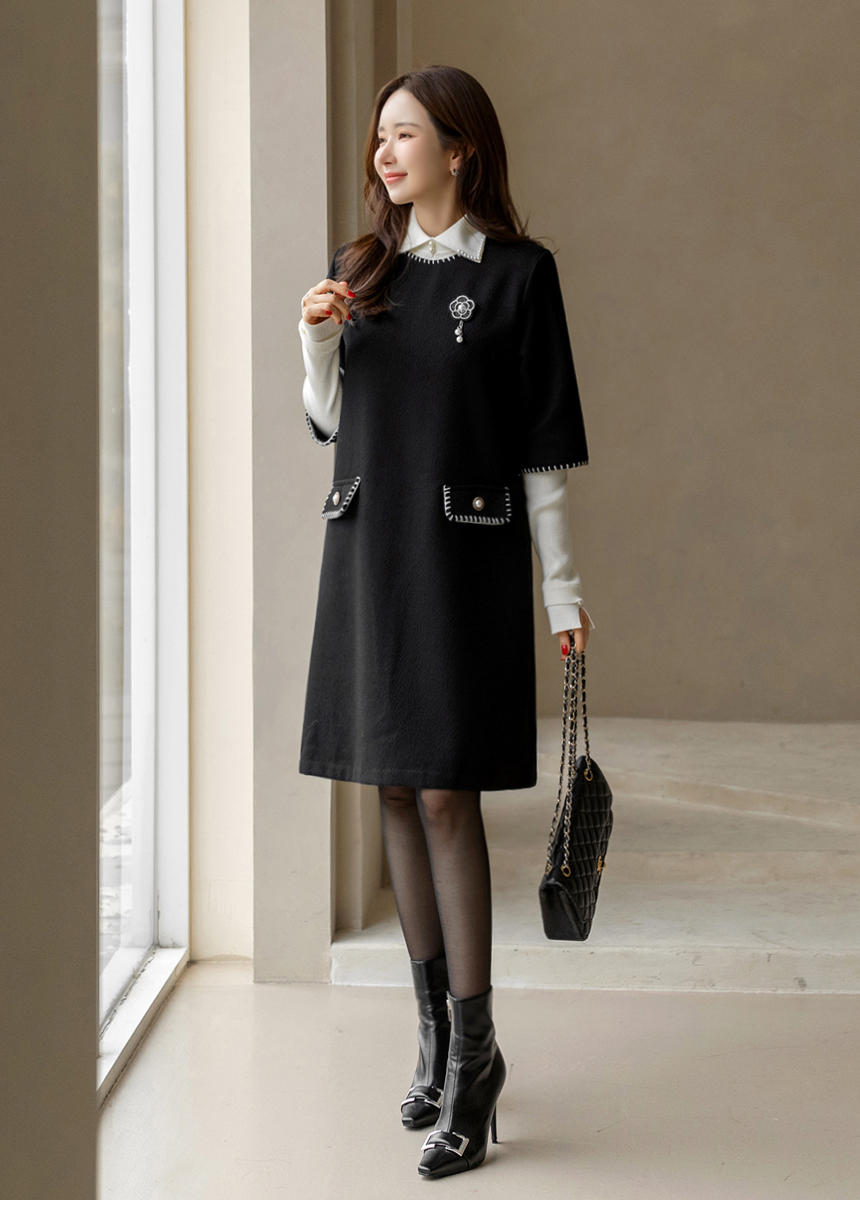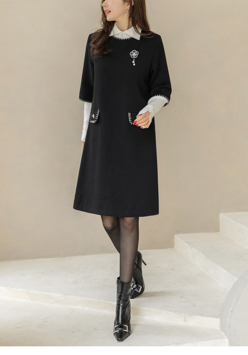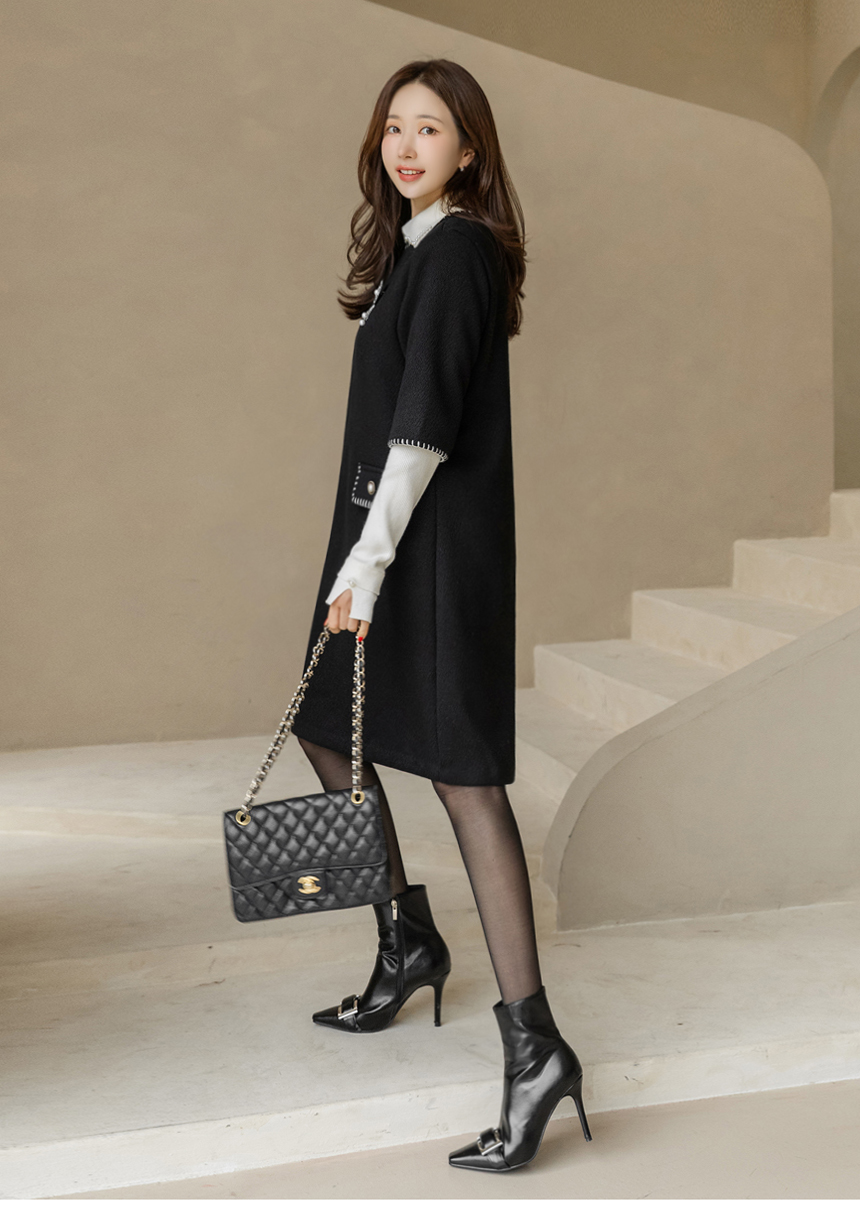 ステッチポイント ウールブレンド 7分袖チュニックワンピース op44200