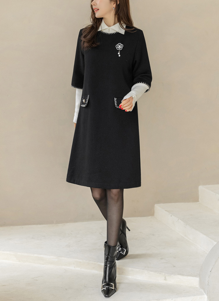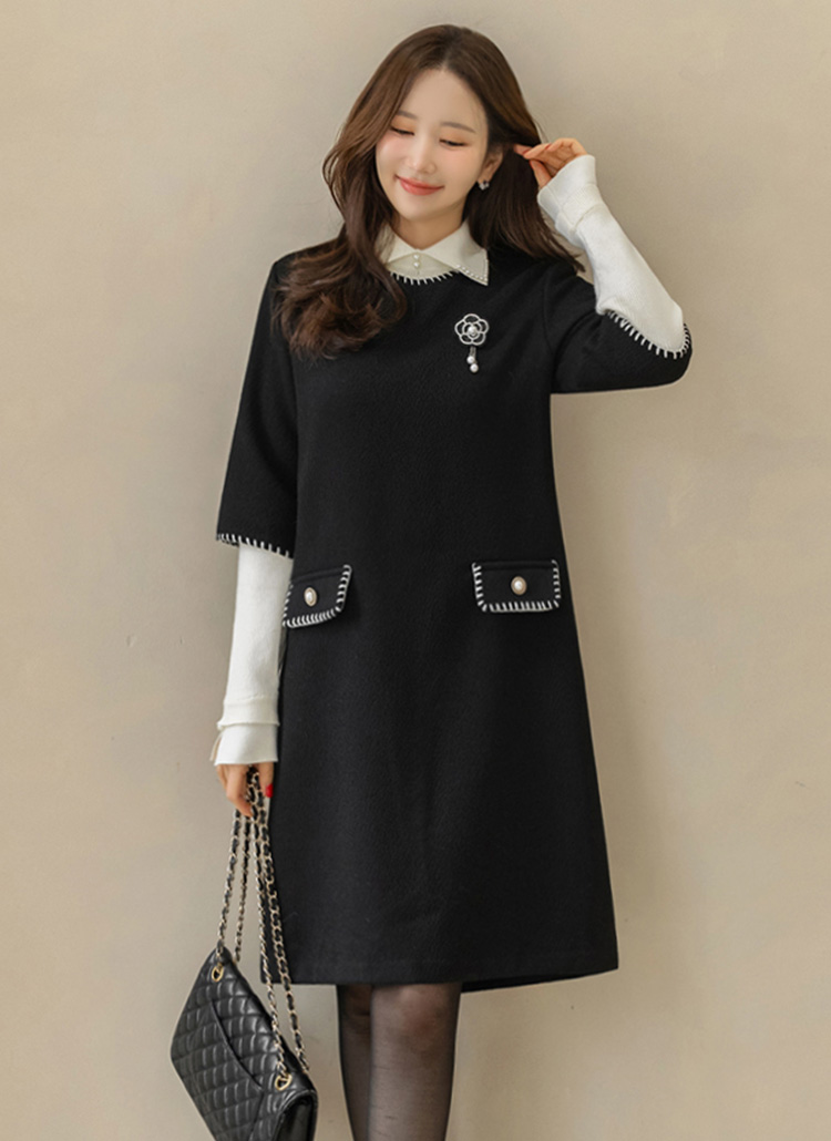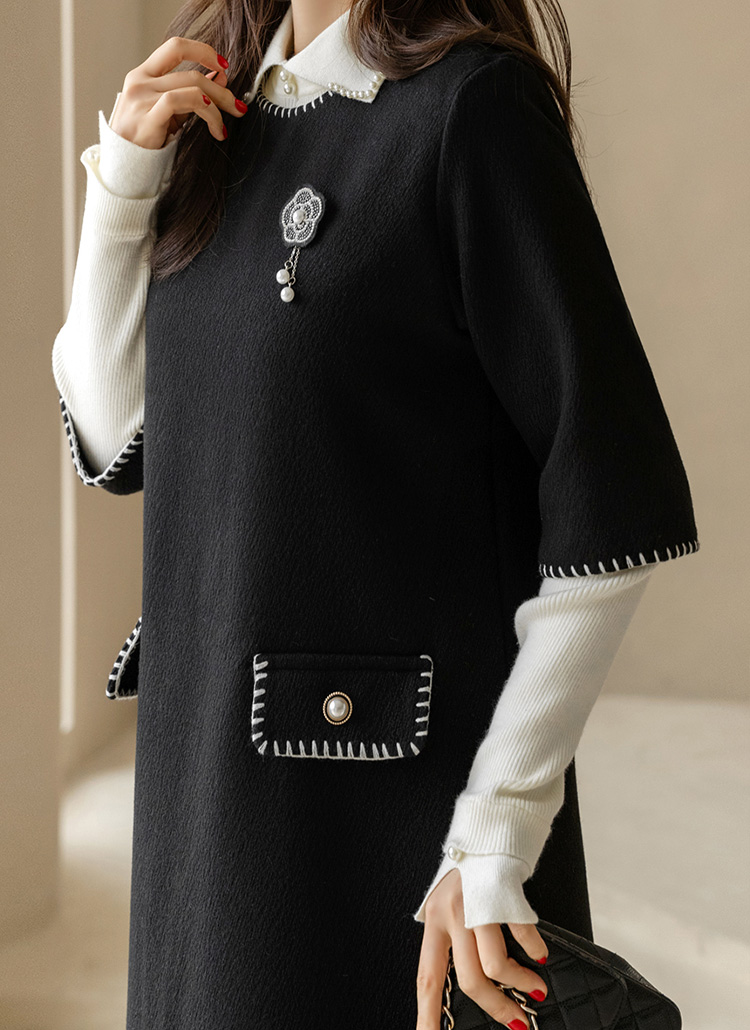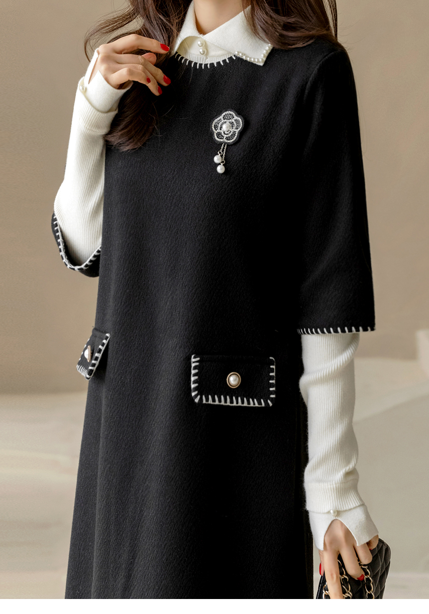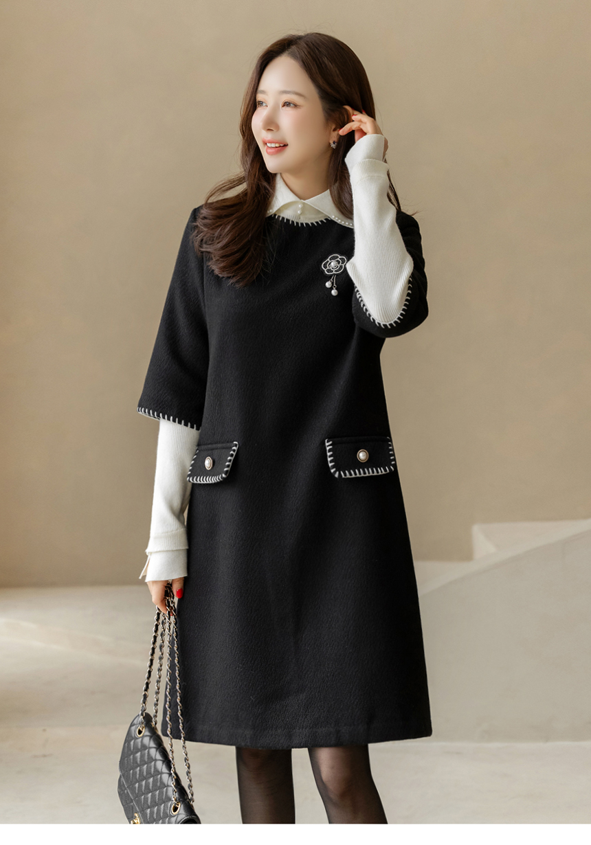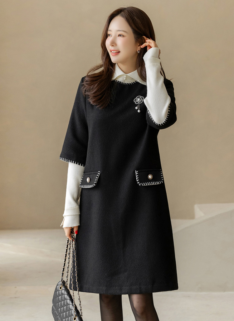 ステッチポイント ウールブレンド 7分袖チュニックワンピース op44200