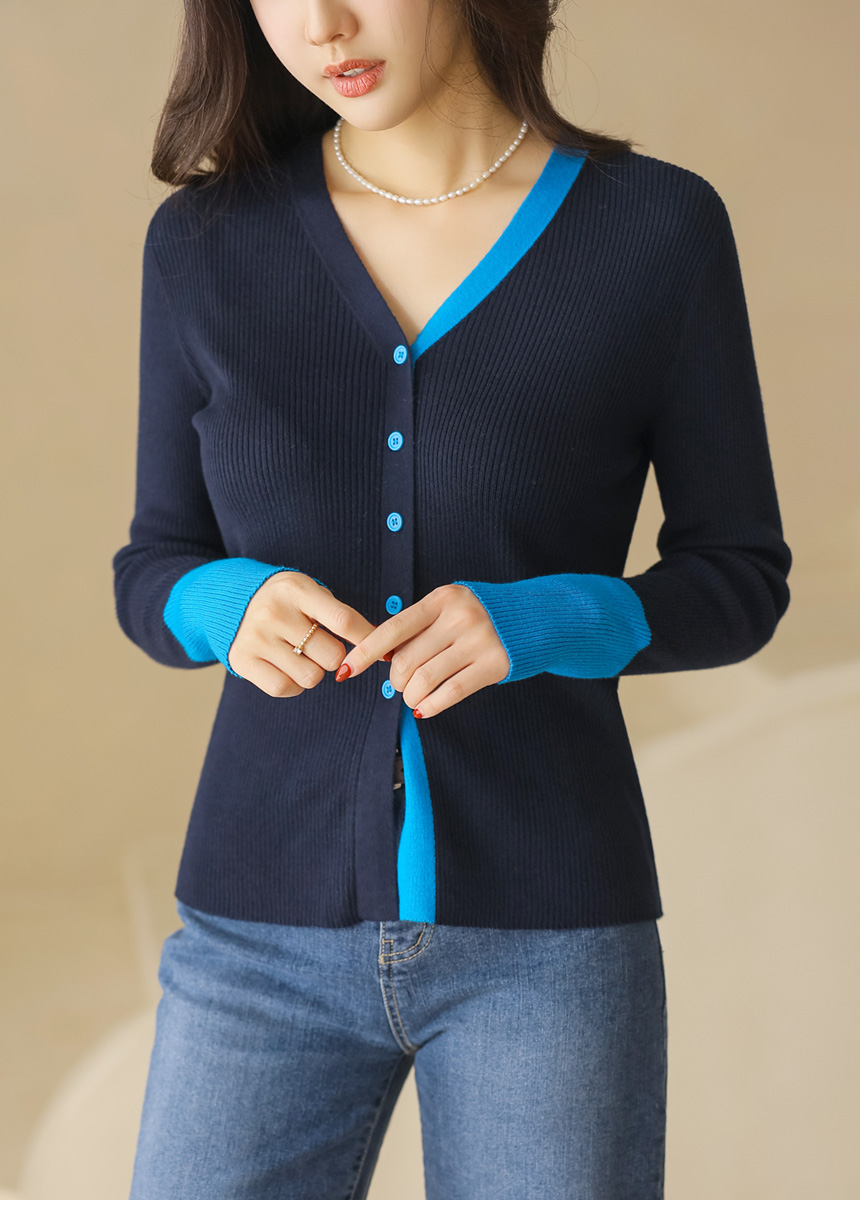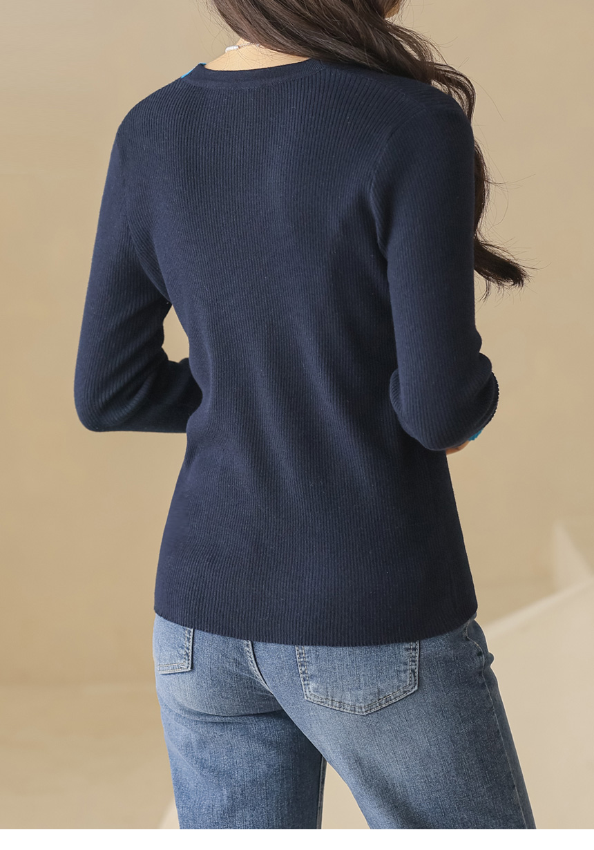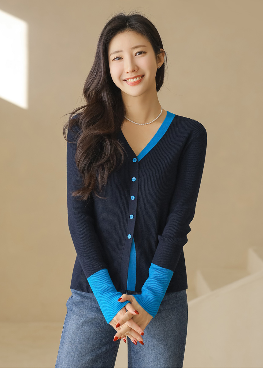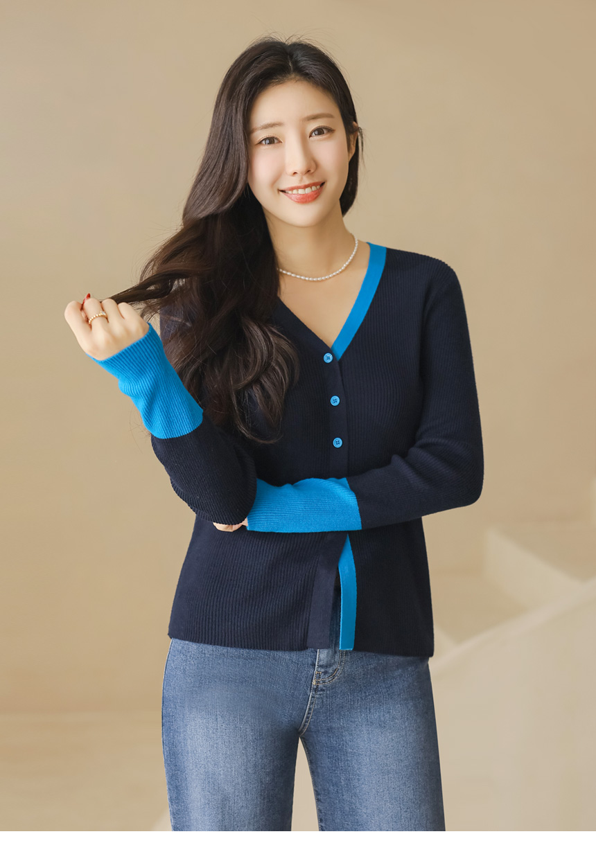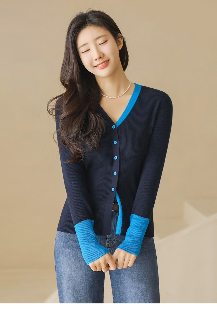 소매와 넥라인, 버튼라인에 배색 디테일을 더해