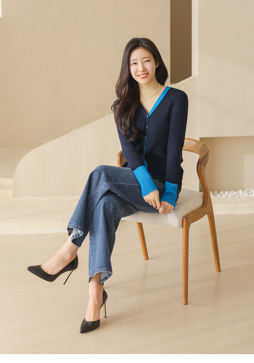 브이넥 라인으로 목선을 길고 가늘어 보이게 연출해주며