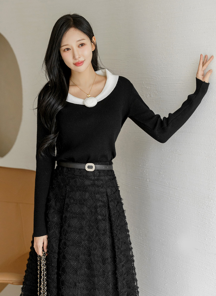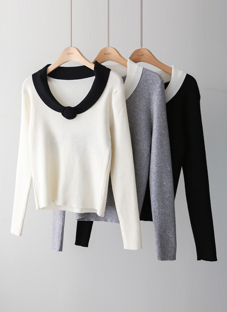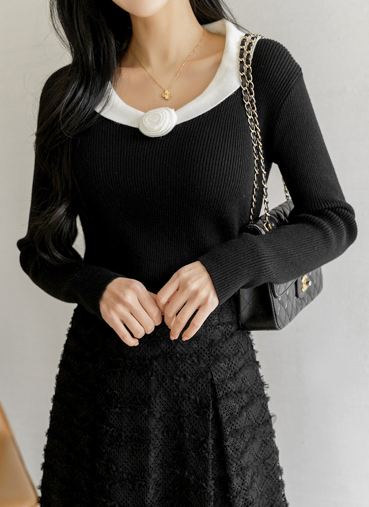 フラワーコサージュ付き ショールカラー配色ニットトップス nt44296