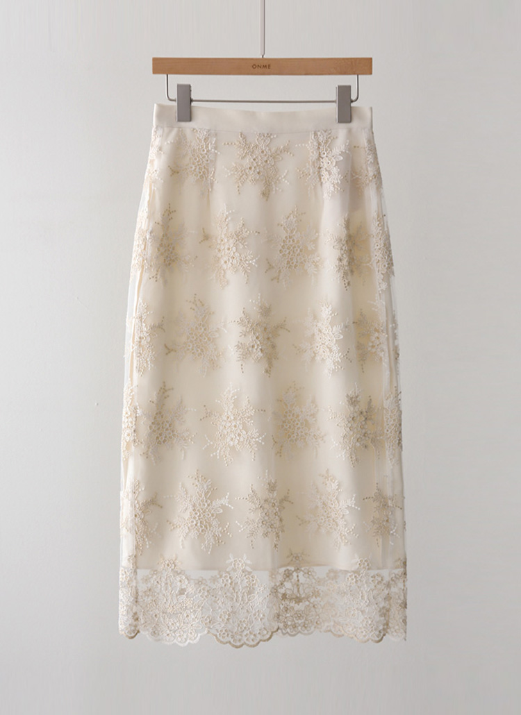 ゴールドラメ入り フラワーレース刺繍 ミディスカート sk44329