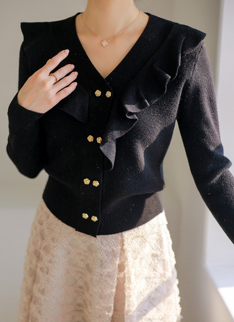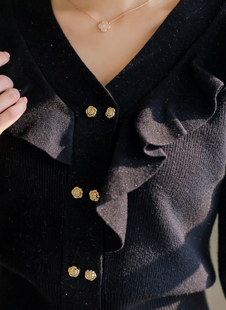 ゴールドフラワーボタン フリル Vネックニットカーディガン cd44422
