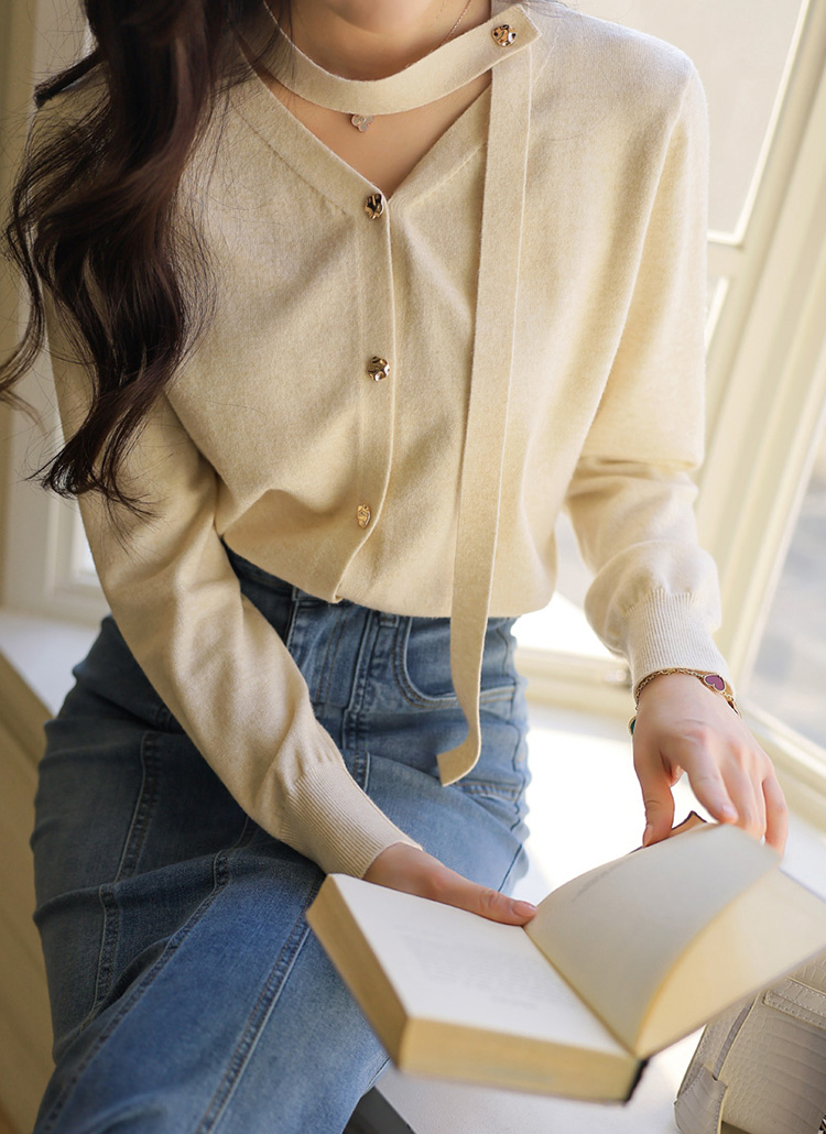 넥 라인을 따라 자연스럽게 이어진 리본 디테일이