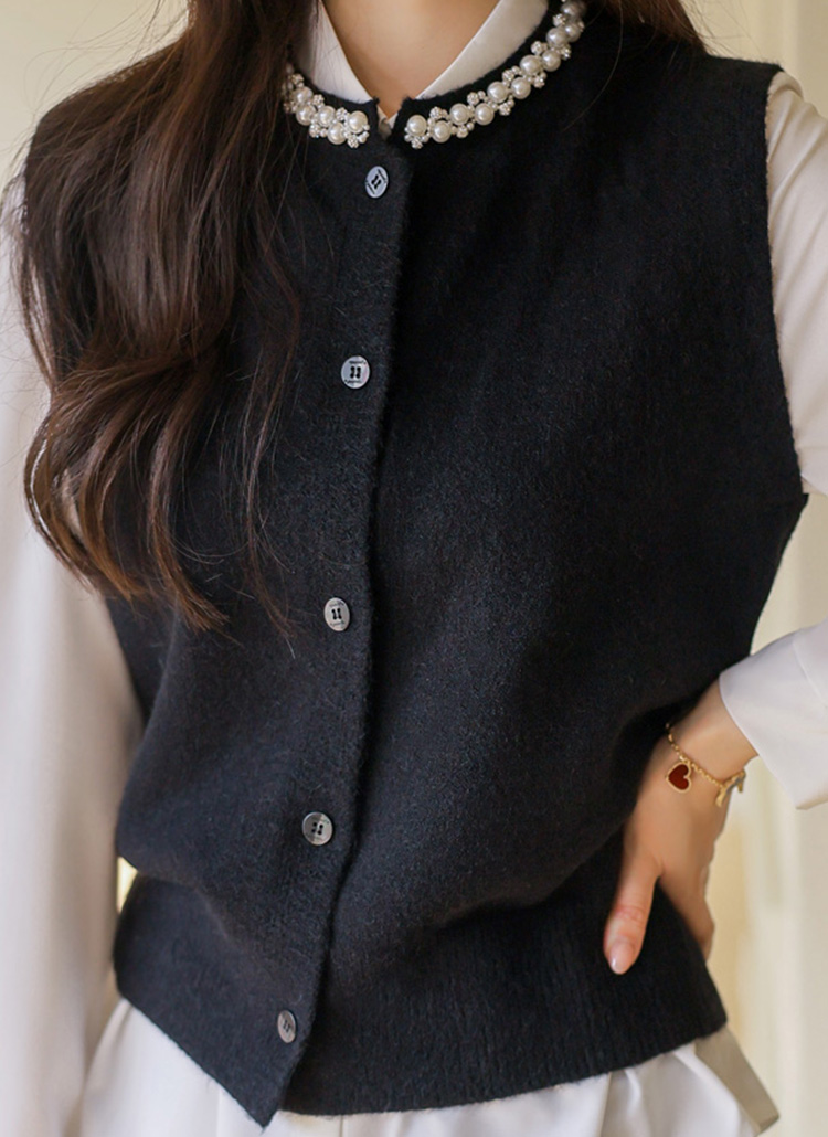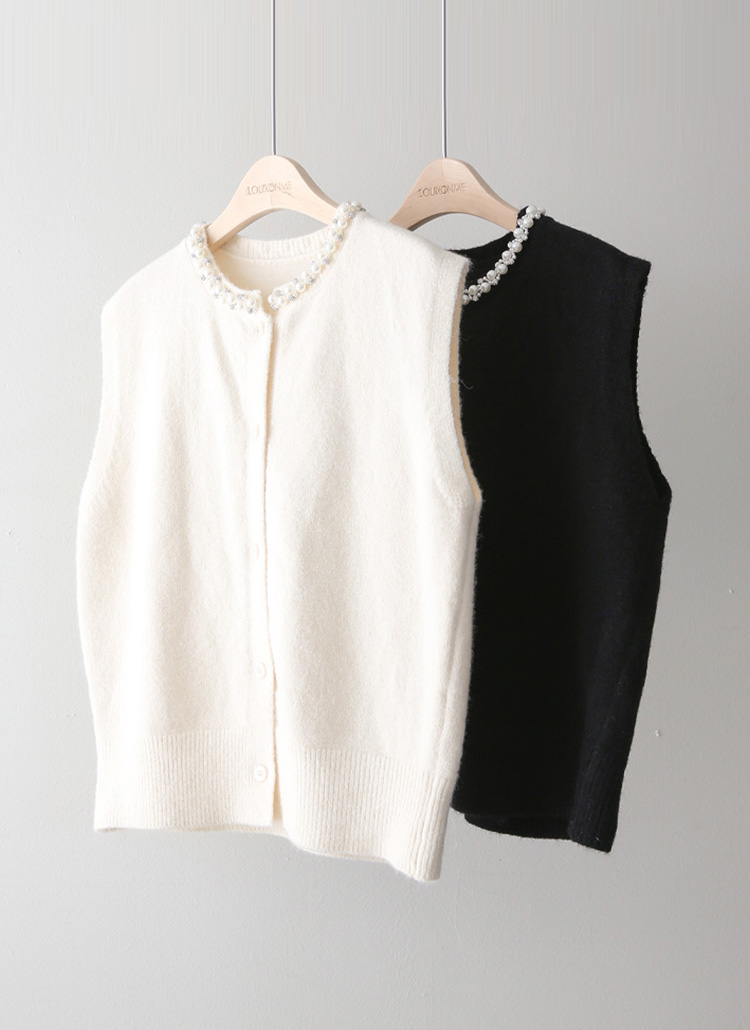넥 라인을 따라 섬세하게 더해진 진주와 큐빅 장식이