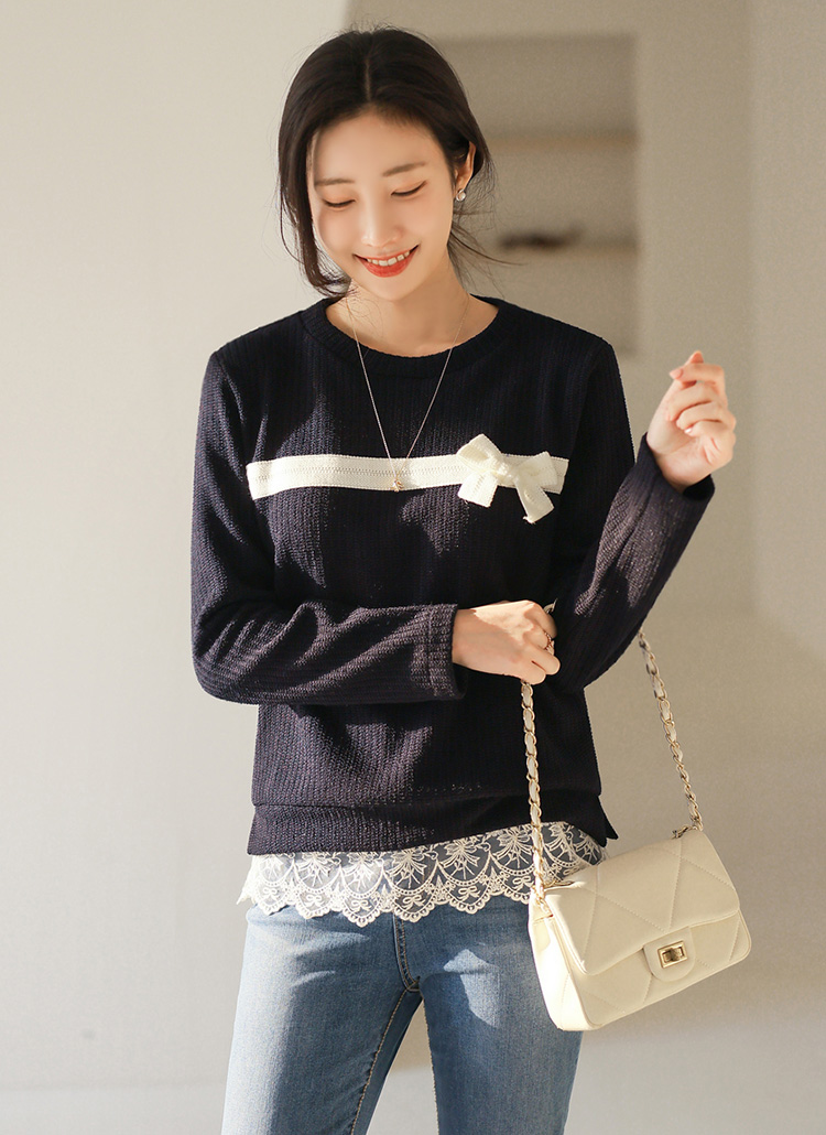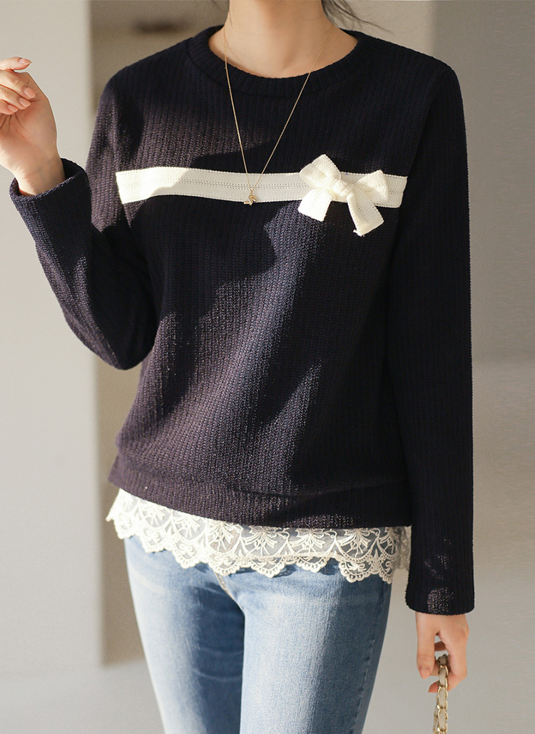 베이직한 니트 바디에 밑단 레이스를 배색해