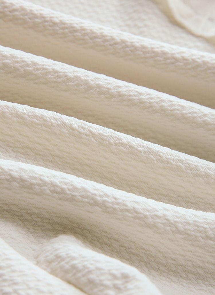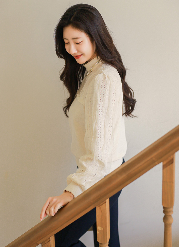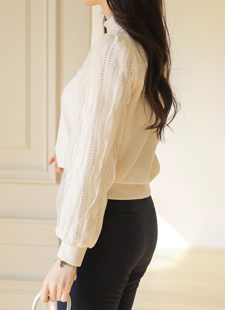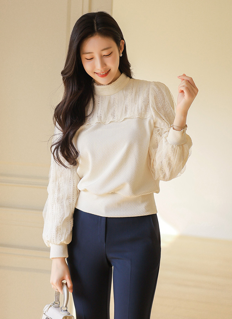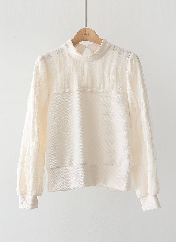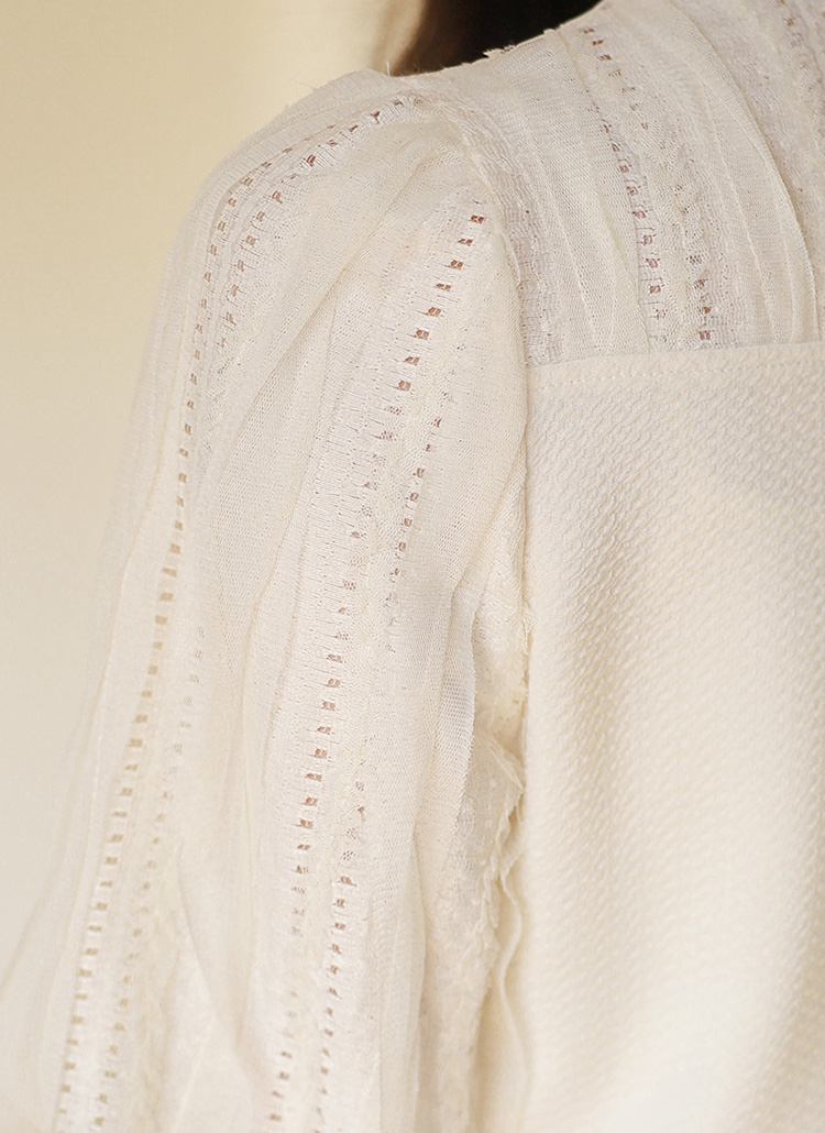 어깨에서 소매로 이어지는 프릴 레이스 배색 디테일이
