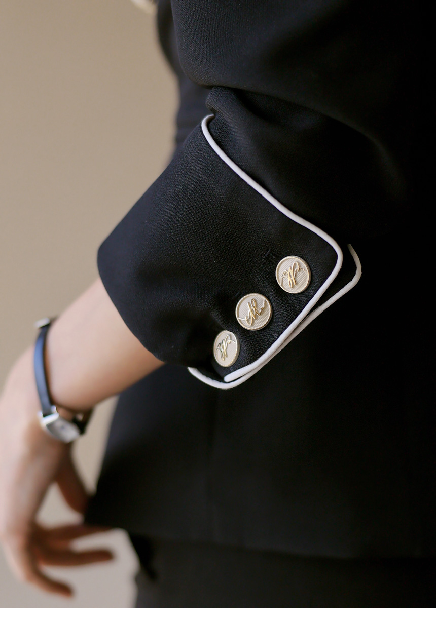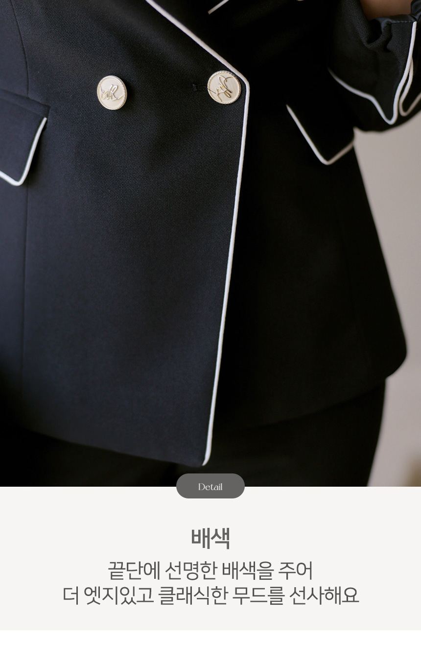 자켓 끝단에 더해진 배색 라인 디테일은