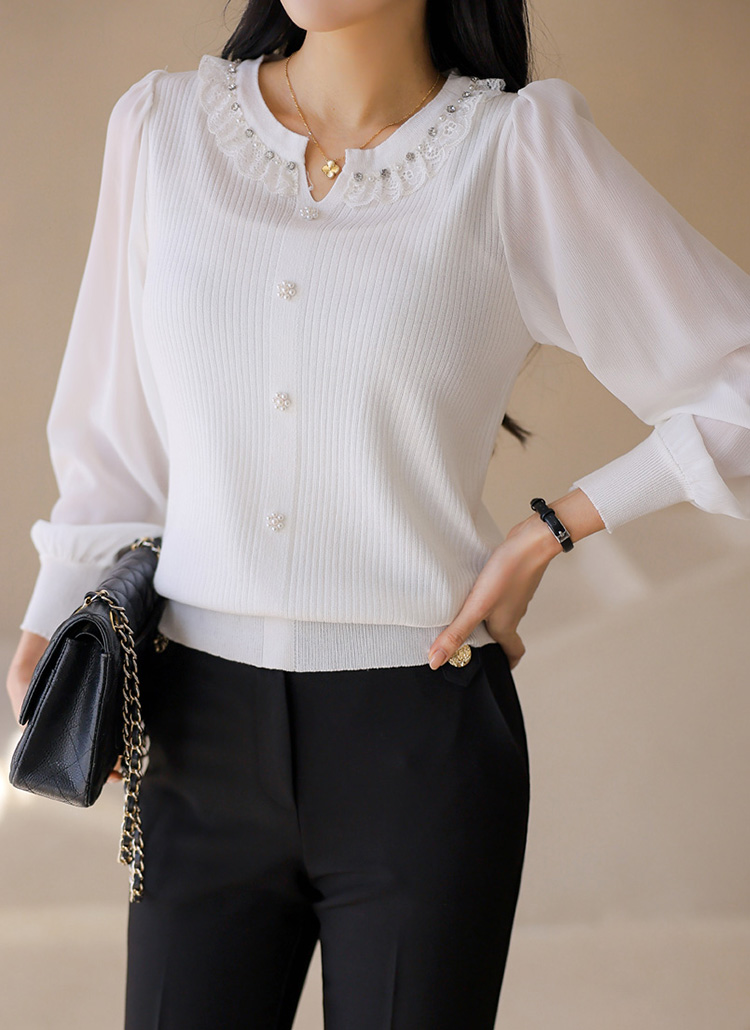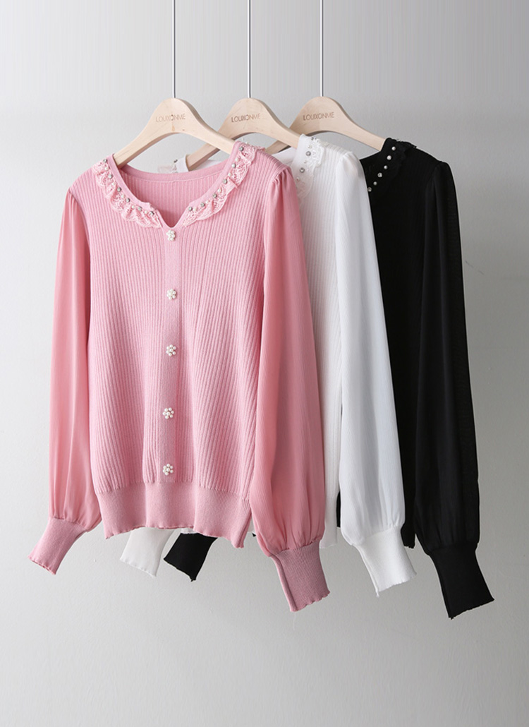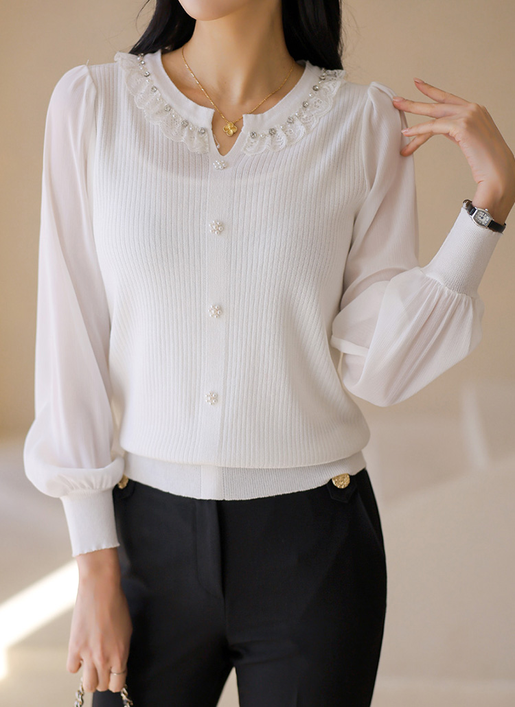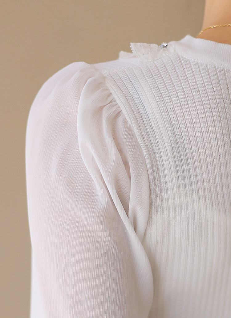 소매 부분은 쉬폰 소재로 배색되어 가볍고 여리여리한 실루엣을 연출하며