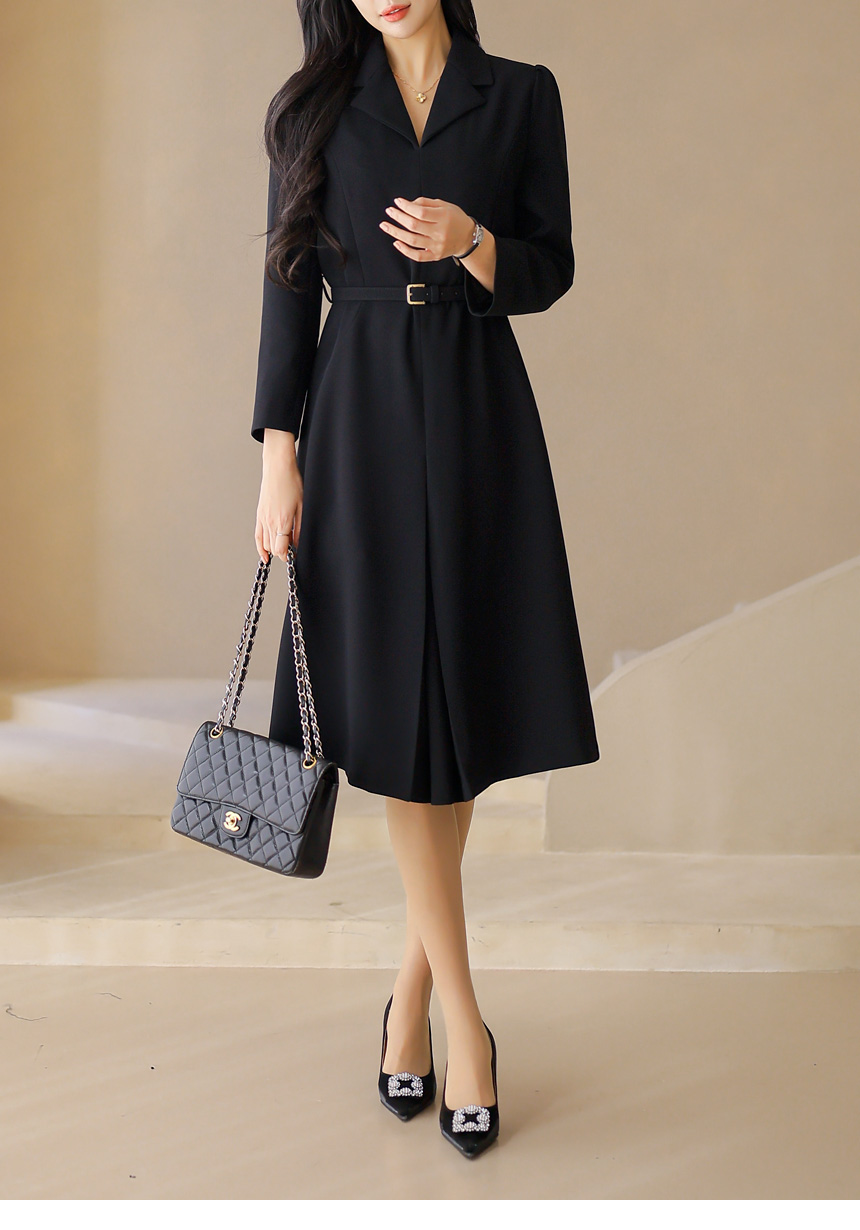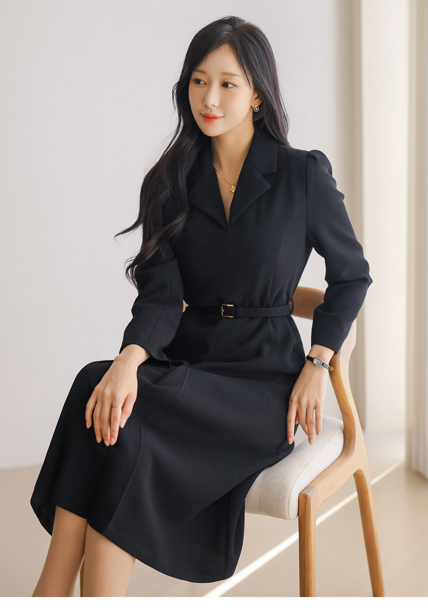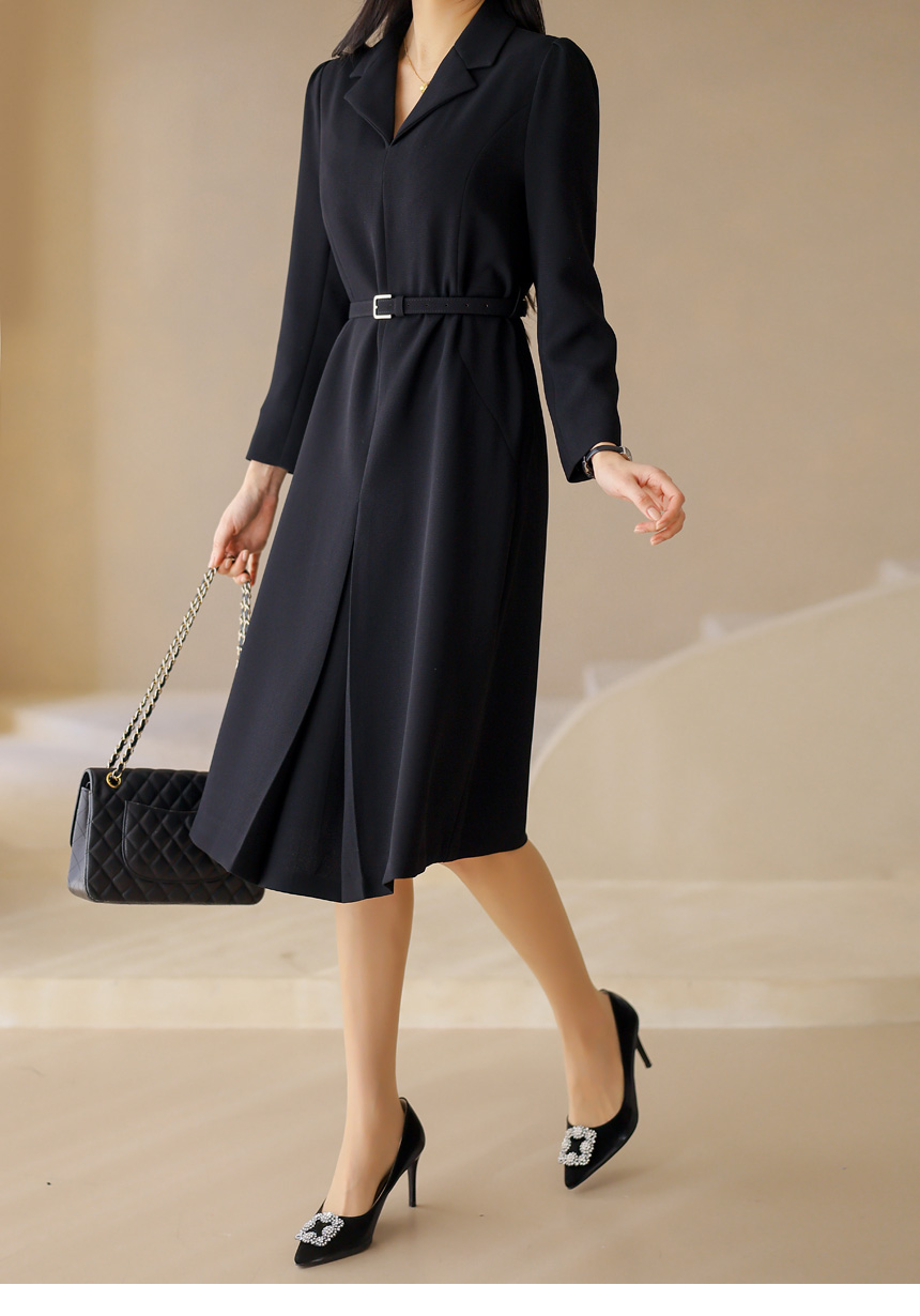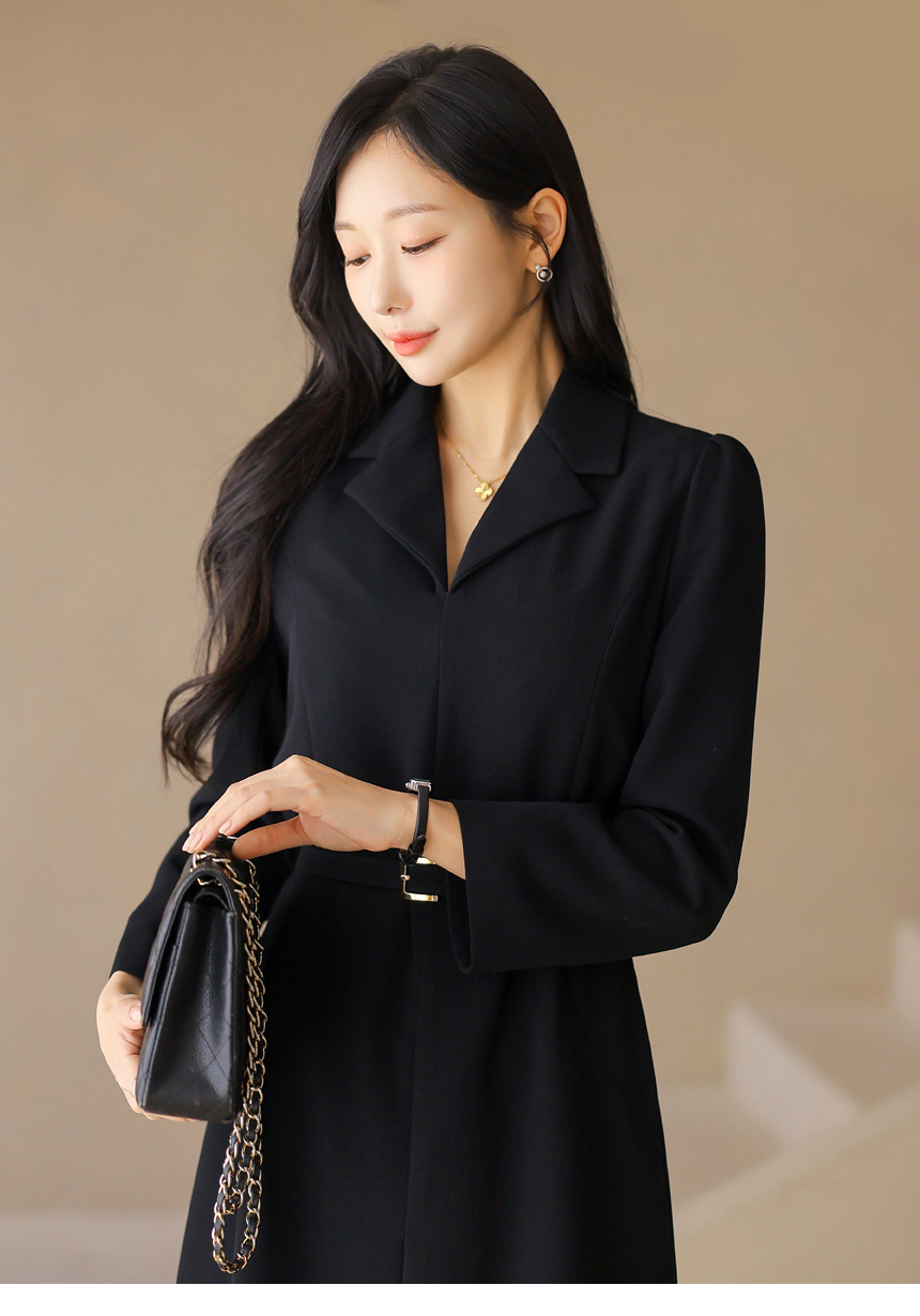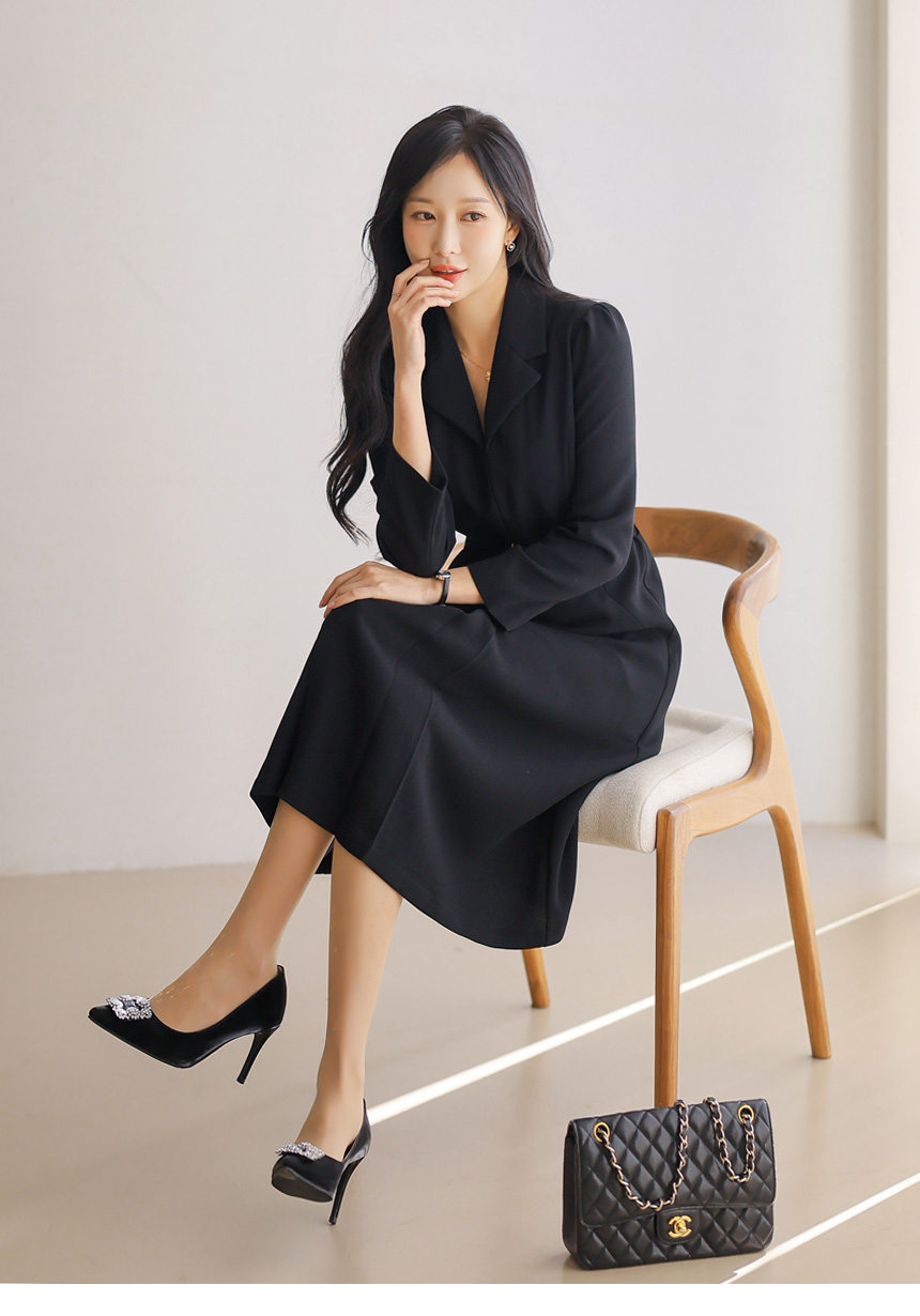 단정하고 세련된 분위기가 돋보이는 클래식 미디 블랙 원피스에요