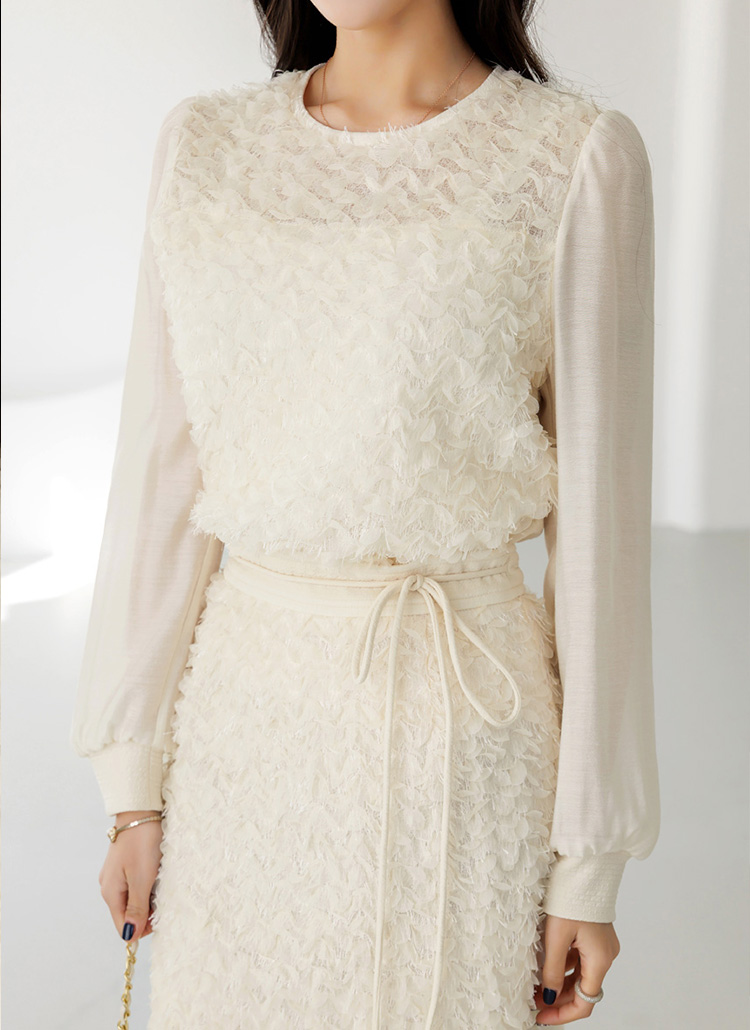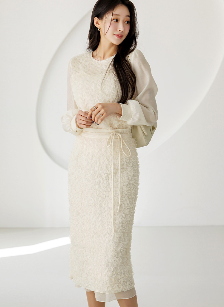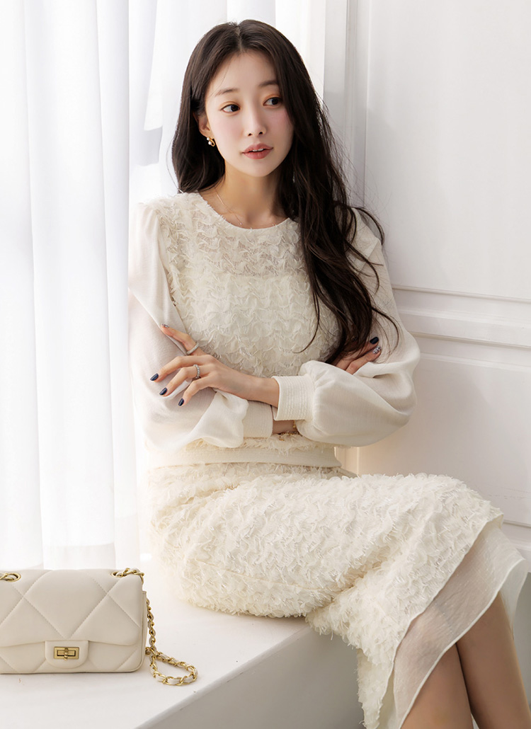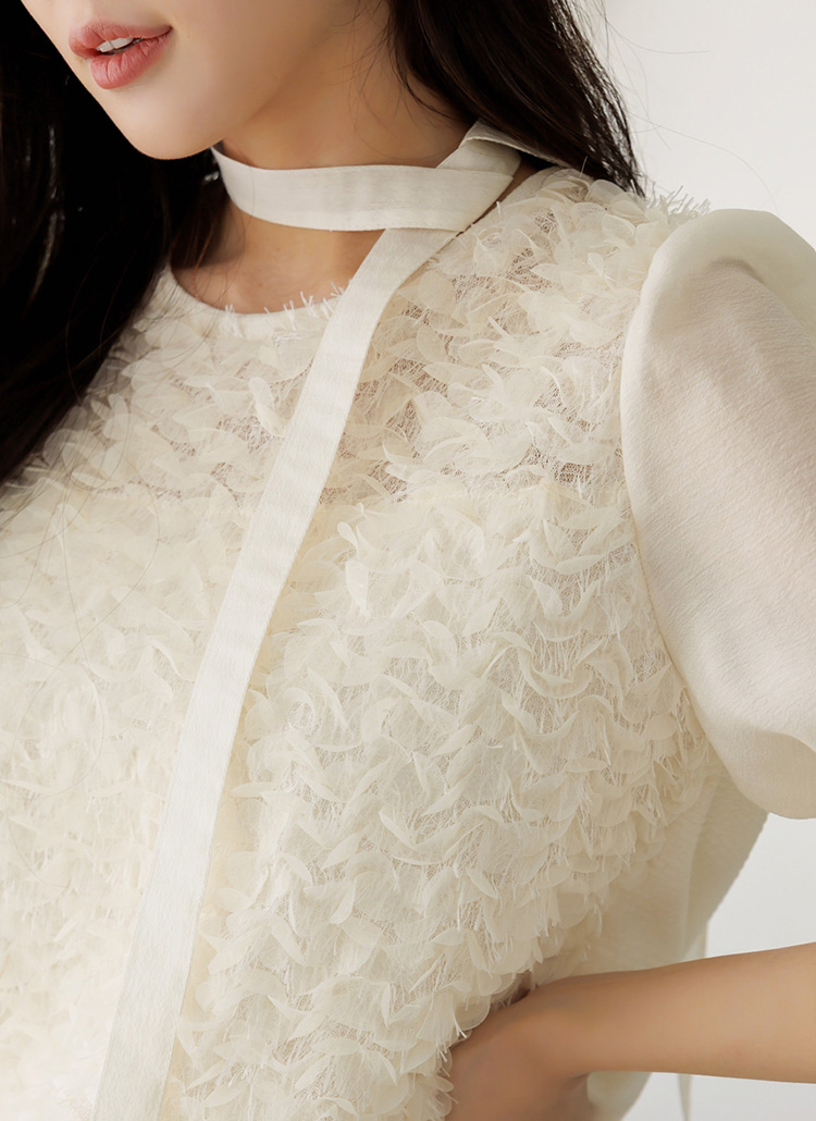 화사한 입체 텍스쳐와 여리한 쉬폰 디테일이 어우러져