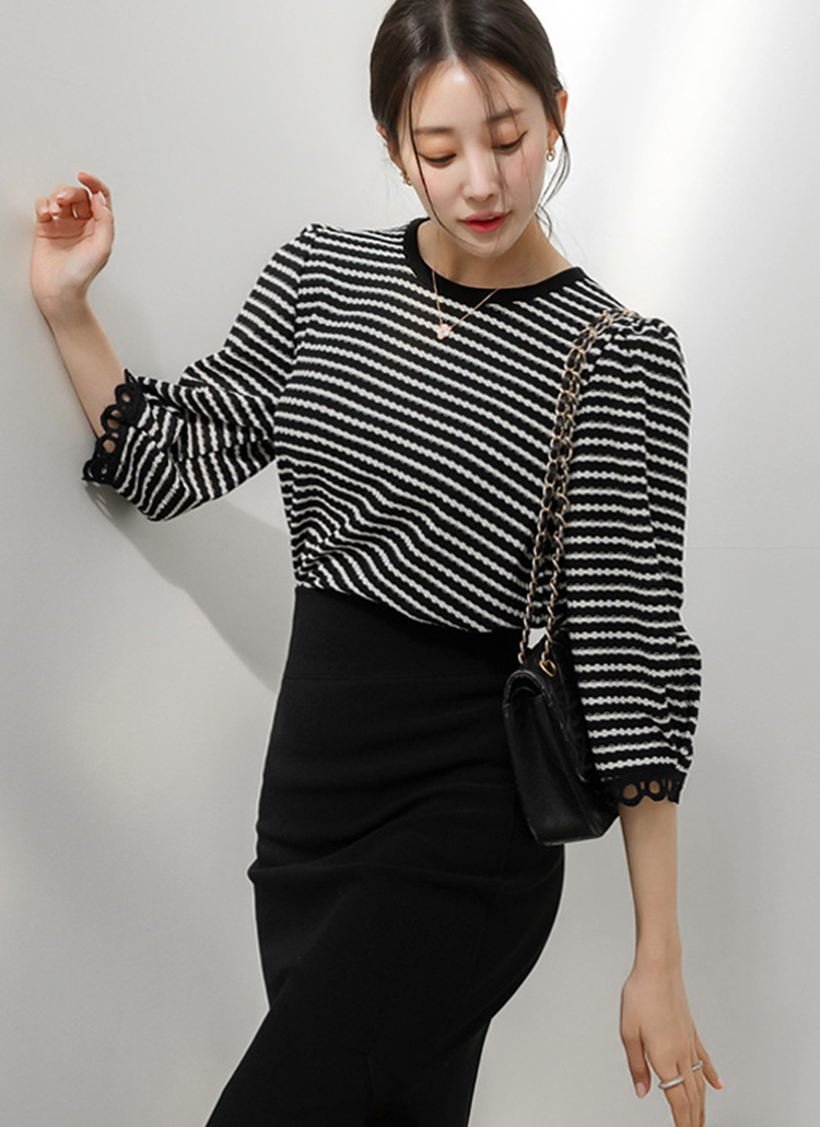 レース付き 7分袖 ボーダージャガードプルオーバー ts44797