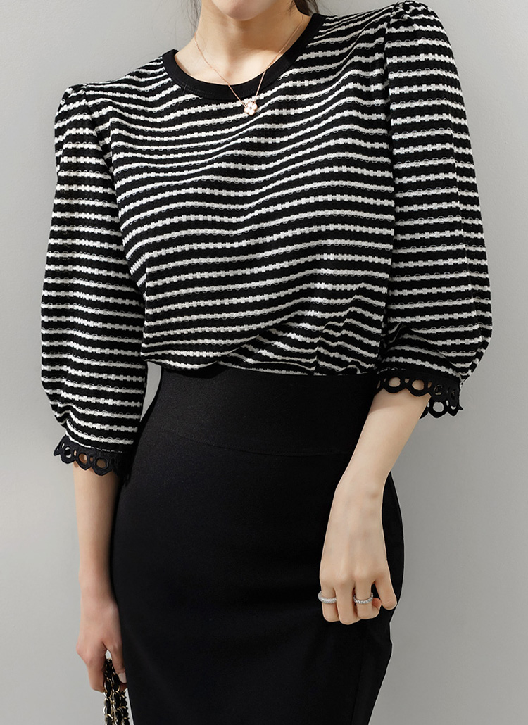 은은하게 고급스러운 분위기를 전해주는 쟈가드 스트라이프 7부 소매 티셔츠에요
