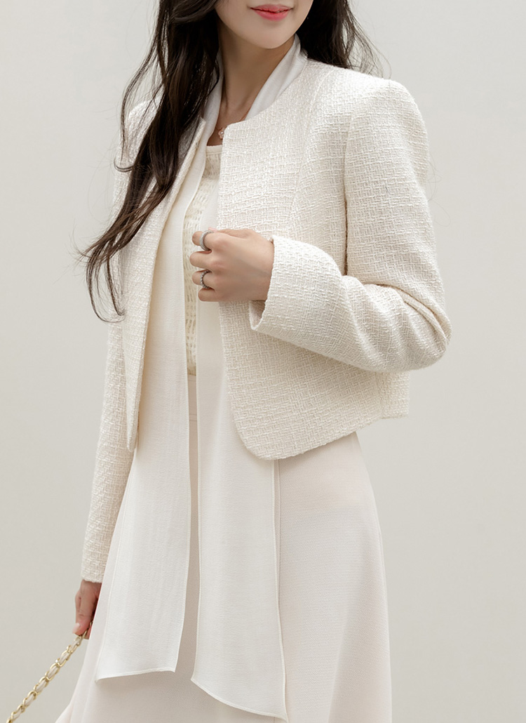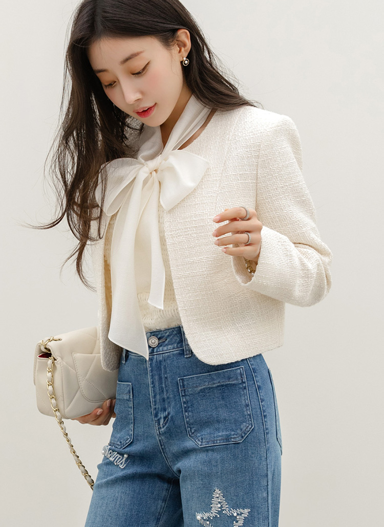 [LouisAngel] スカーフ付き ラウンドヘム ノーカラーラメツイードジャケット jk44839
