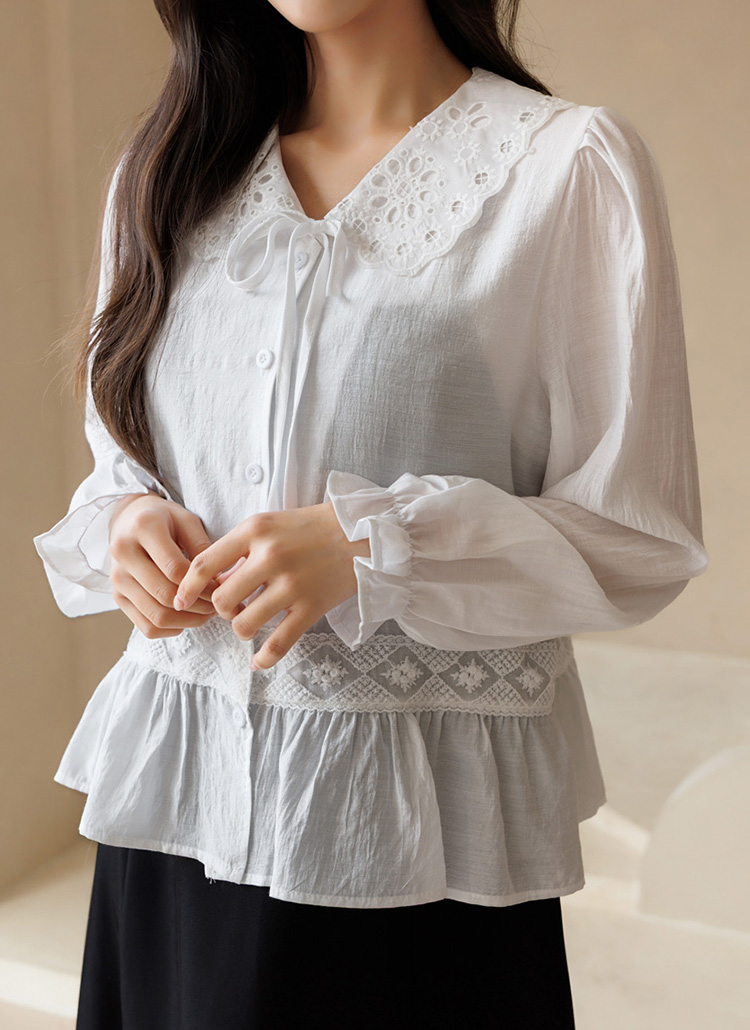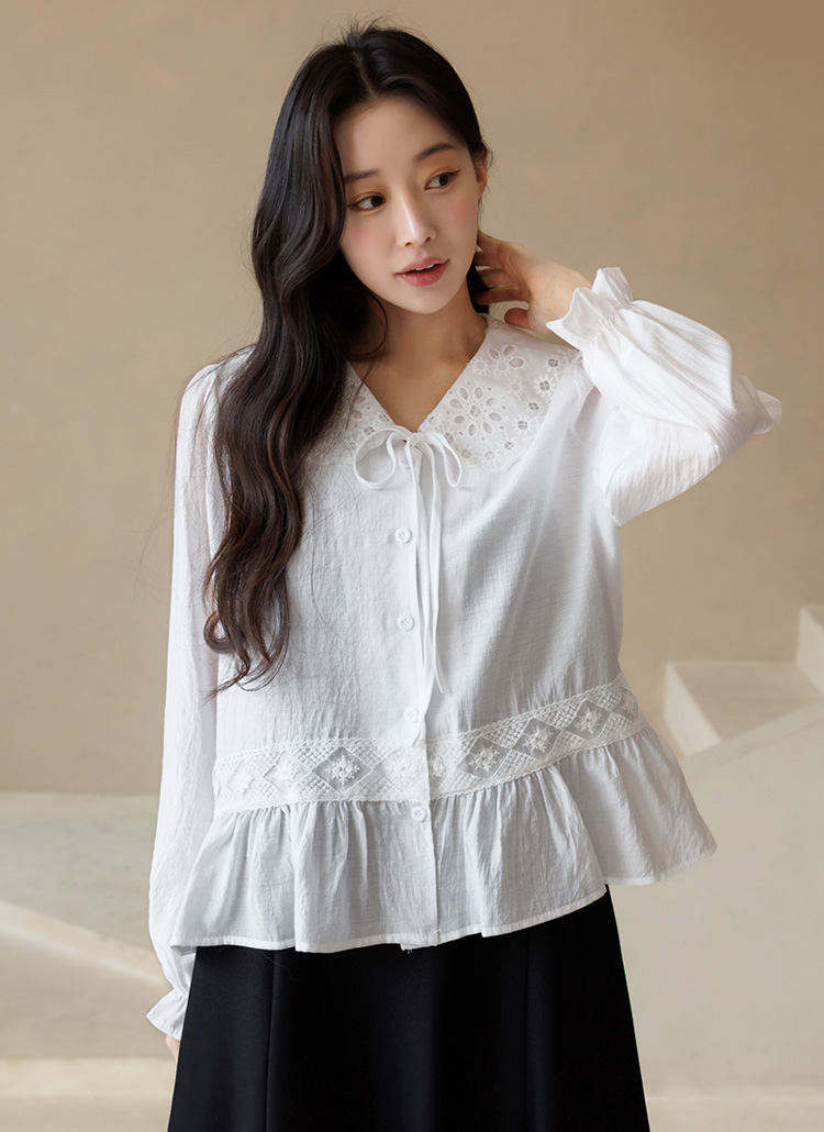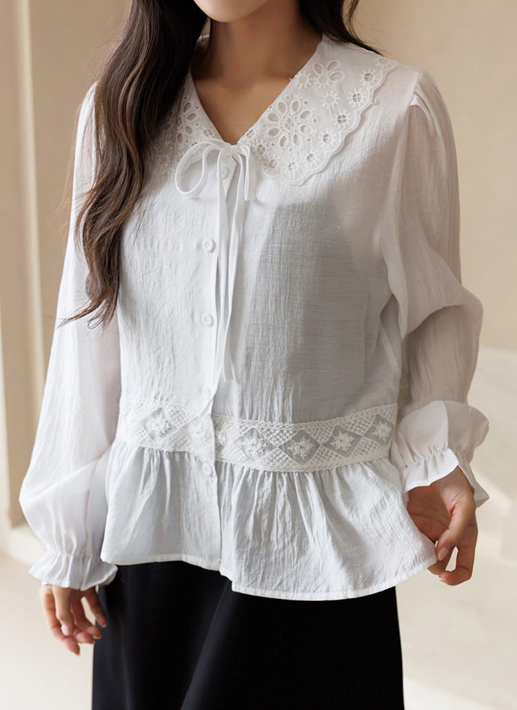 [Theonme] 러블리 레이스 카라 리본 밑단 프릴 거즈면 블라우스