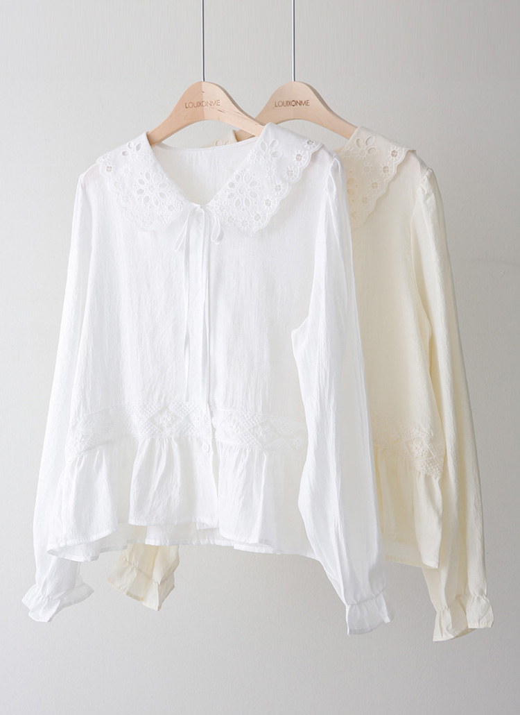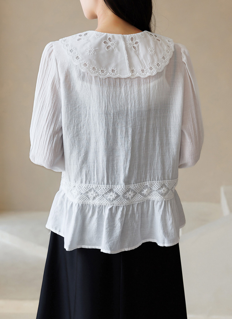 입는 순간 기분까지 화사해지는 레이스 카라 거즈면 블라우스예요