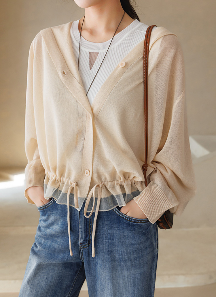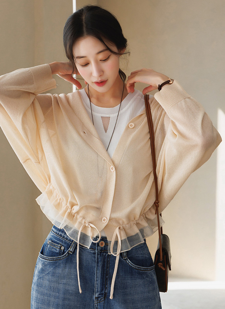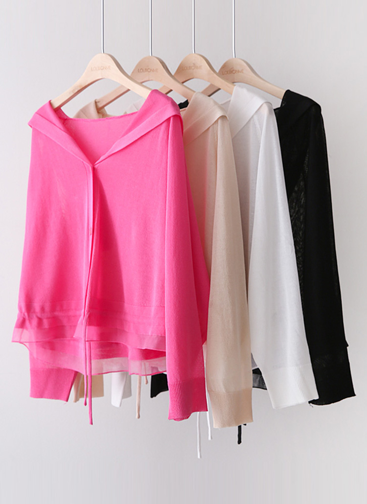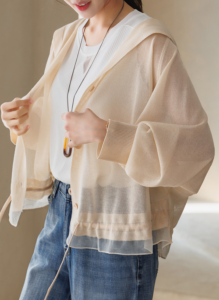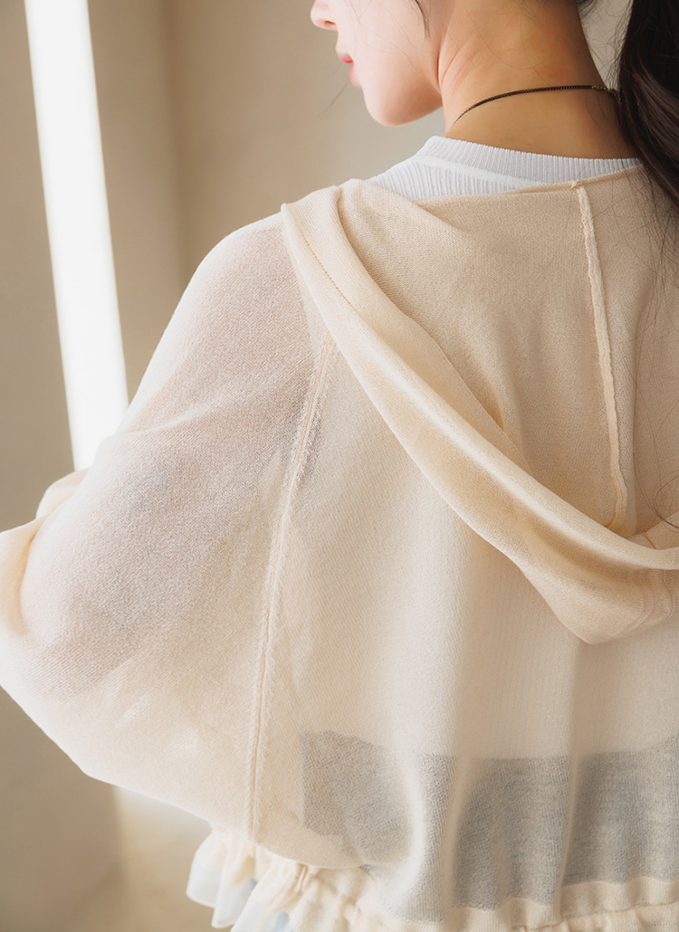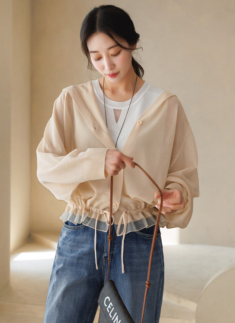 [Theonme] 루루아 밑단 스트링 셔링라인 시스루 니트 후드 가디건