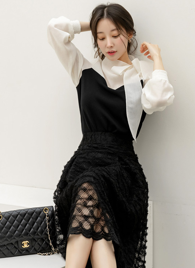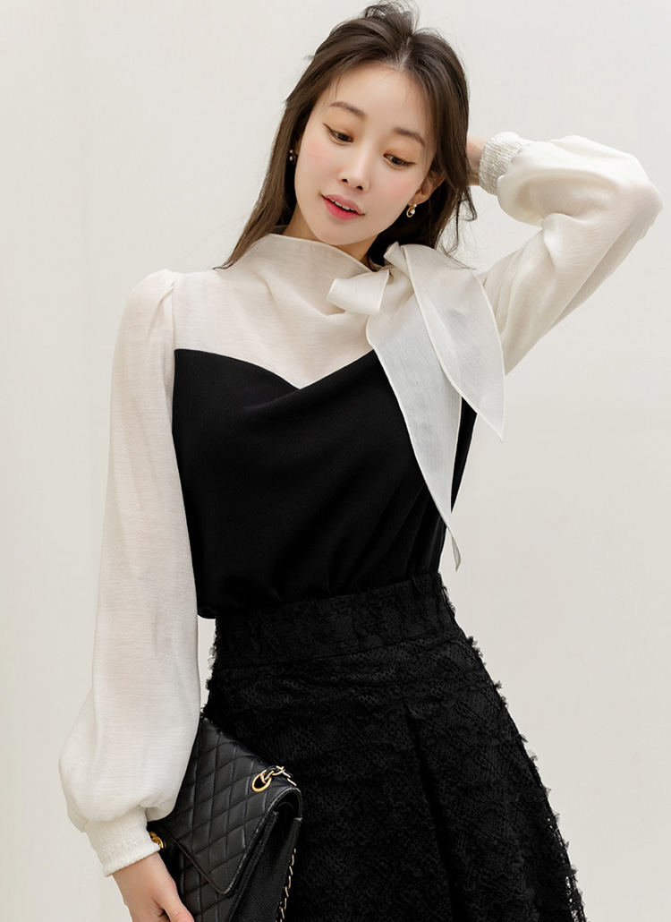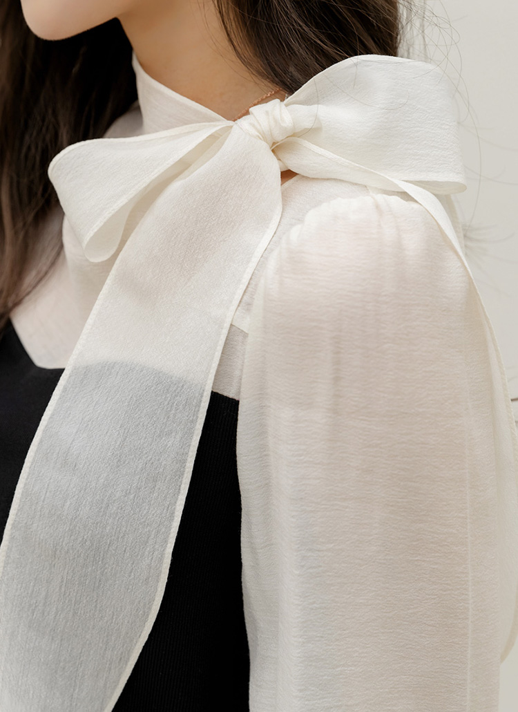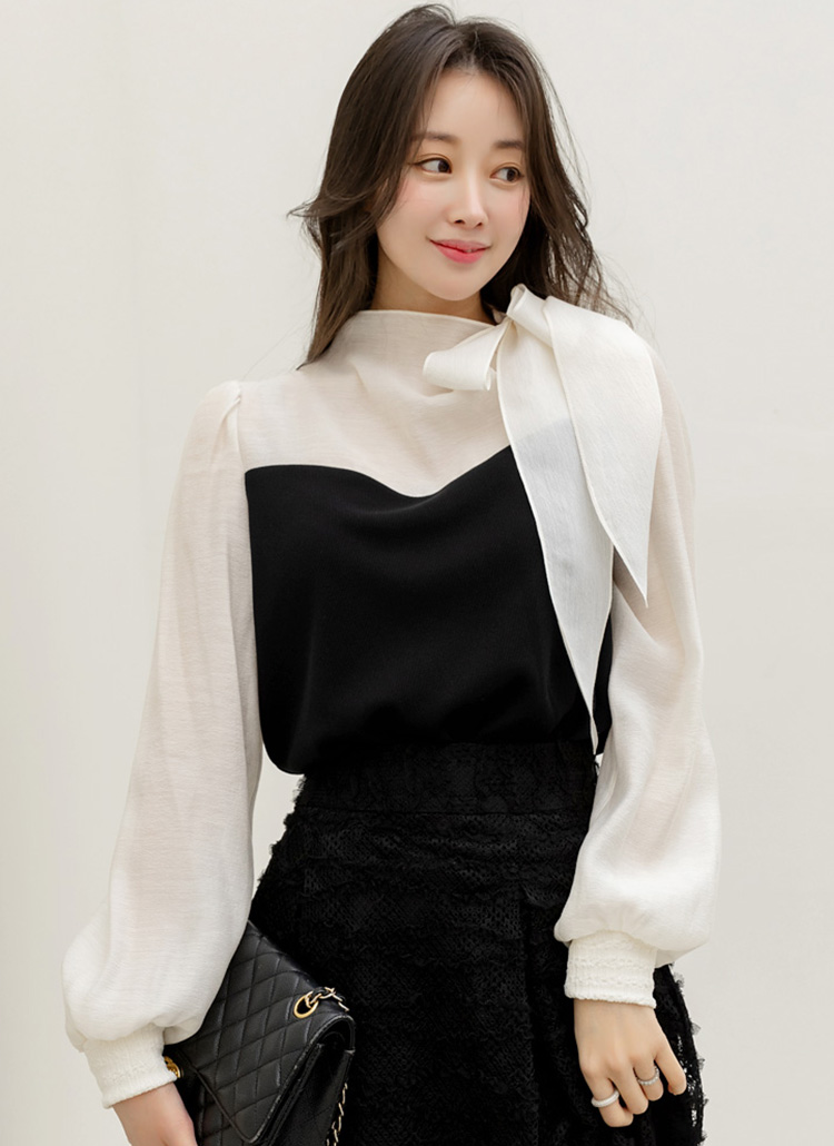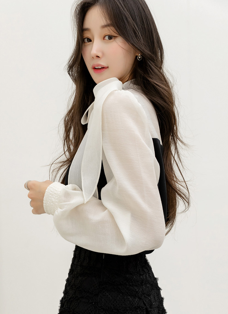 [LouisAngel] 레어블 하트라인 배색 시스루 소매 리본 넥 블루종 블라우스