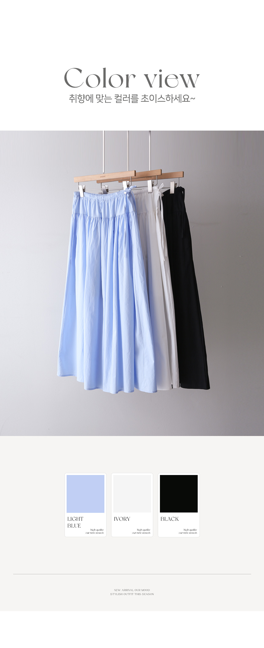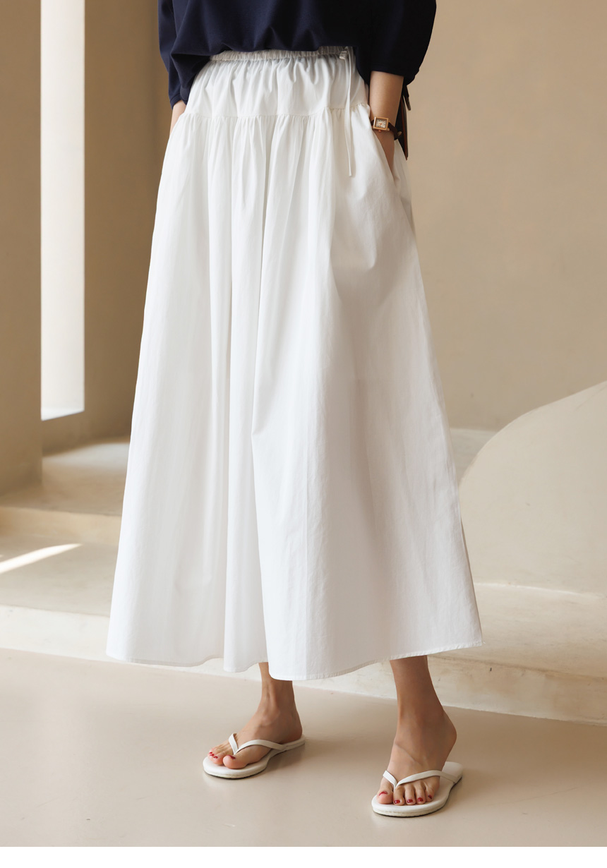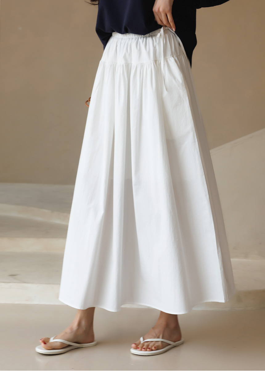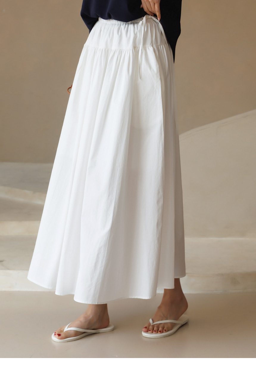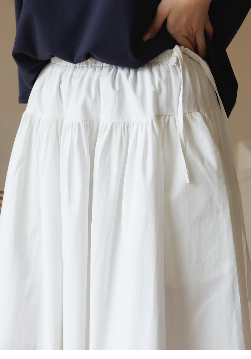 [Theonme] 플레온 허리 스트링 리본 셔링 A라인 플레어 면 롱 스커트