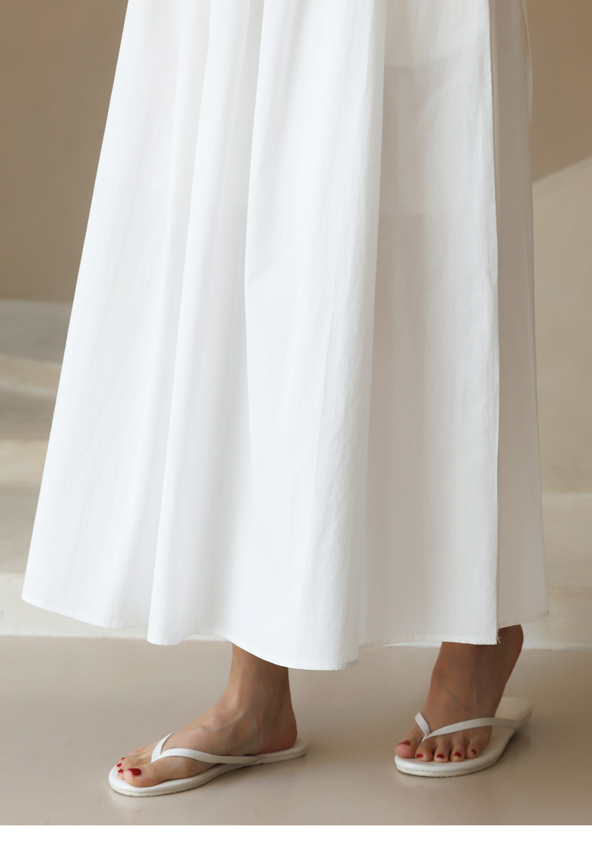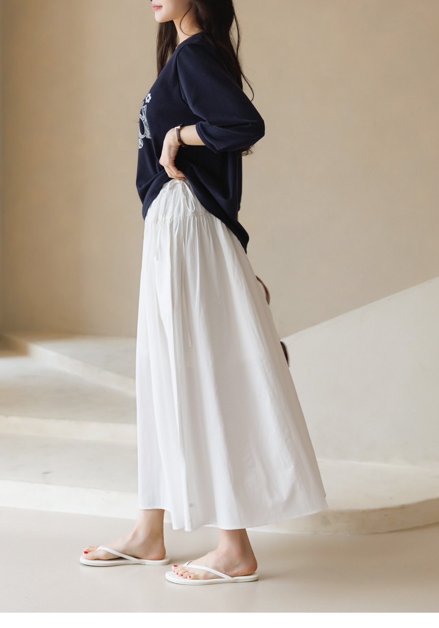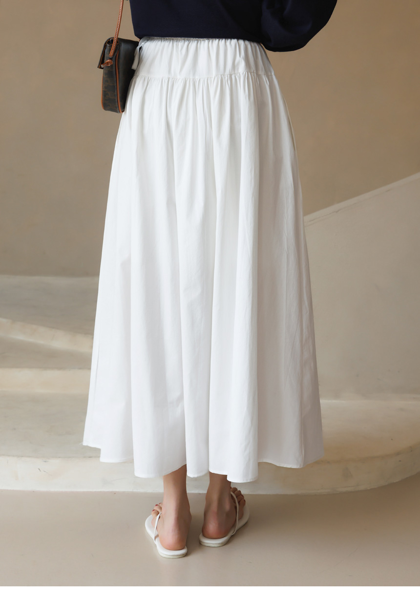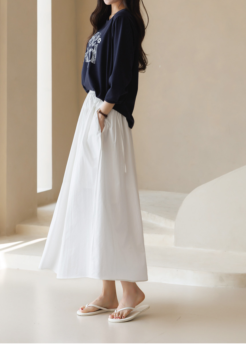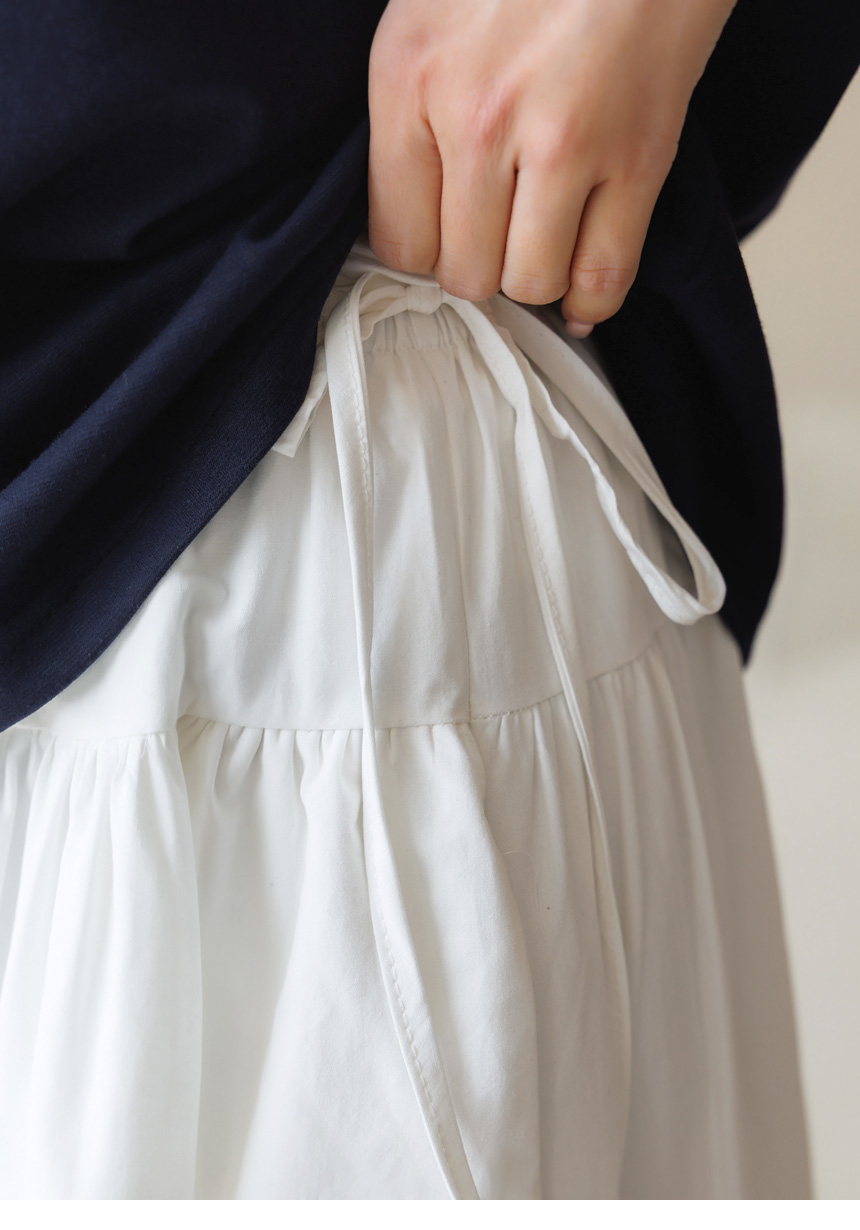 [Theonme] 플레온 허리 스트링 리본 셔링 A라인 플레어 면 롱 스커트